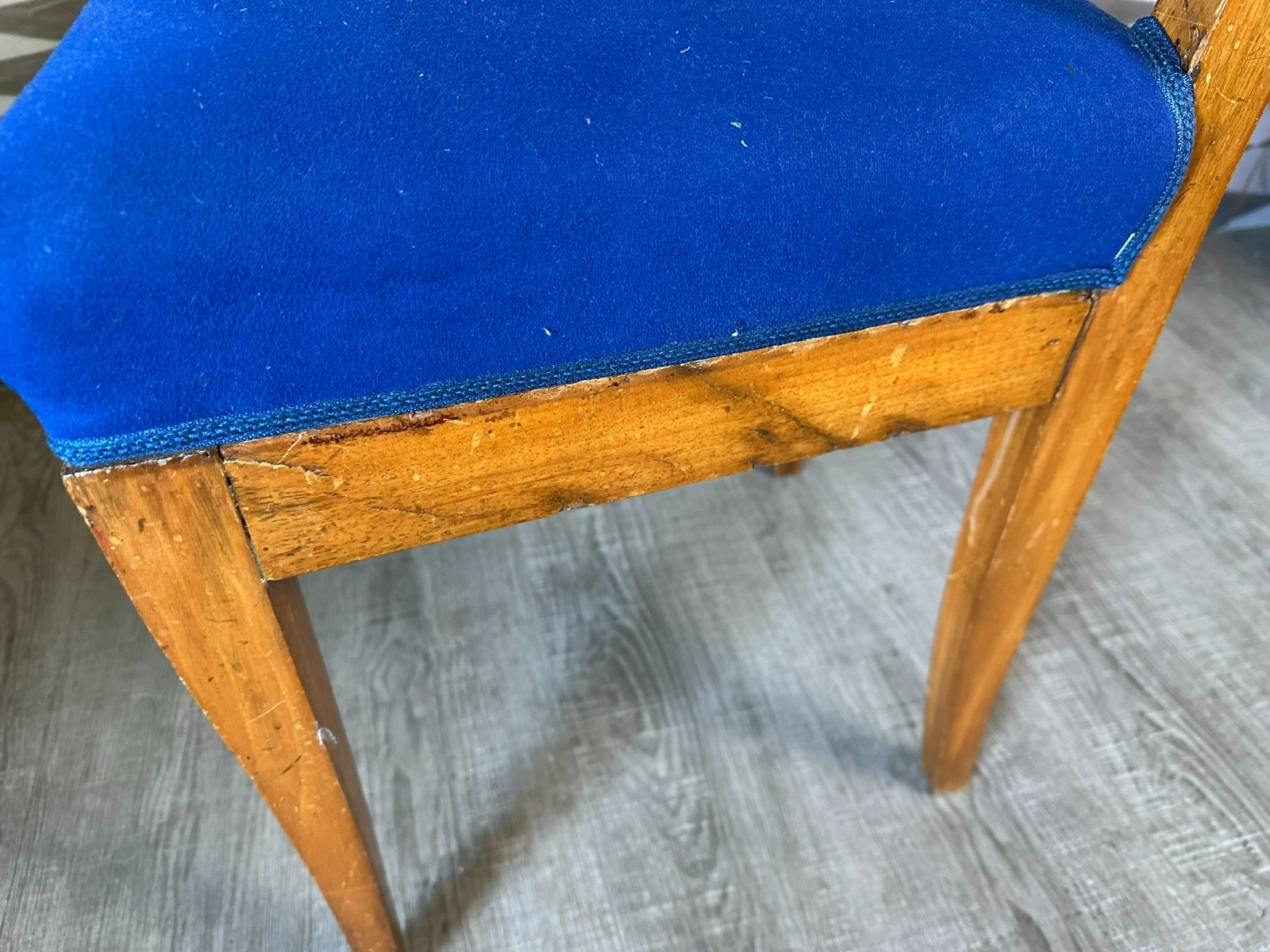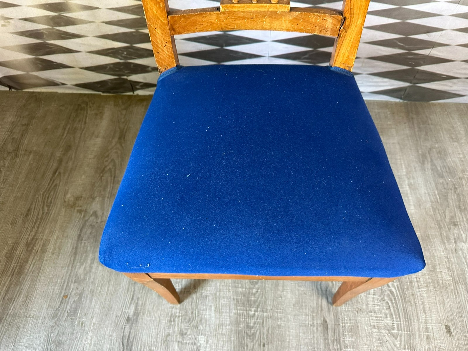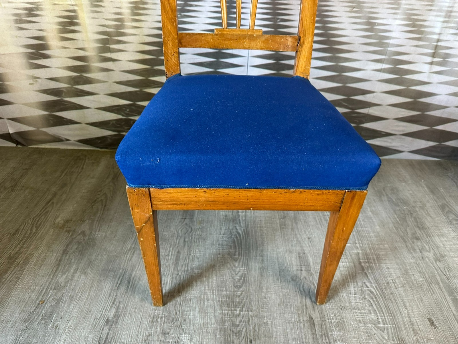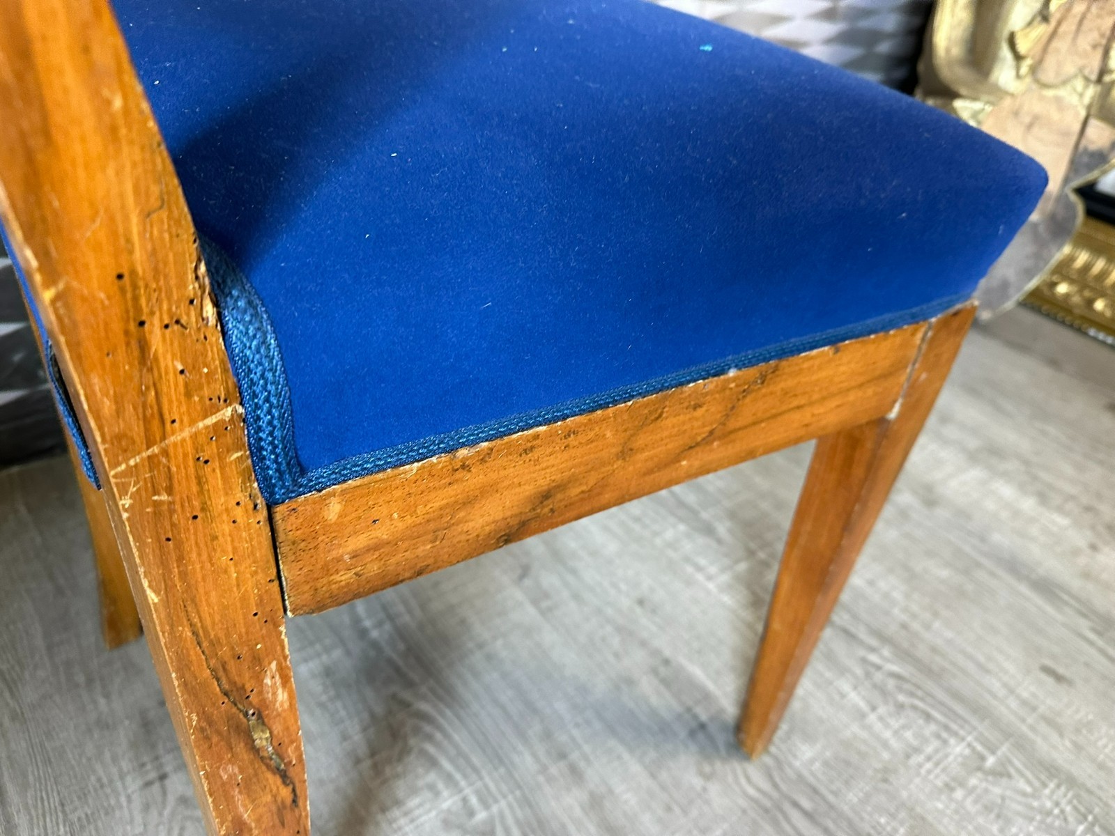 Antiker Biedermeier Stuhl, erste Hälfte 19-tes Jhdt, das Gestell befindet sich im unrestaurierten Zustand, lediglich das Polster wurde mal ersetzt. Am Gestell Abrieb, ganz leichter alter inaktiver Wurmfrass, oberste linke Ecke zum Teil unvollständig und leicht abstehendes Furnier. Der Stuhl wird ausdrücklich als Restaurationsobjekt angeboten, dieser ist leicht in sich wacklig. Die Beine ebenfalls berieben und bestossen.  Abmessungen BTH 46/49/86cm, Sitzhöhe 50cm.