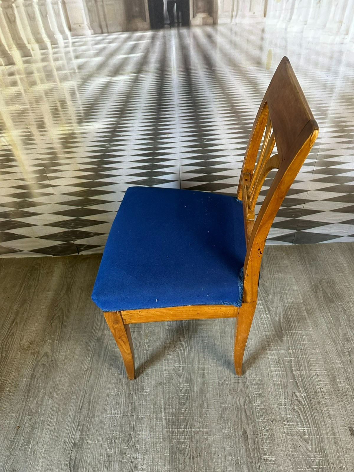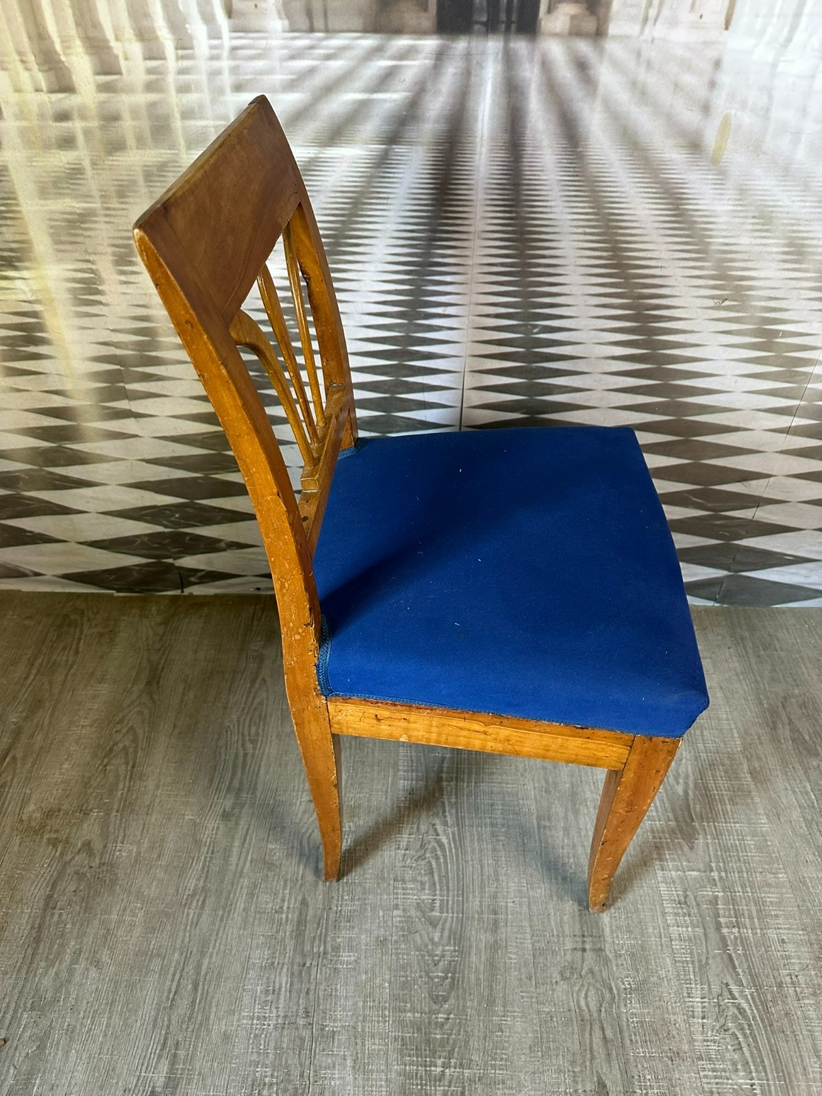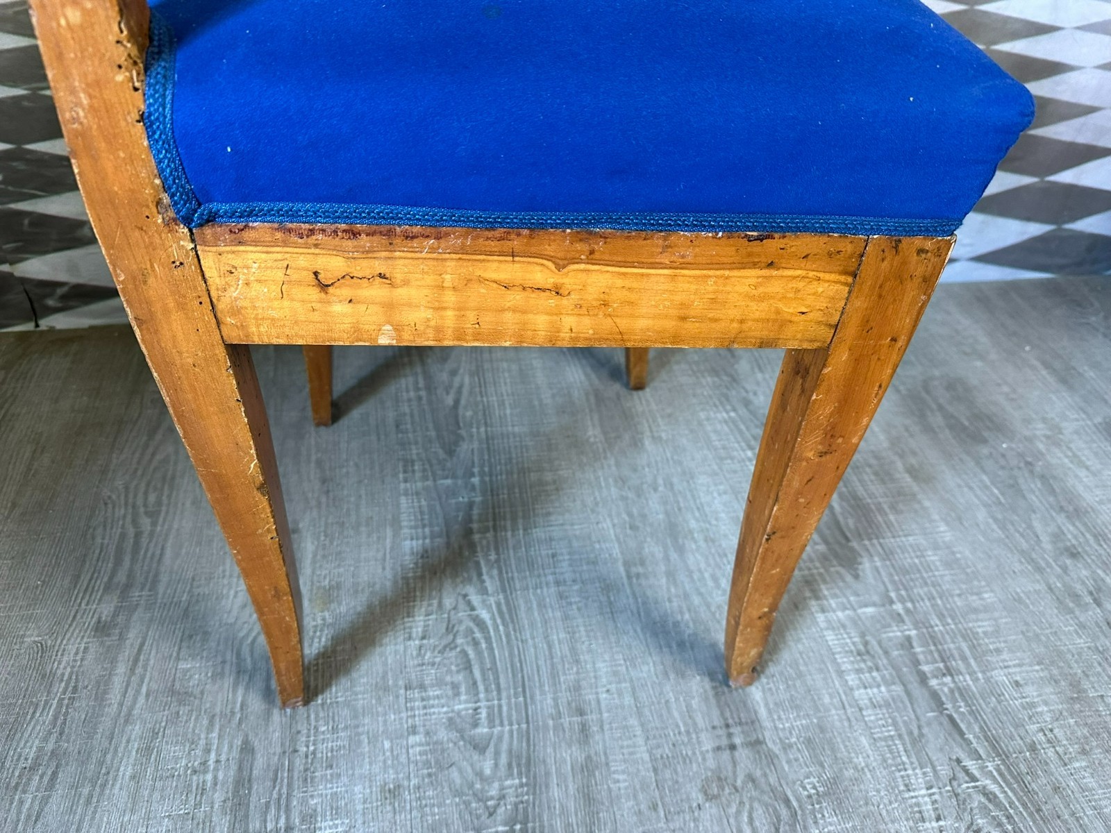 Antiker Biedermeier Stuhl, erste Hälfte 19-tes Jhdt. Das Gestell befindet sich im unrestaurierten Zustand, die Polsterung wurde mal ausgetauscht. Der Stuhl hinkt leicht, an der gesamten Oberfläche Abrieb, leichter inaktiver Wurmfraß, kleinere Bestossungen und Flecken. Obere rechte Ecke leicht bestossen. Abmessungen BTH 45/45/86cm, Sitzhöhe 50cm.