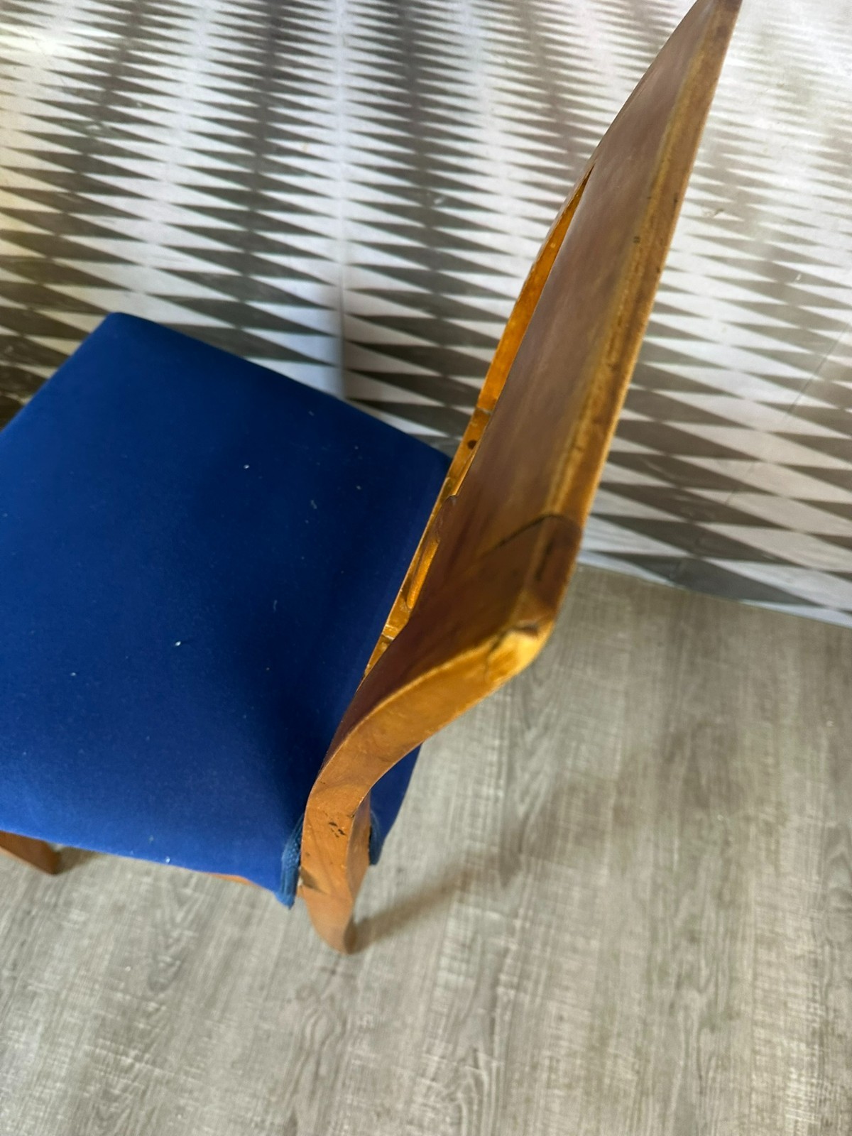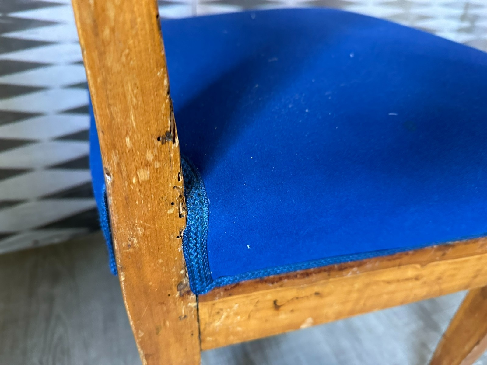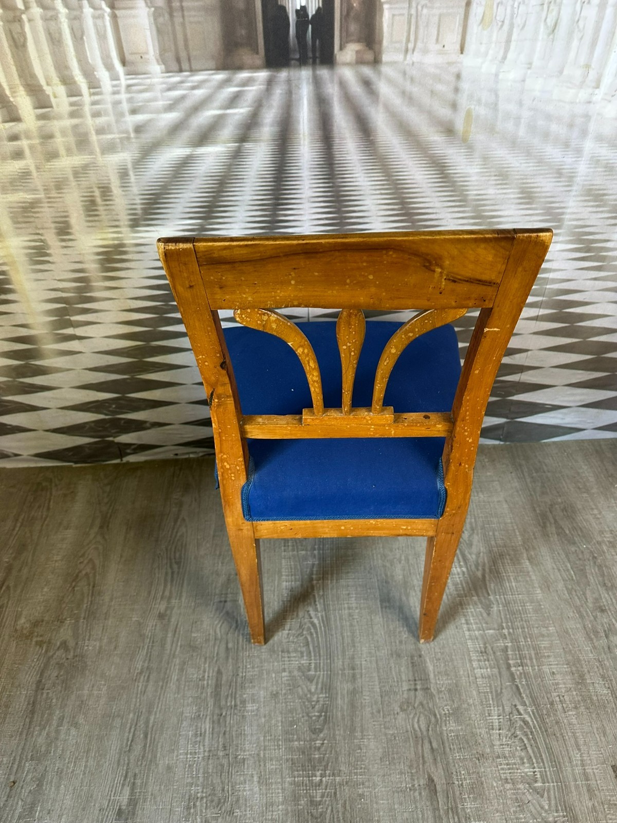 Antiker Biedermeier Stuhl, erste Hälfte 19-tes Jhdt. Das Gestell befindet sich im unrestaurierten Zustand, die Polsterung wurde mal ausgetauscht. Der Stuhl hinkt leicht, an der gesamten Oberfläche Abrieb, leichter inaktiver Wurmfraß, kleinere Bestossungen und Flecken. Obere rechte Ecke leicht bestossen. Abmessungen BTH 45/45/86cm, Sitzhöhe 50cm.