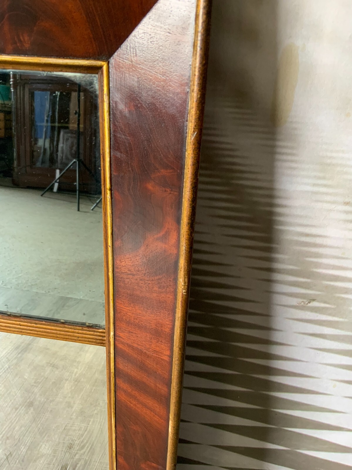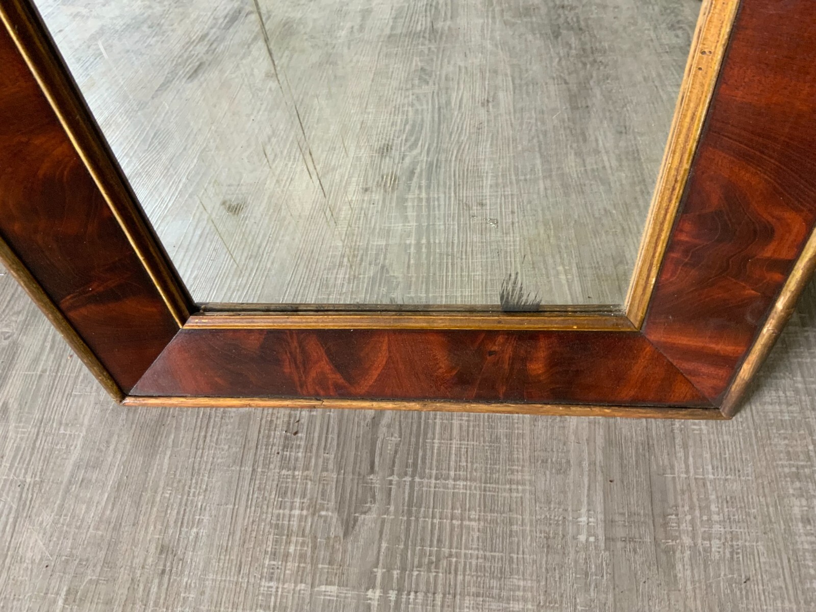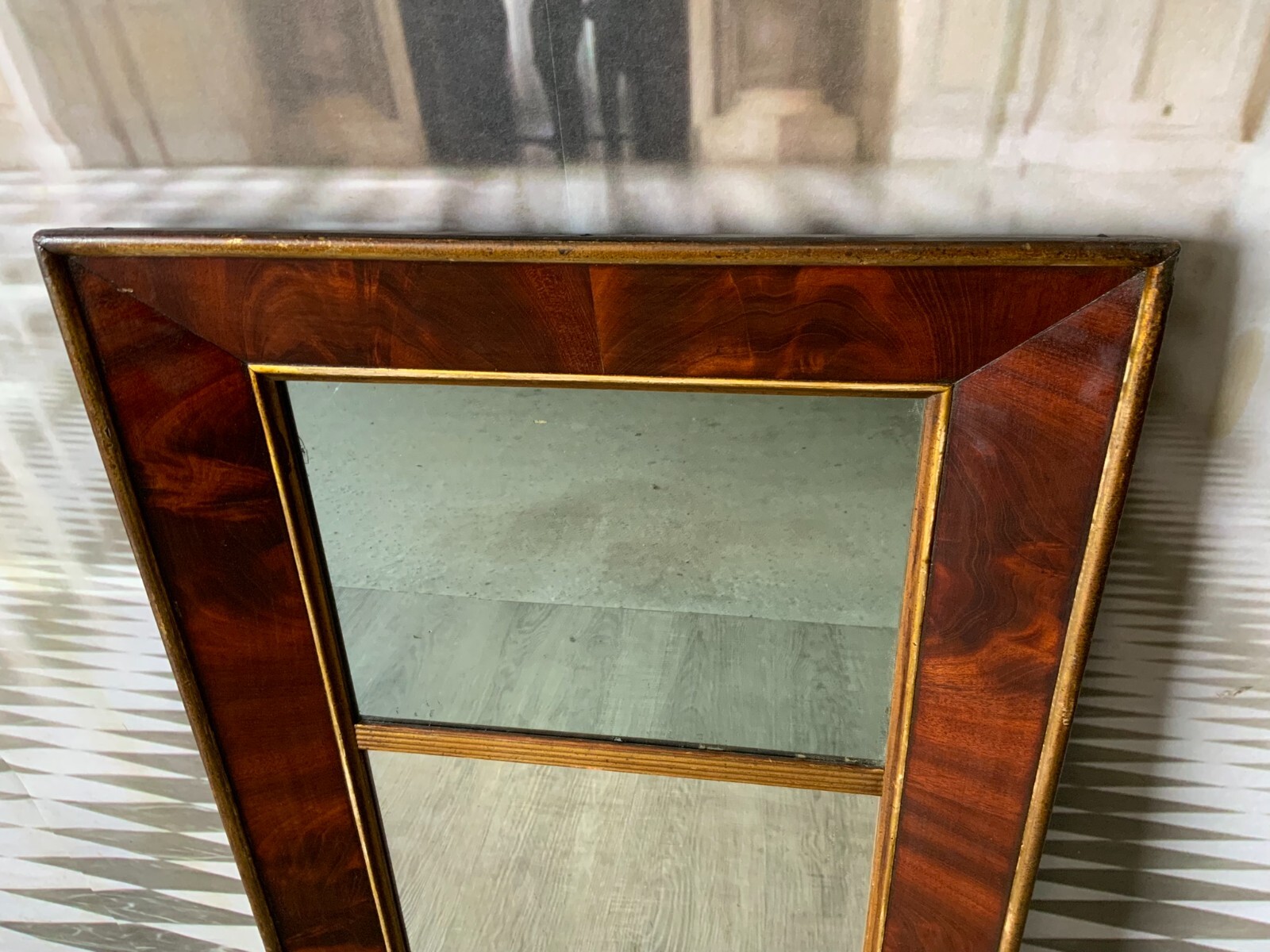 Sehr schöner Empire Spiegel aus Holz ,Mahagoni furniert und schönen, vergoldeten Zierelementen. Die Vergoldung zum Teil verblast, die Ränder sind bestoßen und berieben. Das Spiegelglas ist optisch durch eine Zierleiste zweigeteilt. Das Furnier ist teilweise unvollständig. Am Spiegel selbst befinden sich Kratzer und diverse Verschmutzungen. Abmessungen: 45x89cm.