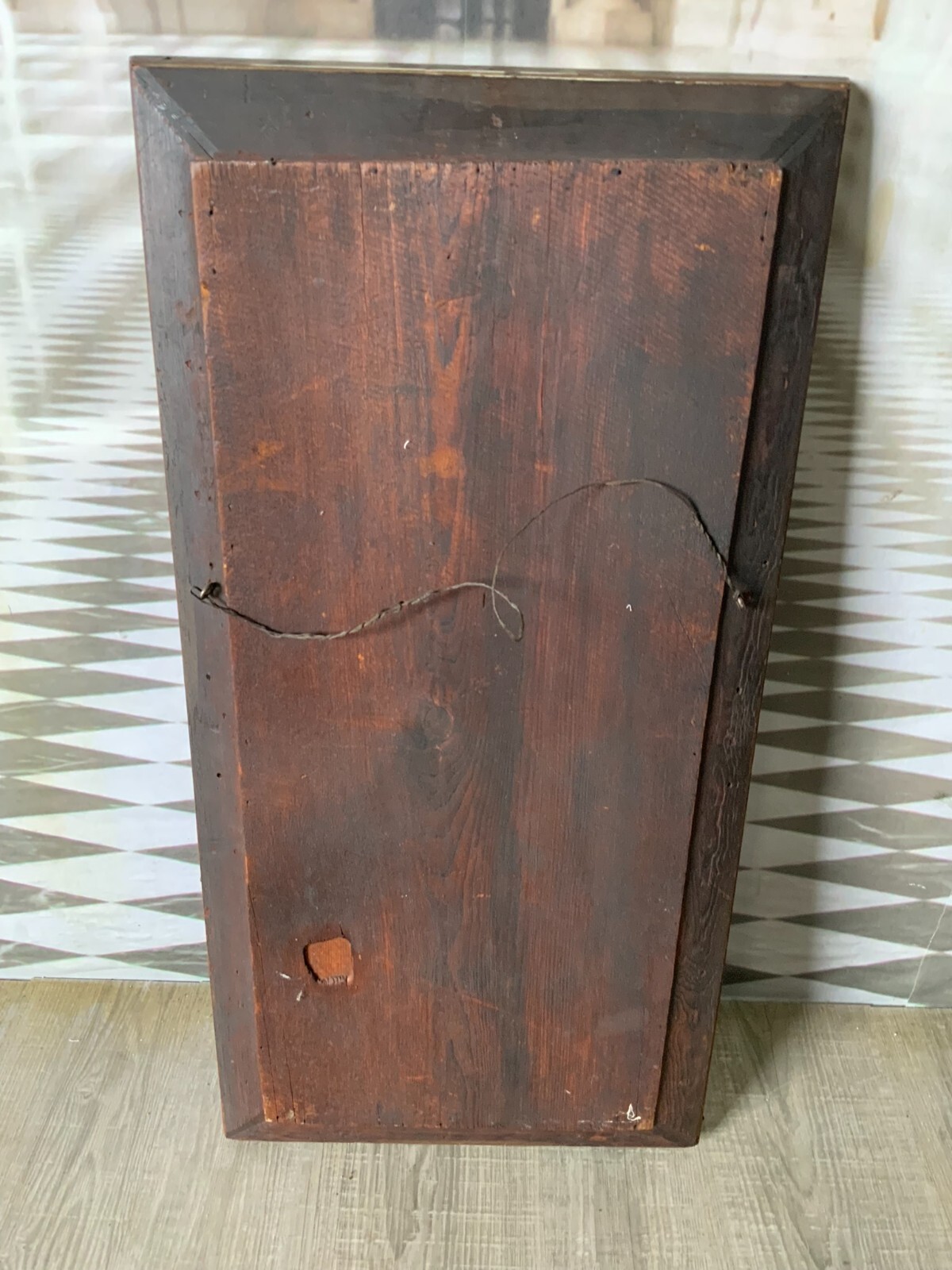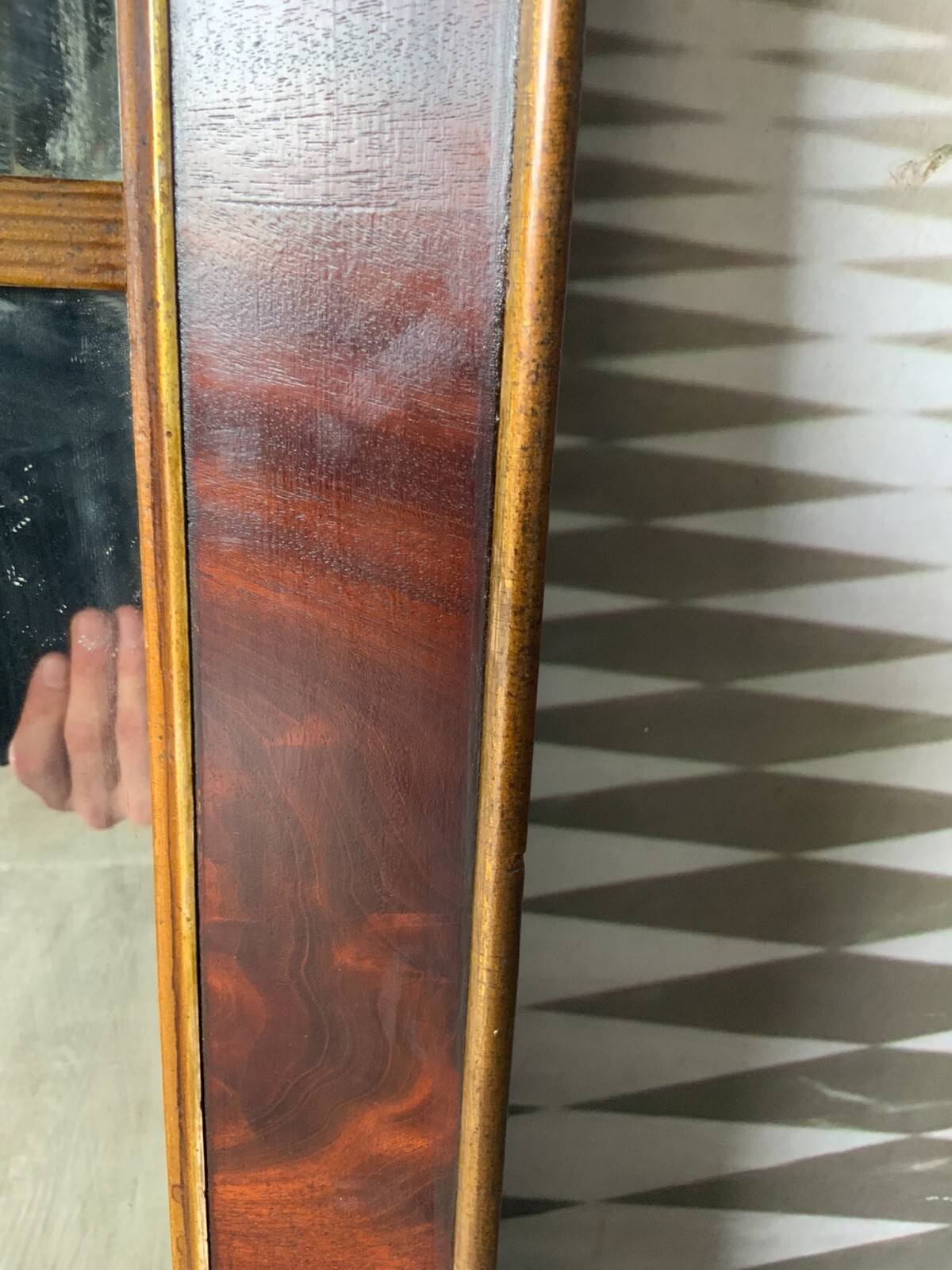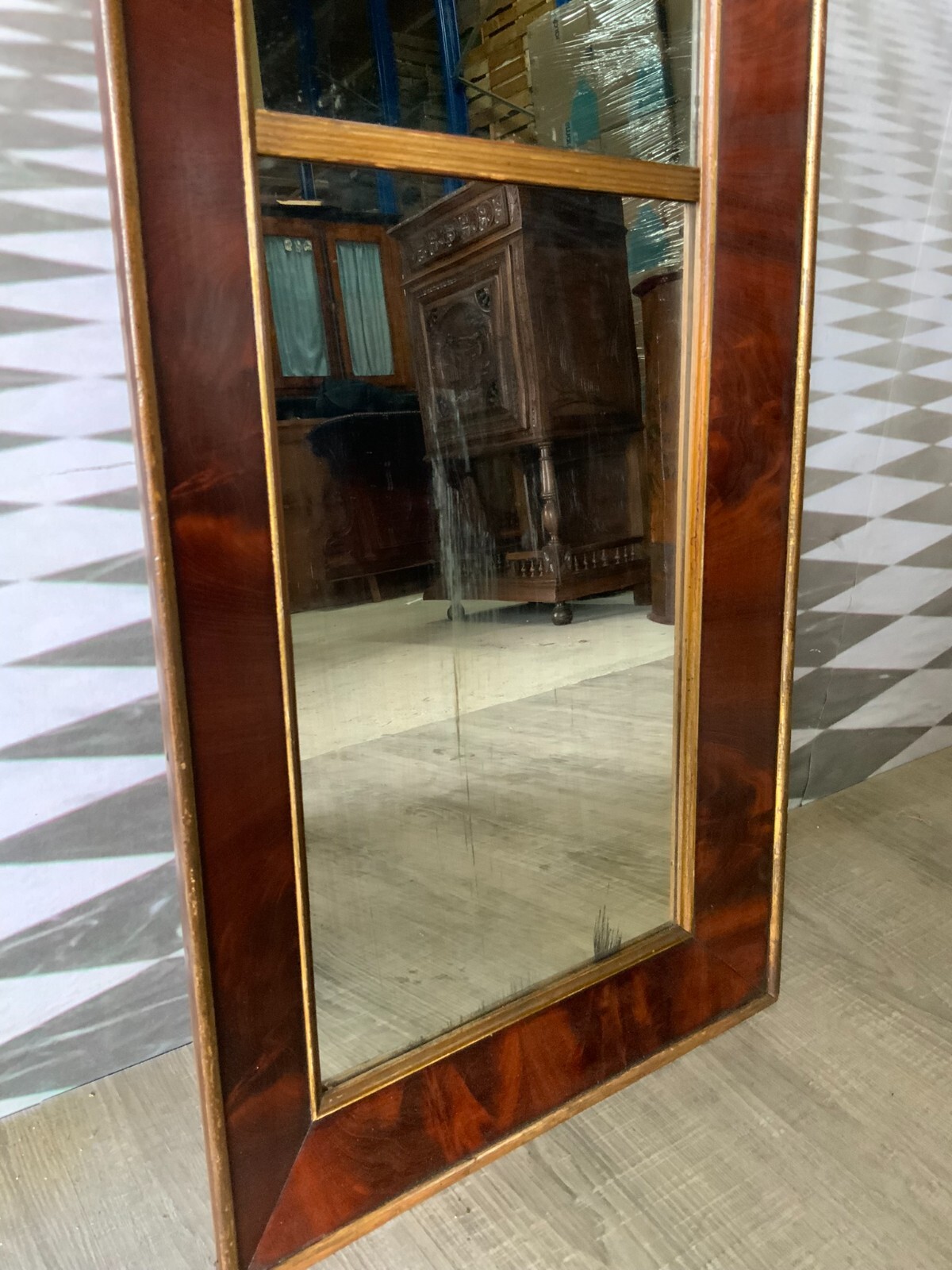 Sehr schöner Empire Spiegel aus Holz ,Mahagoni furniert und schönen, vergoldeten Zierelementen. Die Vergoldung zum Teil verblast, die Ränder sind bestoßen und berieben. Das Spiegelglas ist optisch durch eine Zierleiste zweigeteilt. Das Furnier ist teilweise unvollständig. Am Spiegel selbst befinden sich Kratzer und diverse Verschmutzungen. Abmessungen: 45x89cm.