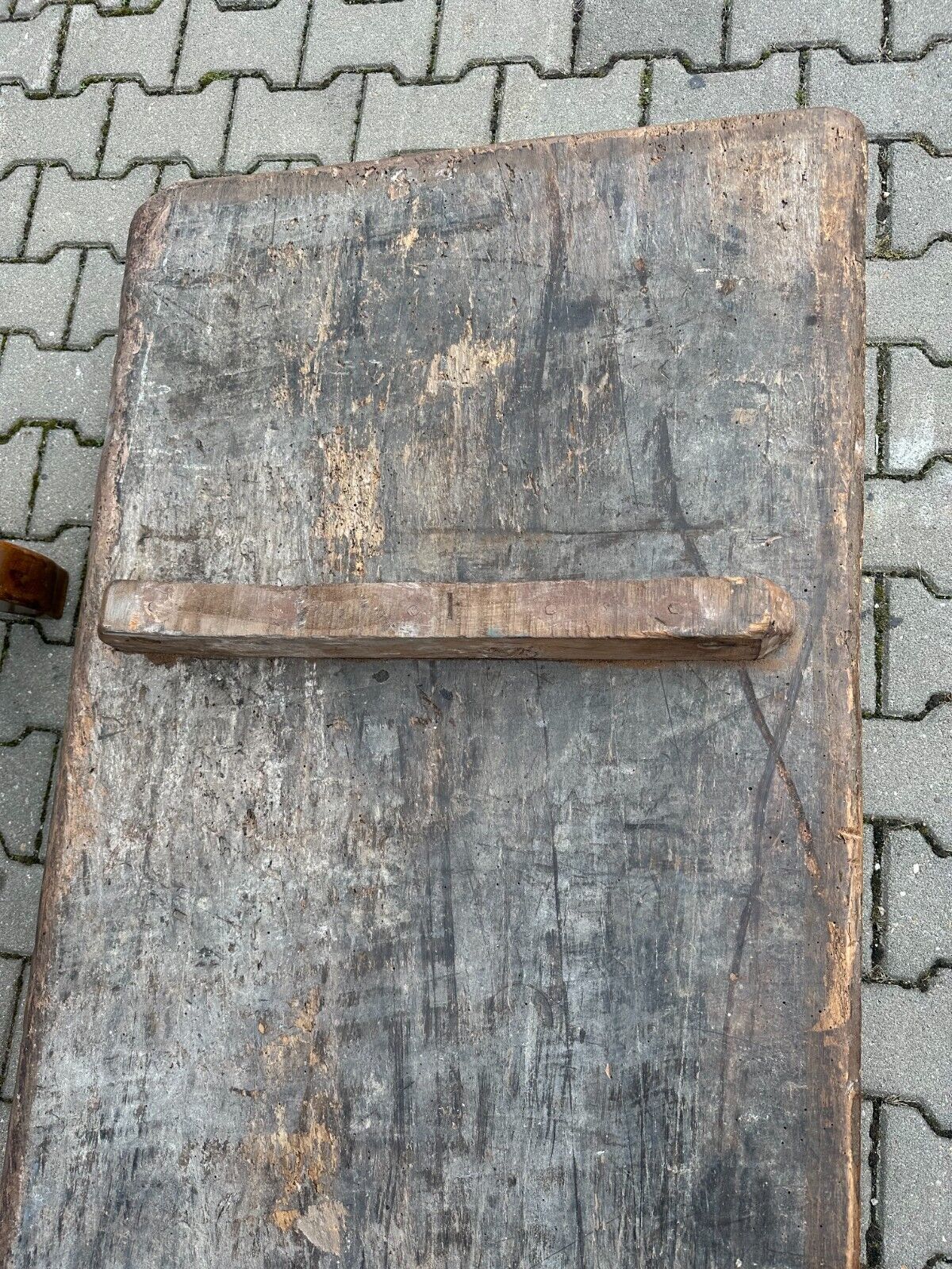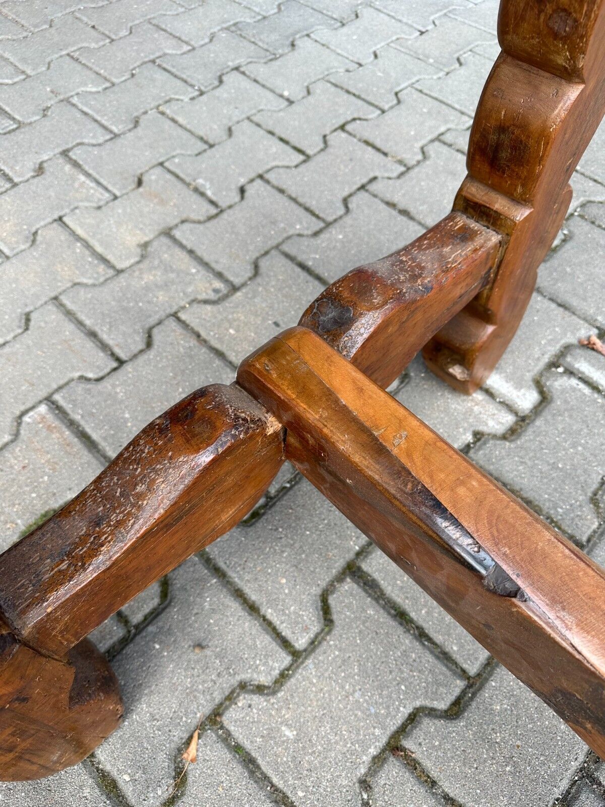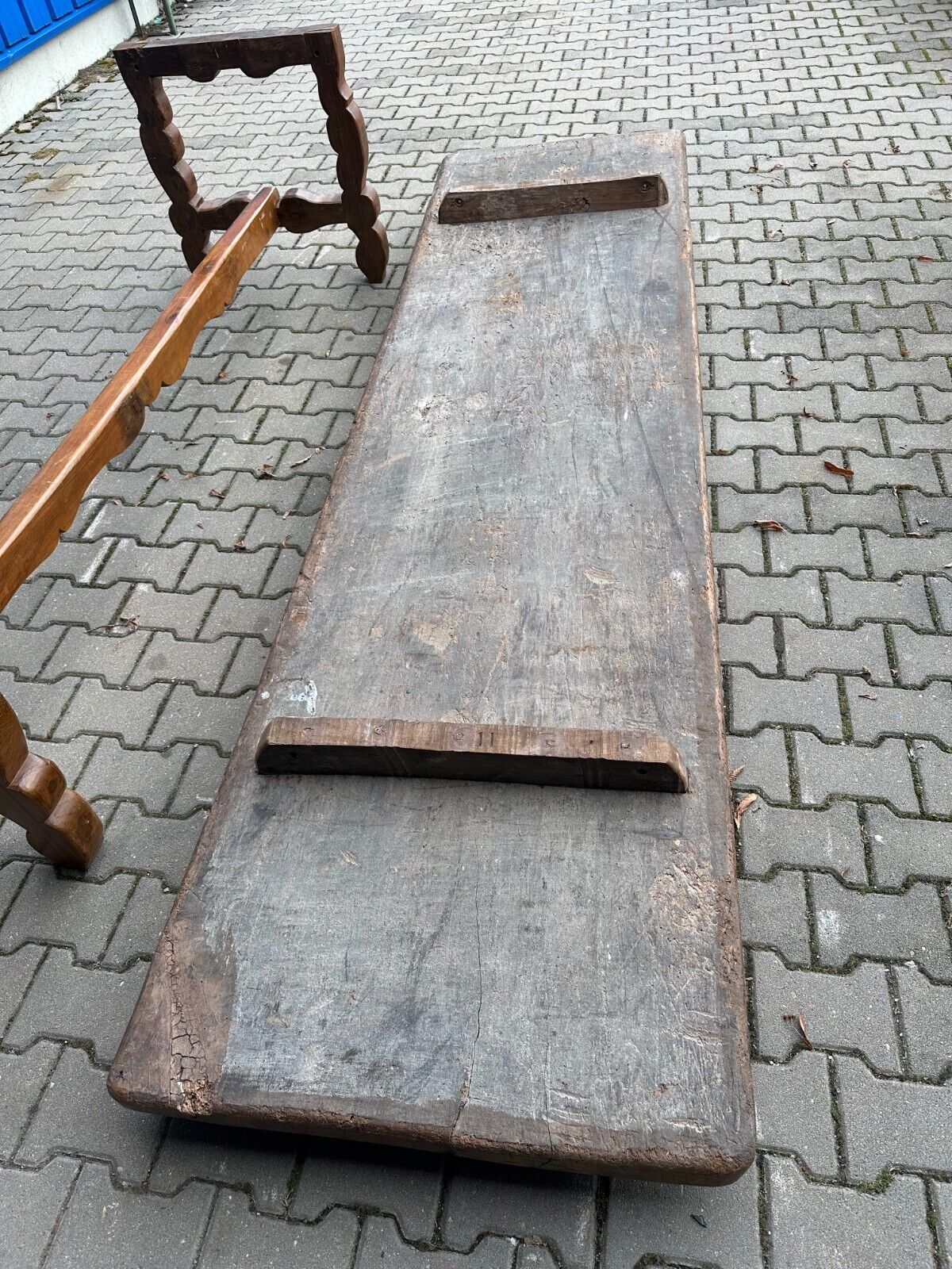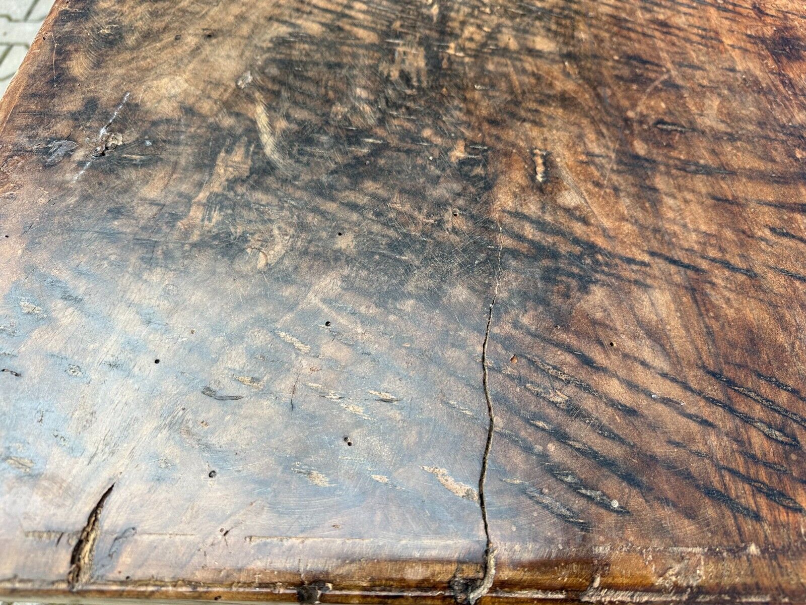 Sehr schöner, großer Barocktisch aus dem 18-ten Jahrhundert. Massive Eiche. Eine Ecke und wenige Stellen im Randbereich ergänzt, wenige leichte angehende Dehnungsrisse. An der gesamten Oberfläche und i Fussraum leichter, inaktiver Wurmfraß, eine Ecke an der Oberfläche berieben. Die gesamte Platte ist leicht in sich verzogen. Der lange untere Träger wurde ebenfalls mal überarbeitet und leicht ergänzt, die Tischplatte wird mit vier langen Schrauben von unten befestigt. Alles in einem eine tolle Patina, der Tisch könnte sofort eingesetzt werden. An der oberen Platte befinden sich leichte Flecken. Beim Abladen wird eine weiter sehr kräftige Person benötigt. Abmessungen BTH: 300x80x81cm, Beinfreiheit: 74cm. An der Unterseite Stellen im Randbereich gekittet.