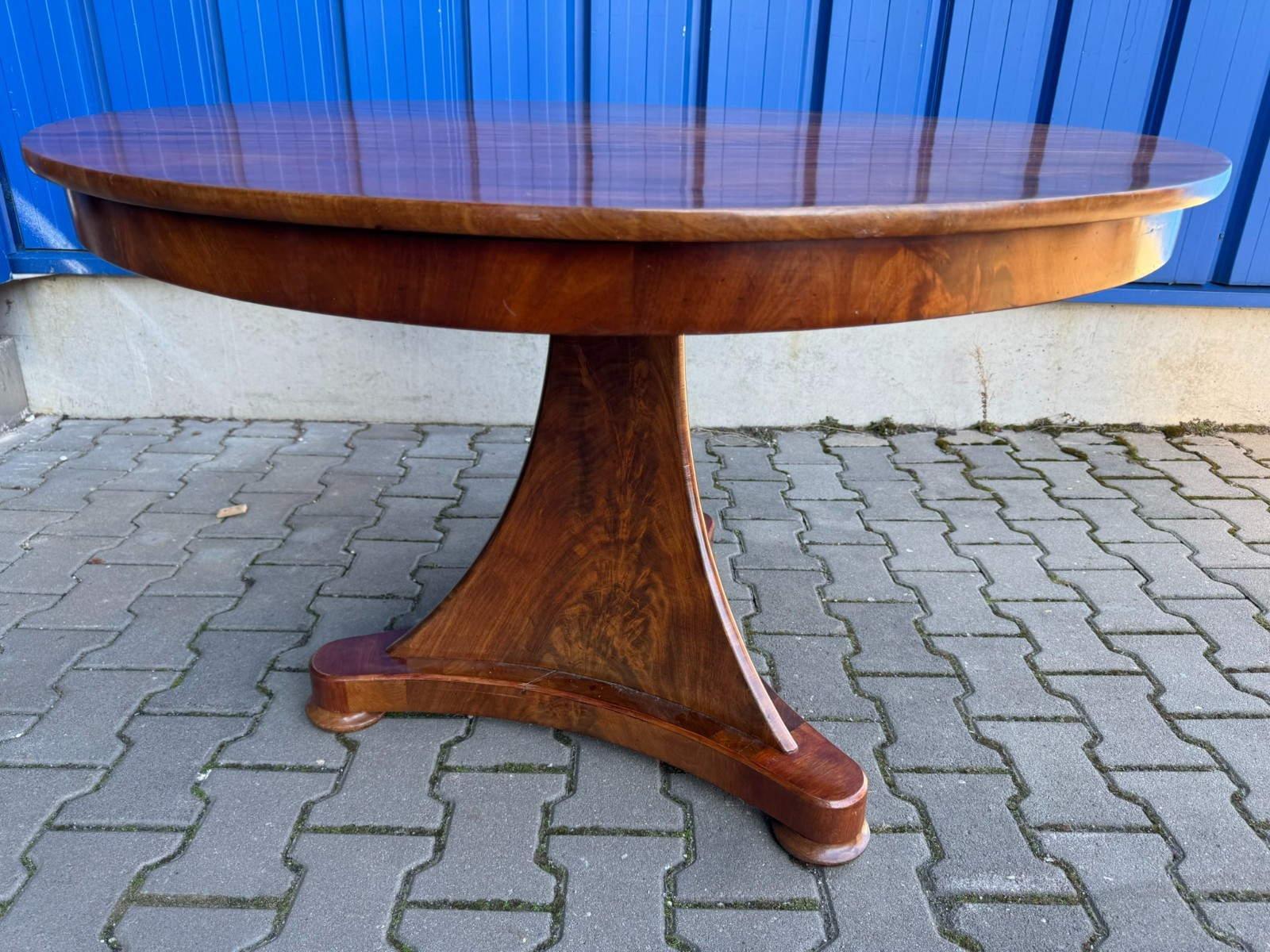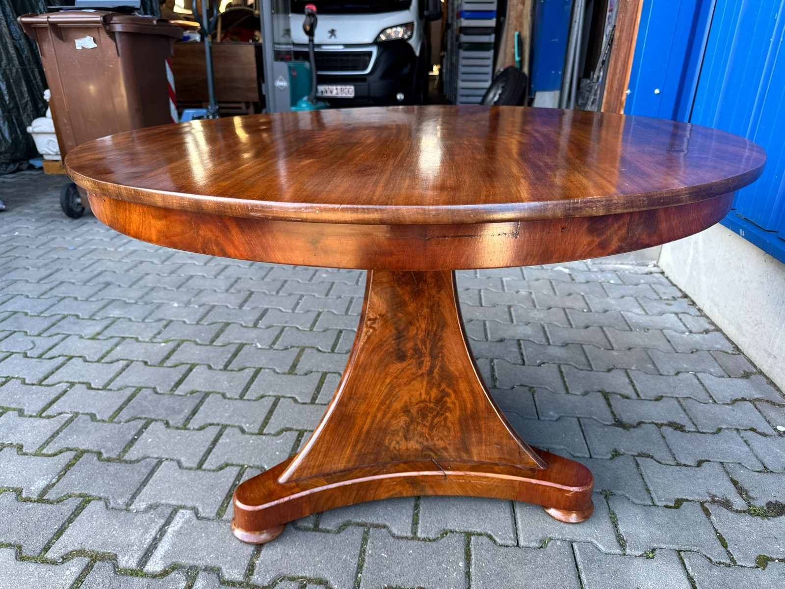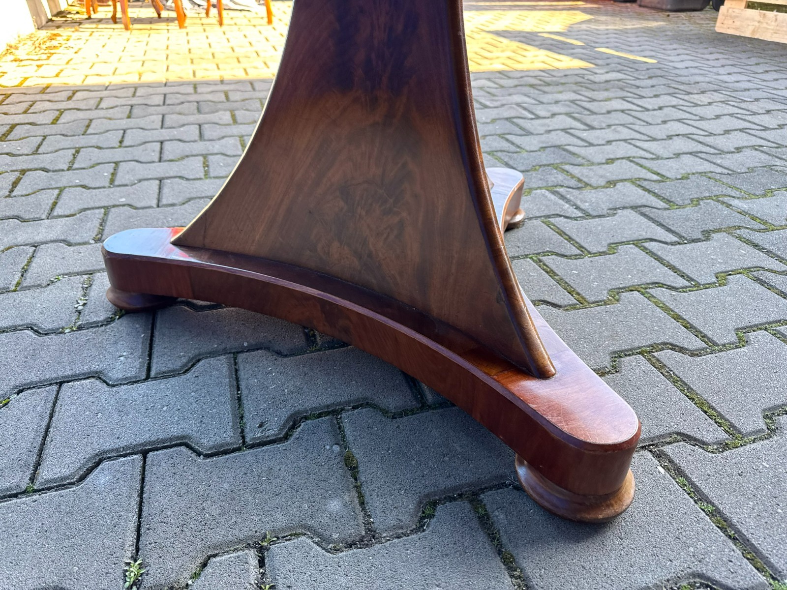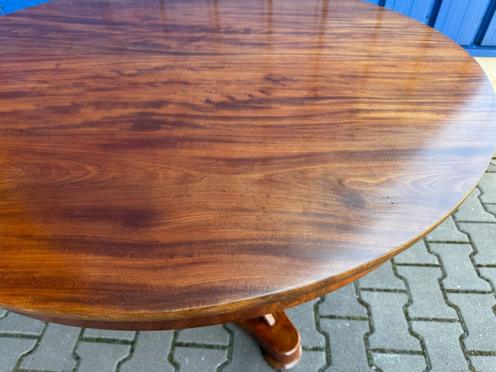 Antiker Biedermeier Tisch um 1820/1840 aus Mahagoni. Leichte Dehnungsspalten an den Zusammenfügungsstellen, und damit verbundene Haarrisse im Furnier, leichte Kratzer im Fußbereich und an der Aussenkante der Platte. Abmessungen BTH: 114xx110x76cm. Der Tisch wurde mal komplett professionell restauriert, dabei unter anderem auch die Höhe angepasst.