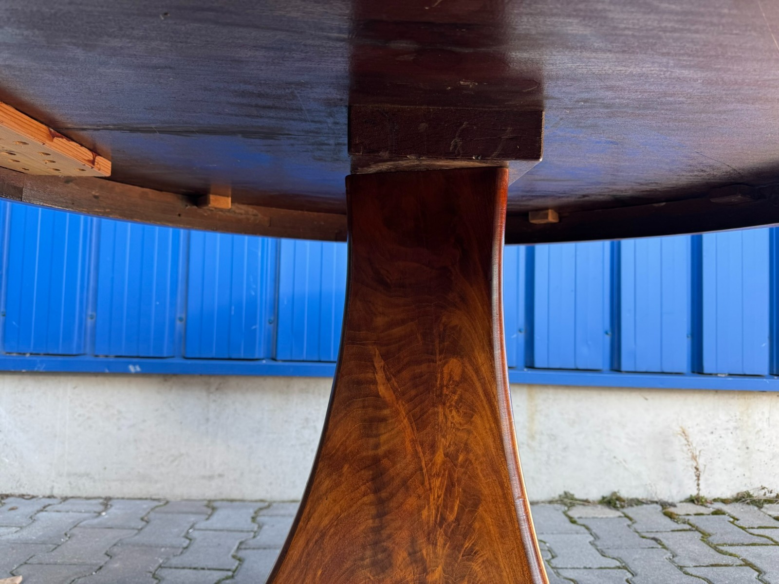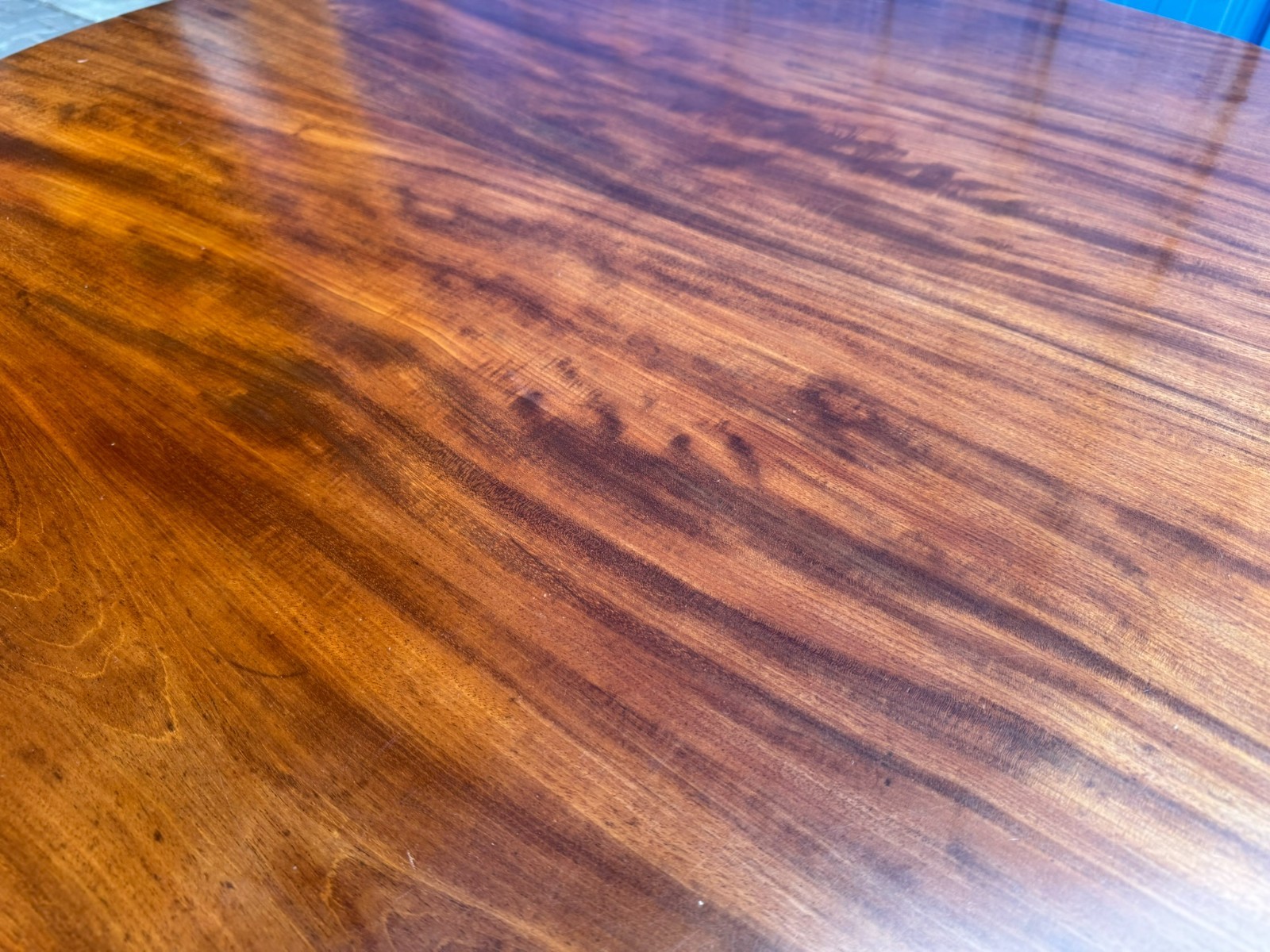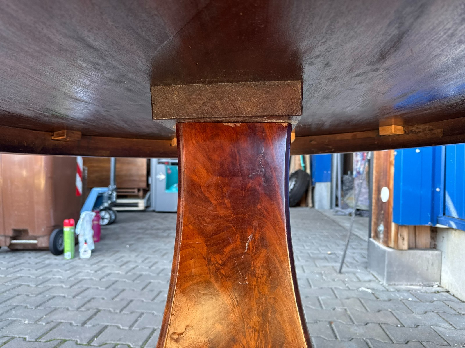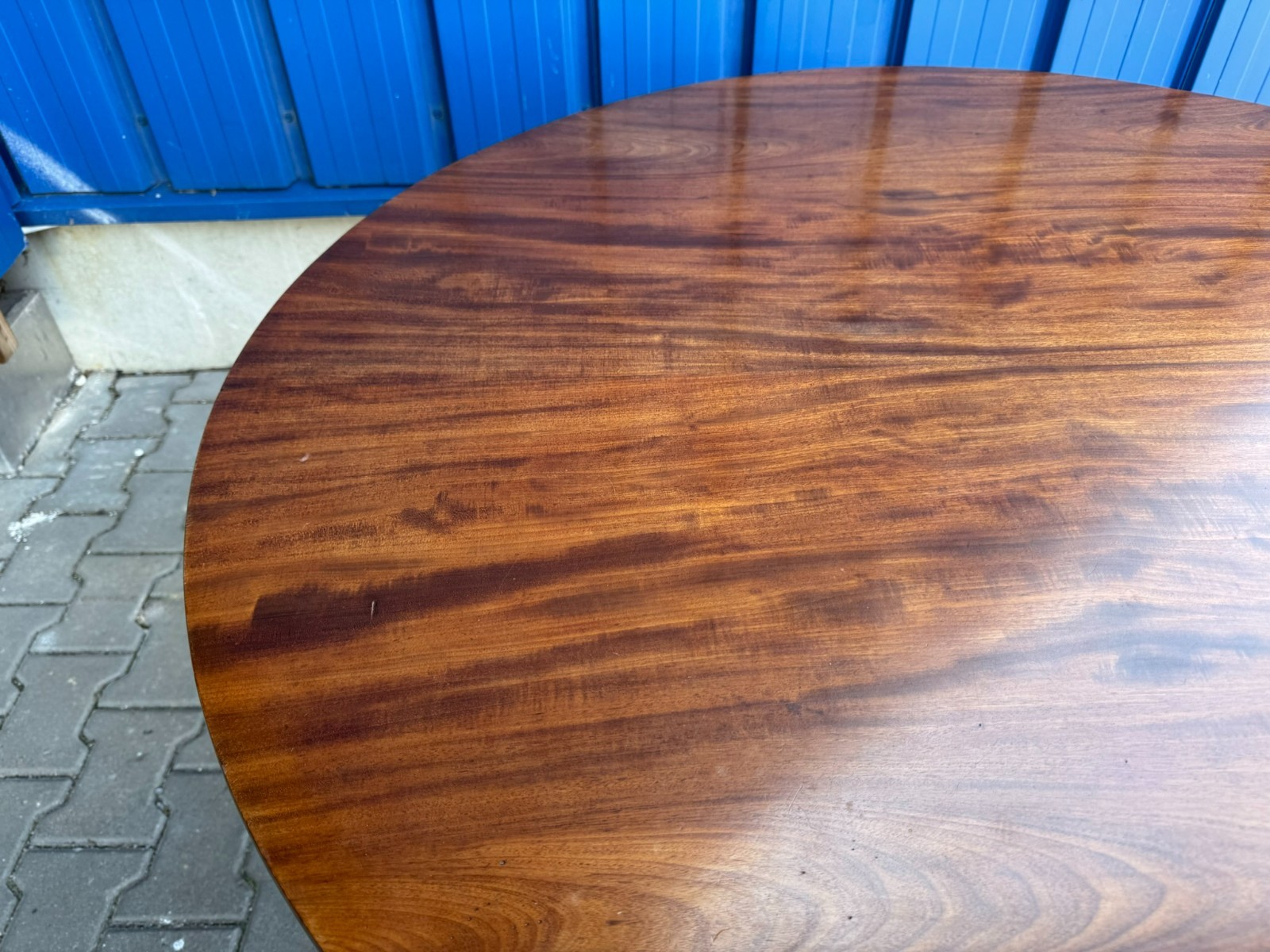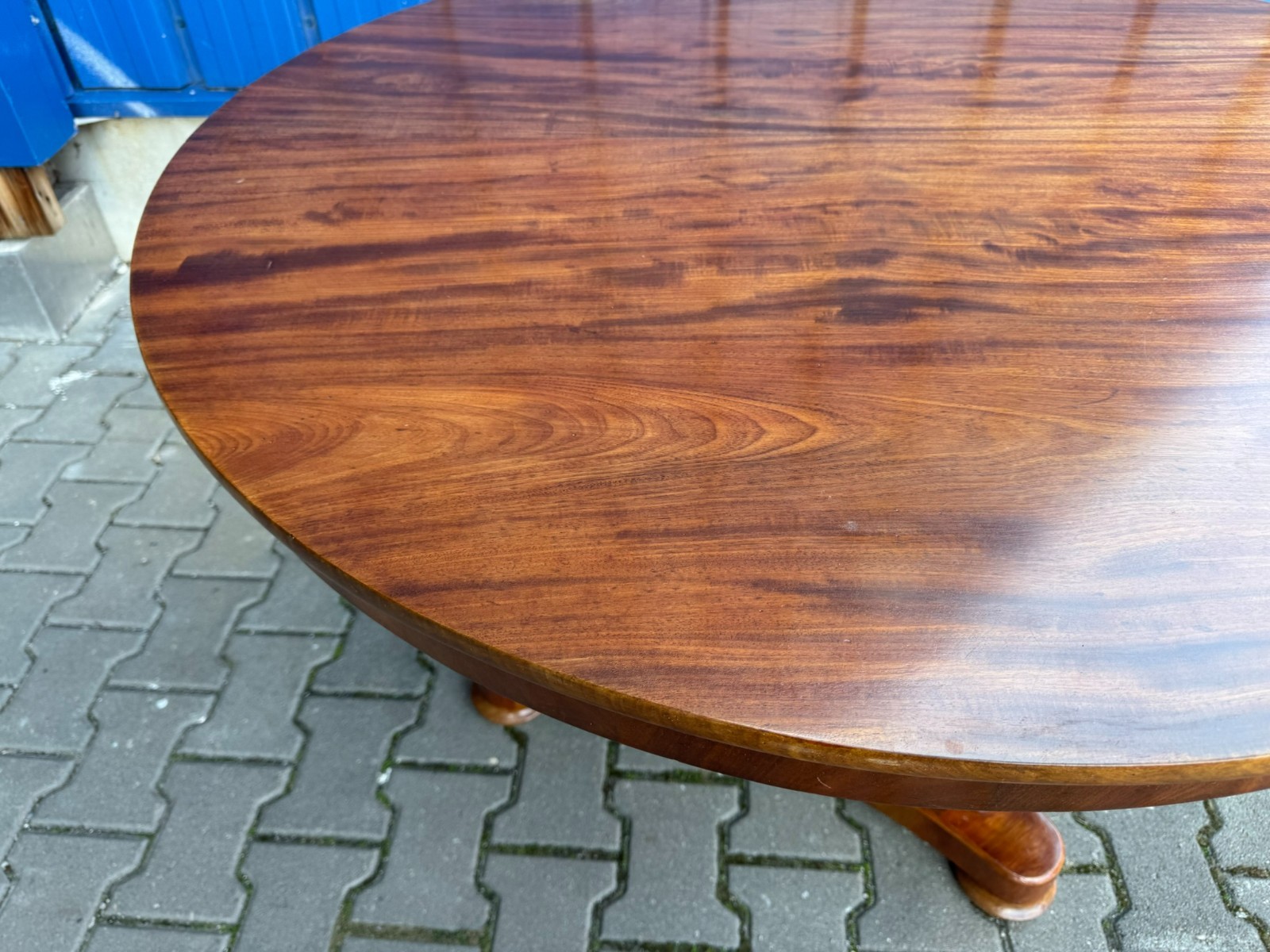 Antiker Biedermeier Tisch um 1820/1840 aus Mahagoni. Leichte Dehnungsspalten an den Zusammenfügungsstellen, und damit verbundene Haarrisse im Furnier, leichte Kratzer im Fußbereich und an der Aussenkante der Platte. Abmessungen BTH: 114xx110x76cm. Der Tisch wurde mal komplett professionell restauriert, dabei unter anderem auch die Höhe angepasst.