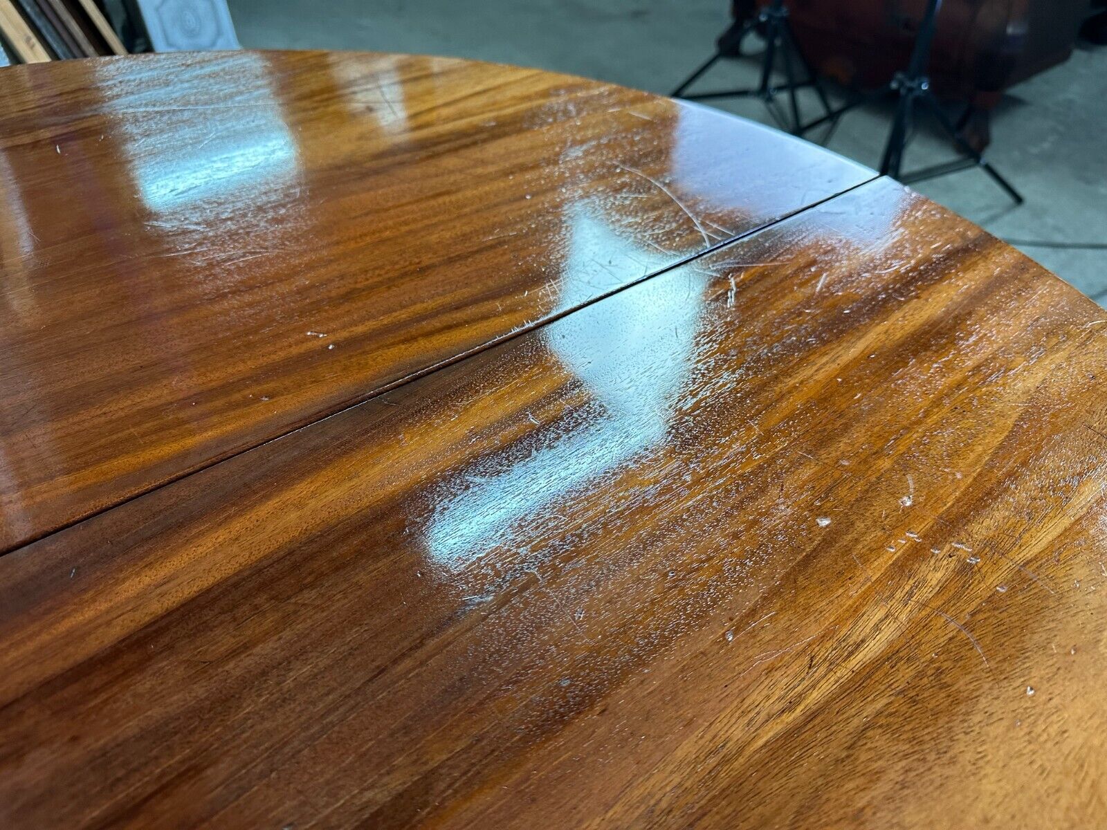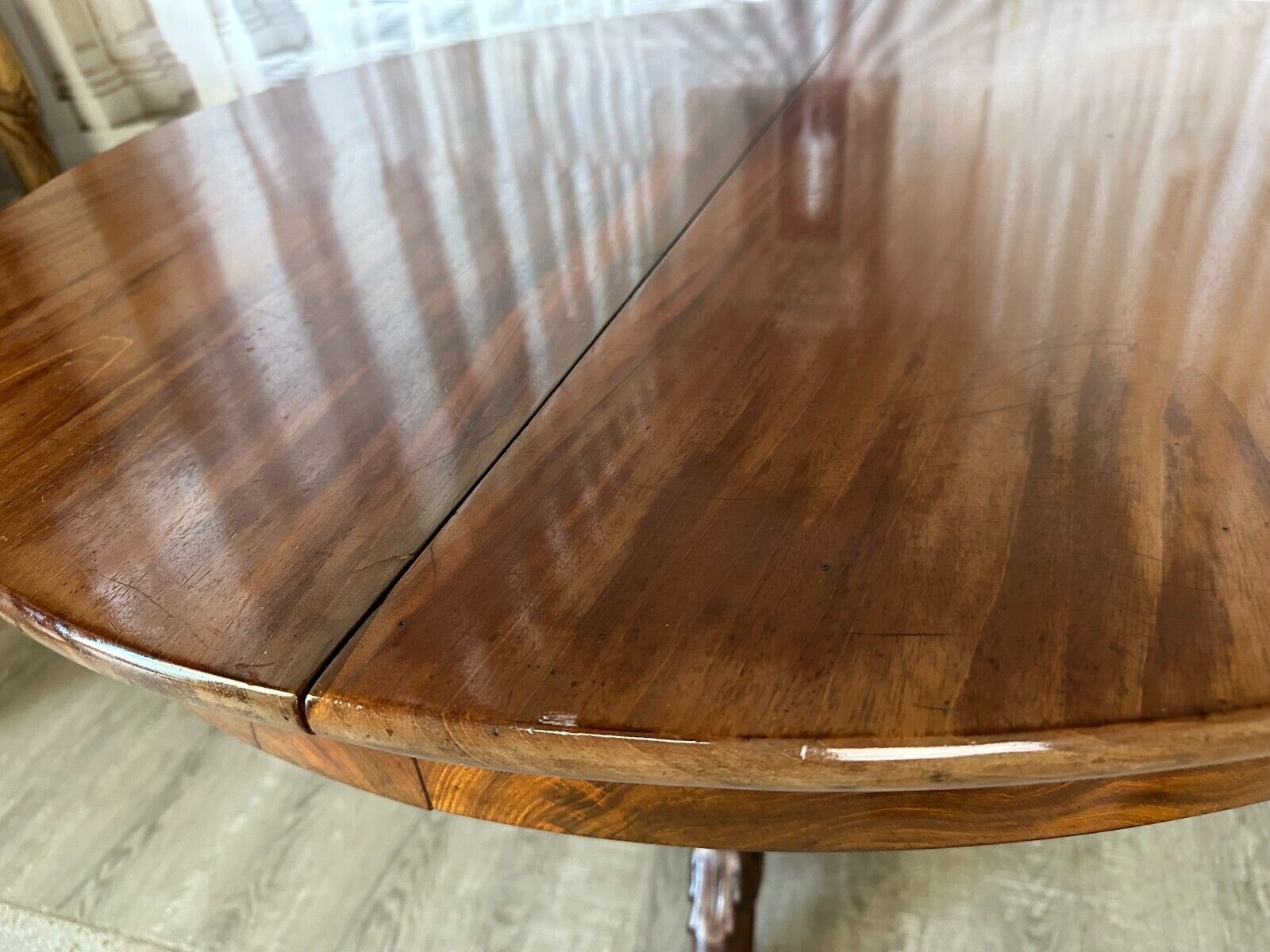 Antiker grosser Esstisch um 1860, Mahagoni, Fuss geschnitzt, Oberteil furniert, Spätbiedermeier. An der oberen Platte leichter Abrieb. Die Oberfläche war ursprünglich lackiert, die Platte wohl geölt. An den Stellen mit rissigem Lack ist das Öl bis zum Holz eingedrungen und hat die dunkleren Stellen verursacht. Die vier Einlegeplatten sind nicht furniert, berieben und fleckig. Abmessungen BTH max: 280x125x75cm, Beinfreiheit: 65cm. Breite geschlossen: 120cm.