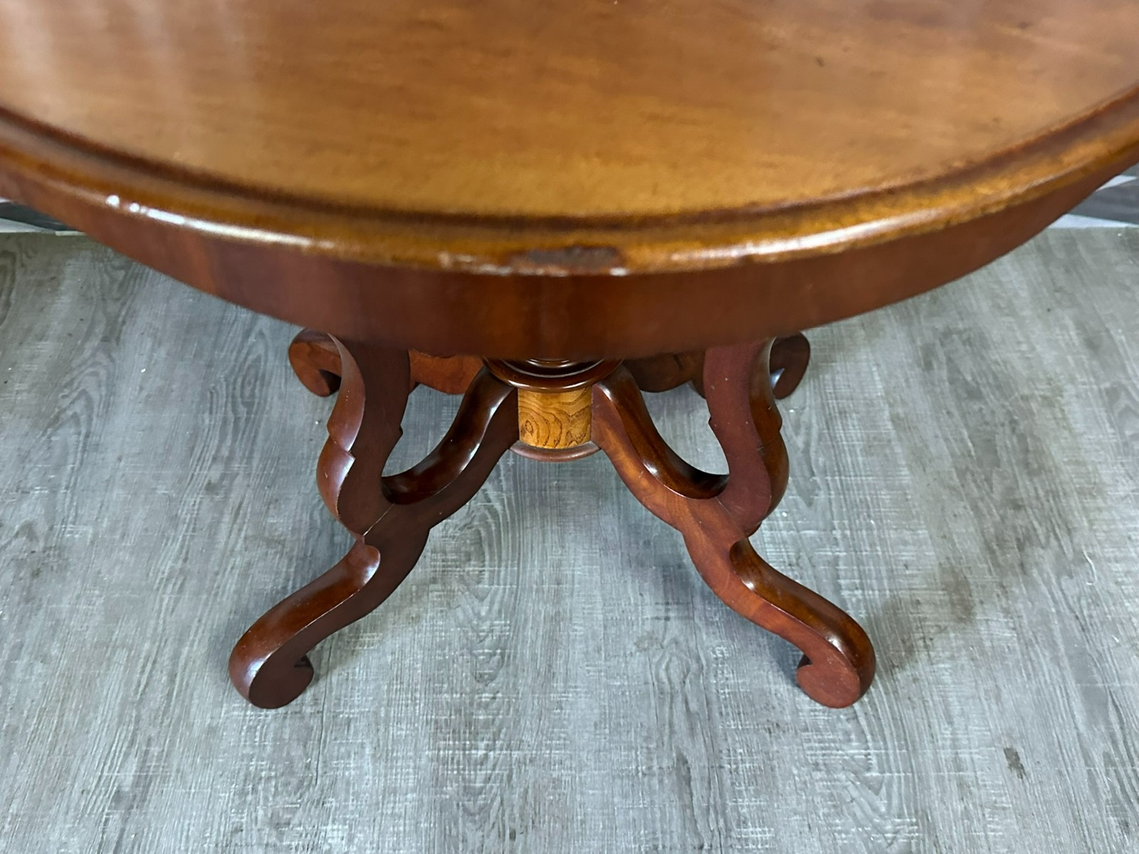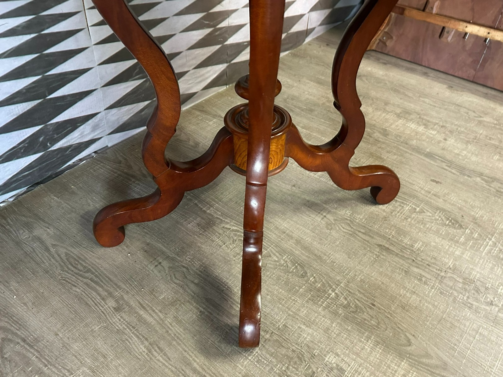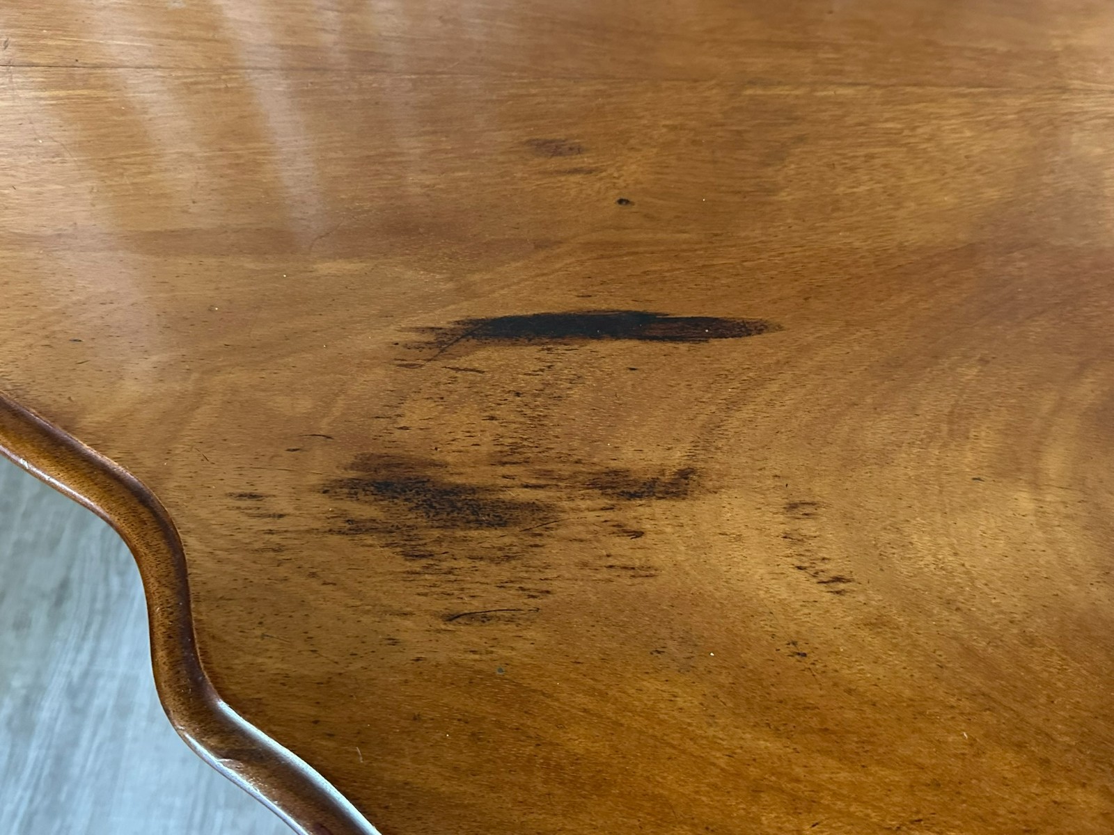 Antiker Louis Philippe Tisch um 1850. Fuß aus Mahagoni massiv, obere Platte Mahagoni furniert. An der oberen Platte größerer brauner Fleck, im Randbereich leicht bestossenund berieben. Der Fußbereich minimal berieben. Abmessungen BTH 114/83/74cm, Beinfreiheiet 67cm.