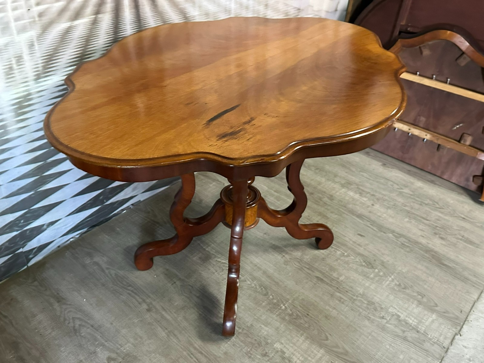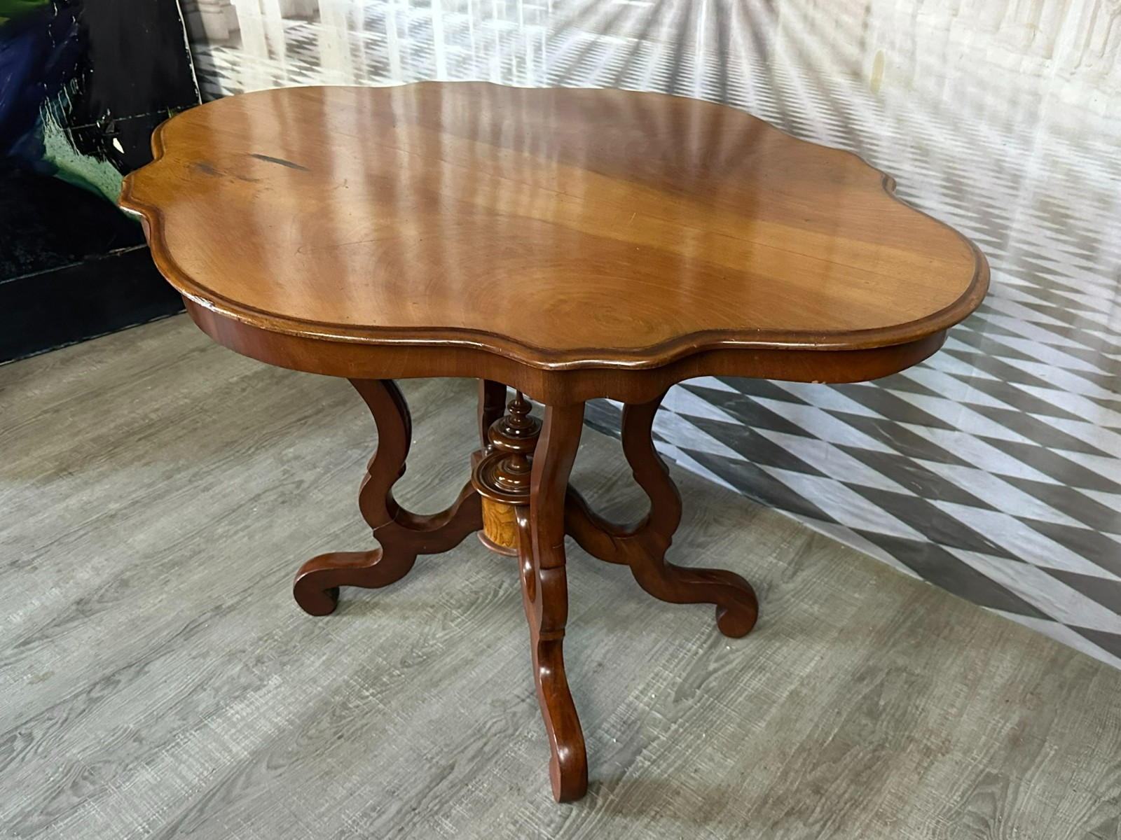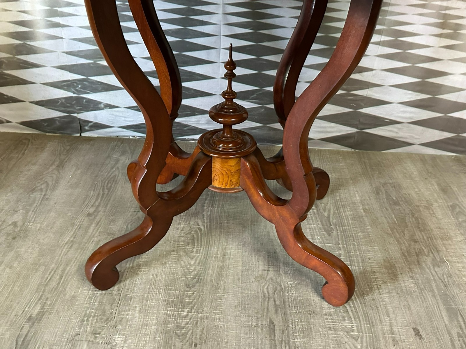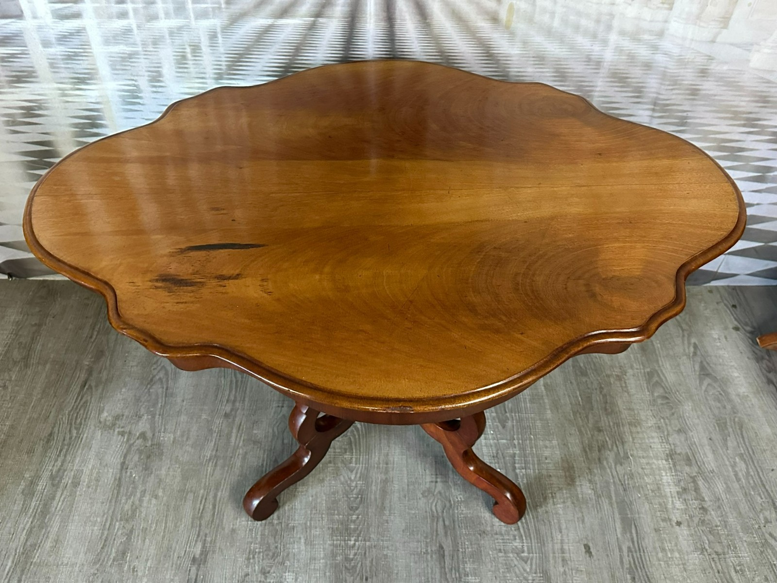 Antiker Louis Philippe Tisch um 1850. Fuß aus Mahagoni massiv, obere Platte Mahagoni furniert. An der oberen Platte größerer brauner Fleck, im Randbereich leicht bestossenund berieben. Der Fußbereich minimal berieben. Abmessungen BTH 114/83/74cm, Beinfreiheiet 67cm.