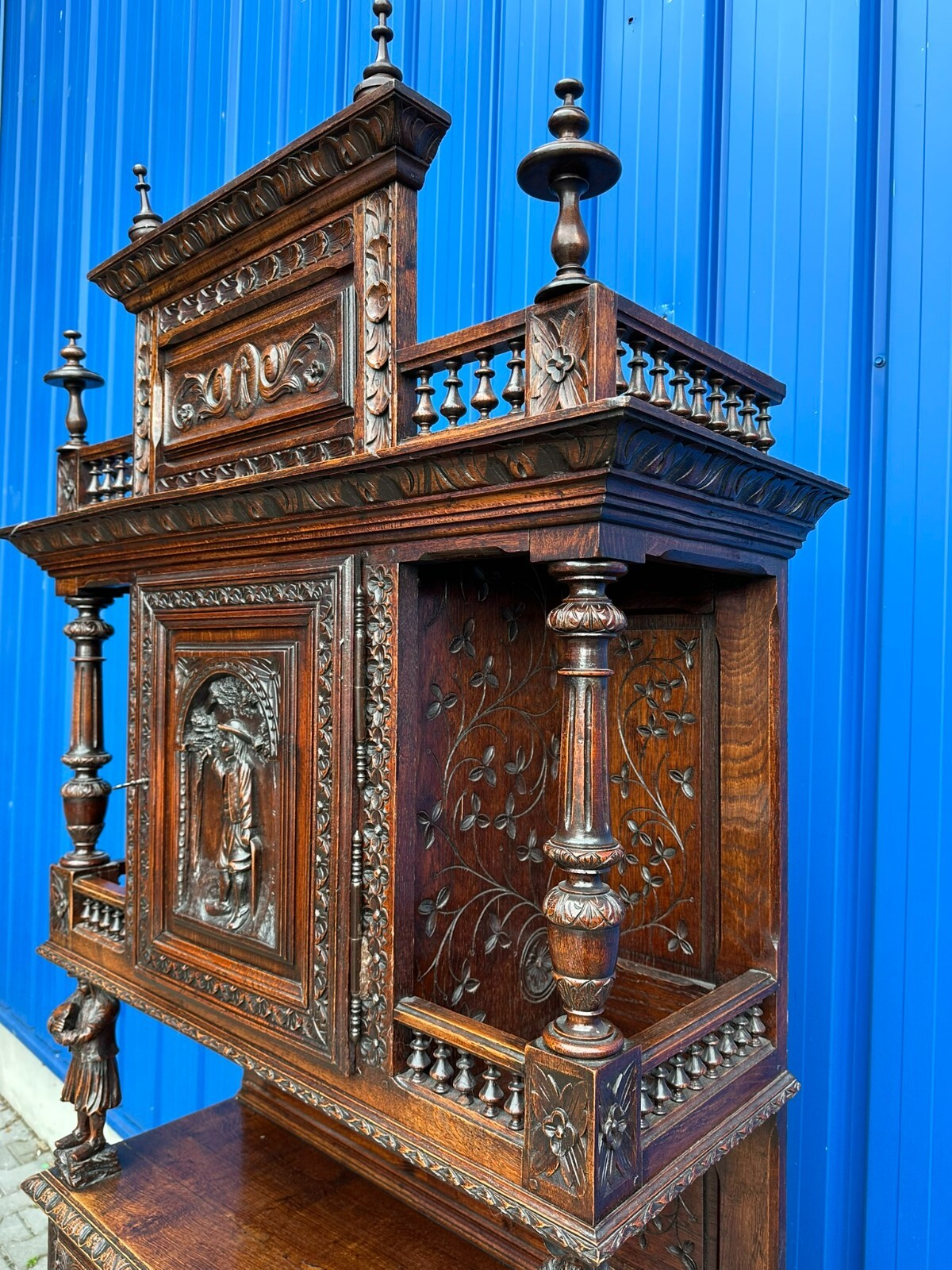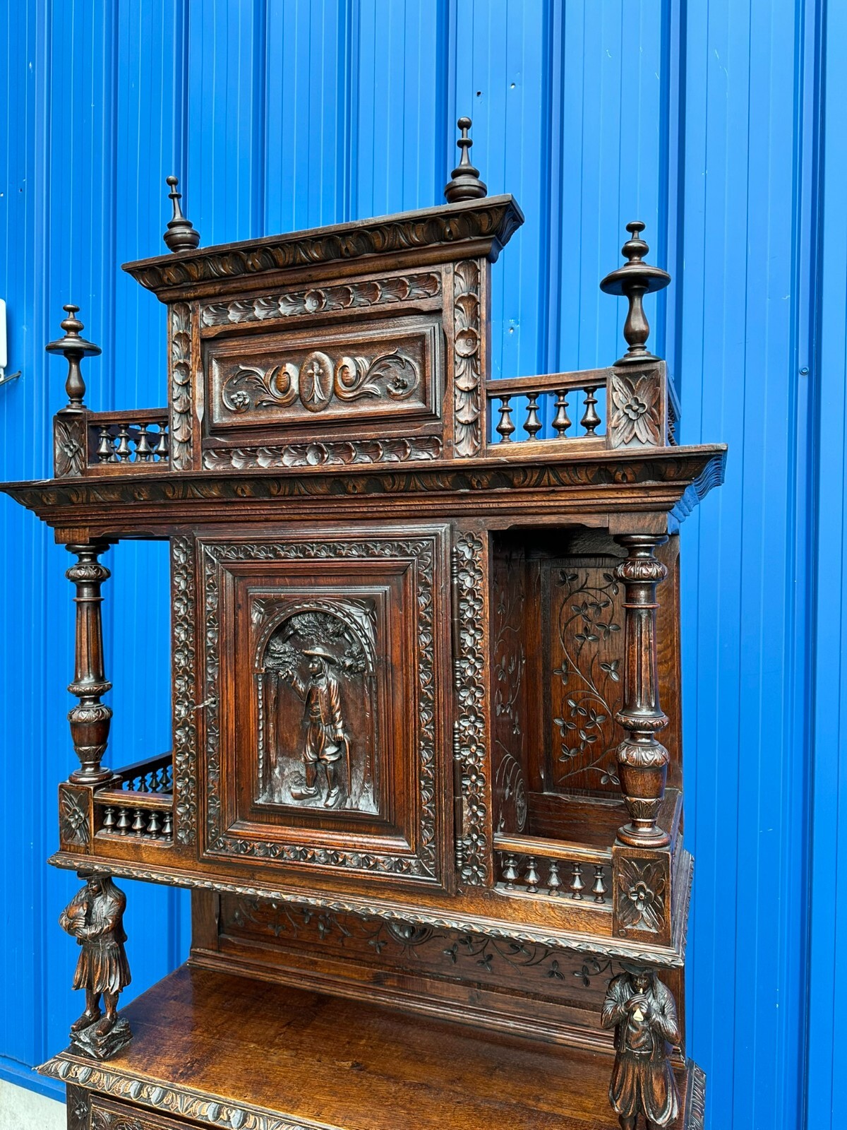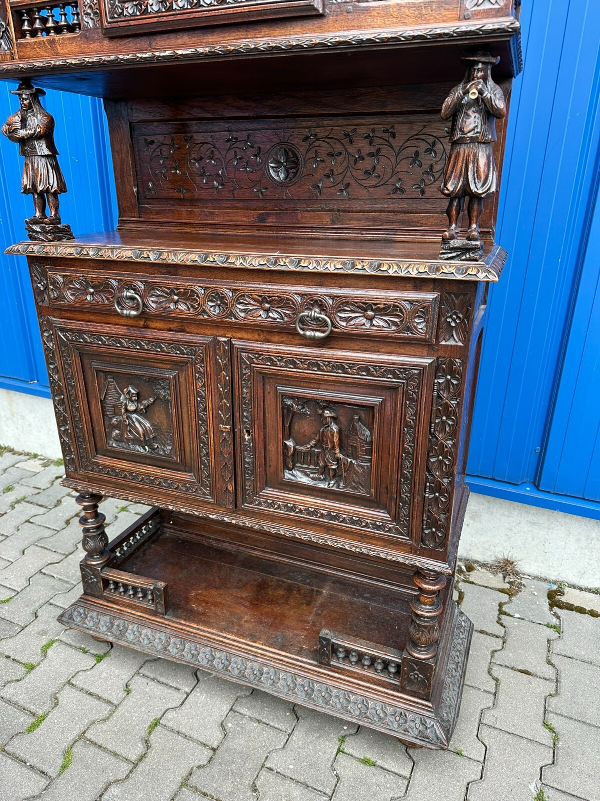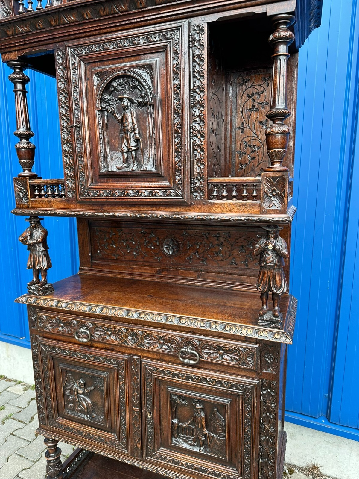 Sehr imposanter Historismus Schrank um 1880 aus Frankreich. Kastanienholz, komplett handgeschnitzt mit Figuren. An der linken mittleren Figur Tröte fehlend. Die unterste Leiste stärker berieben und bestossen, unten zwei mittlere Zapfen ebenfalls fehlend. Am Schnitzwerk insgesamt kleiner Unvollständigkeiten (Hüte, Leisten etc.) Die mittlere und die untere Ablage zum Teil berieben. Am Mittelteil wurde das Schloß ausgebaut, dieses liegt lose bei und hat wohl keine Funktion. Die Türen sind insgesamt aus den Scharnieren wacklig und müssen leicht angehoben werden, eine normale Funktionalität wird jedoch gewährleistet. Der oberste Kranz kann abgenommen werden, das restliche Möbel (hat dann eine Höhe von 202cm) ist am Stück. Abmessungen BTH 107/40/245cm.
