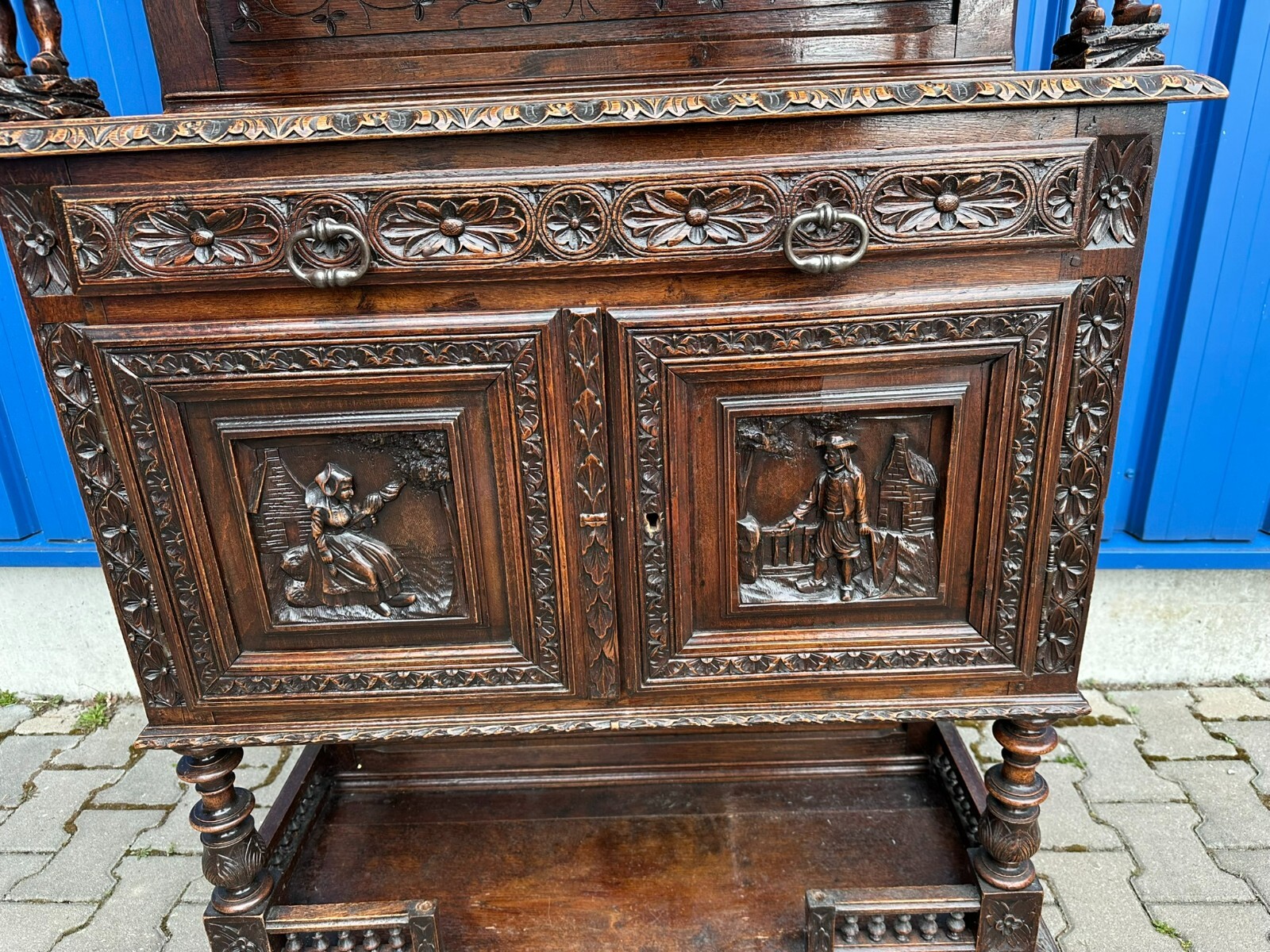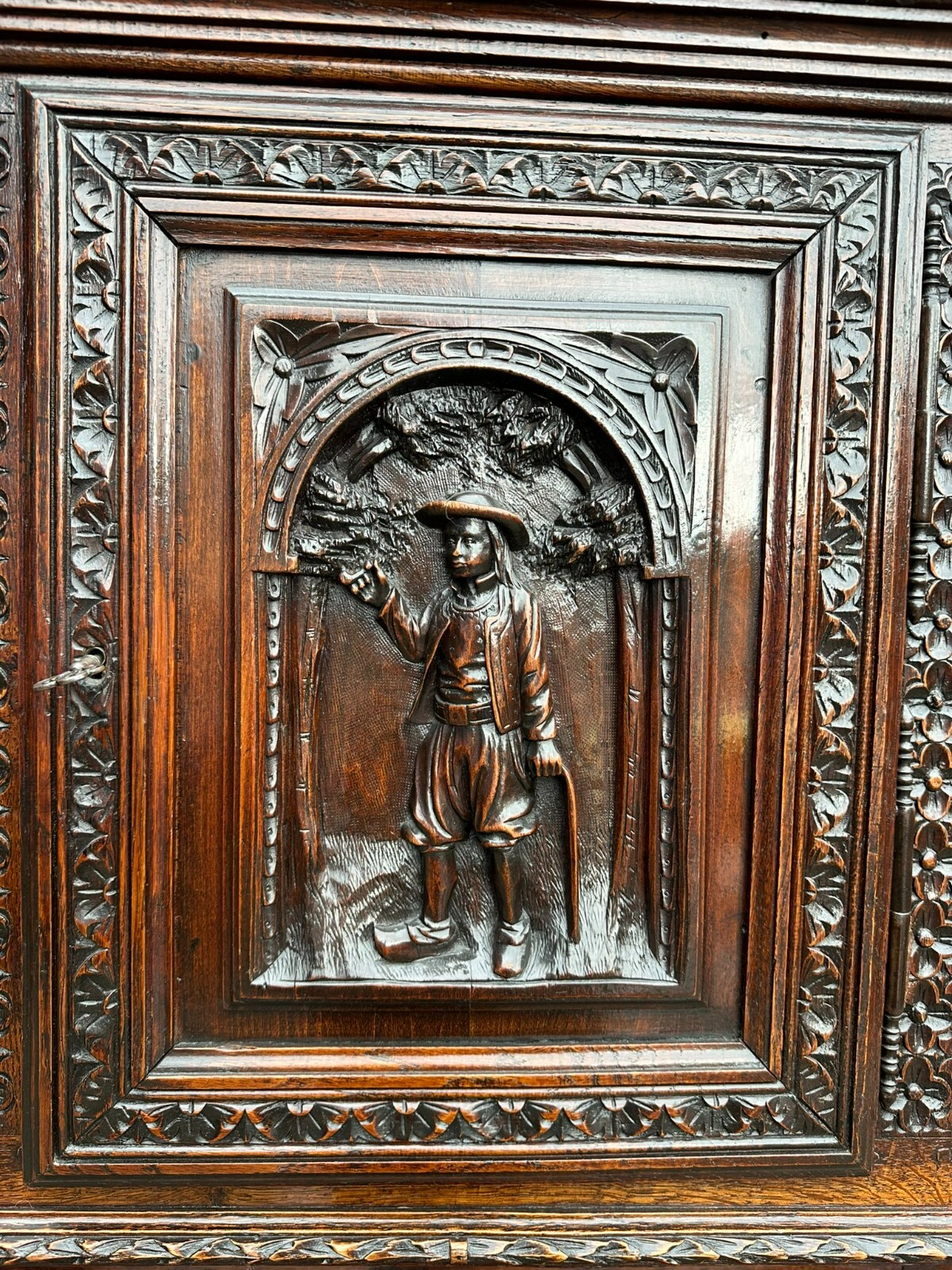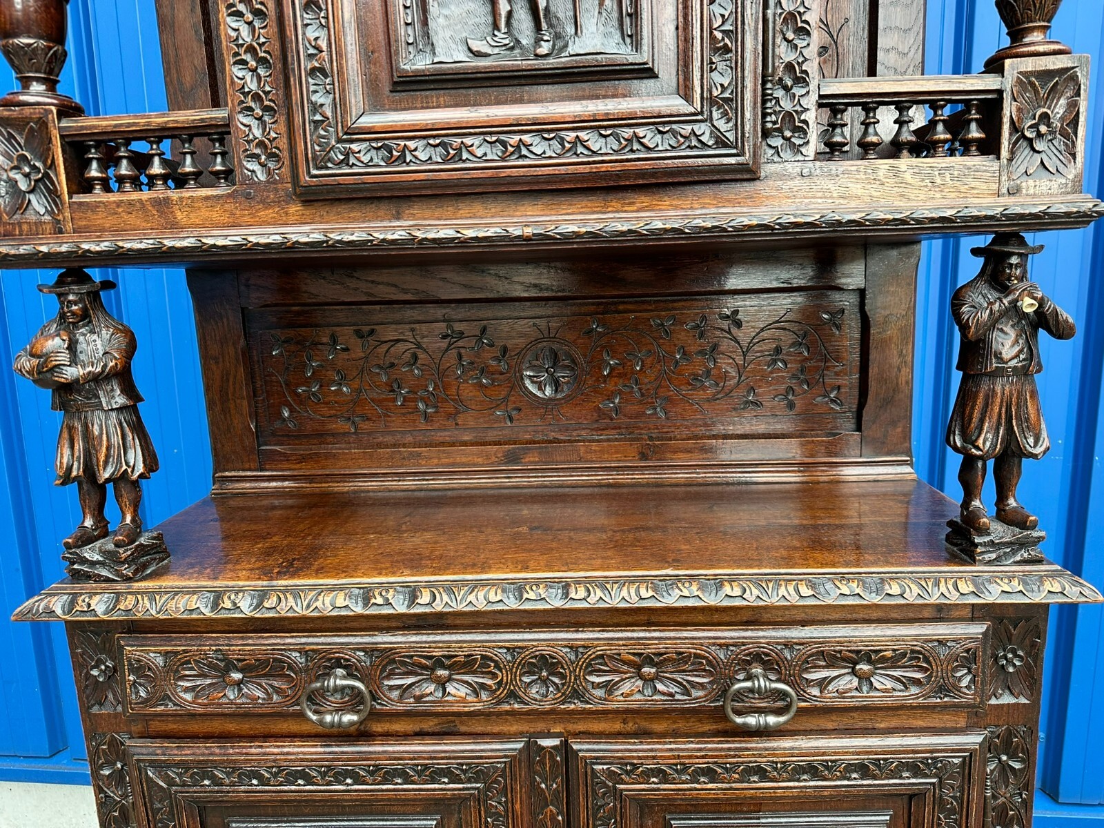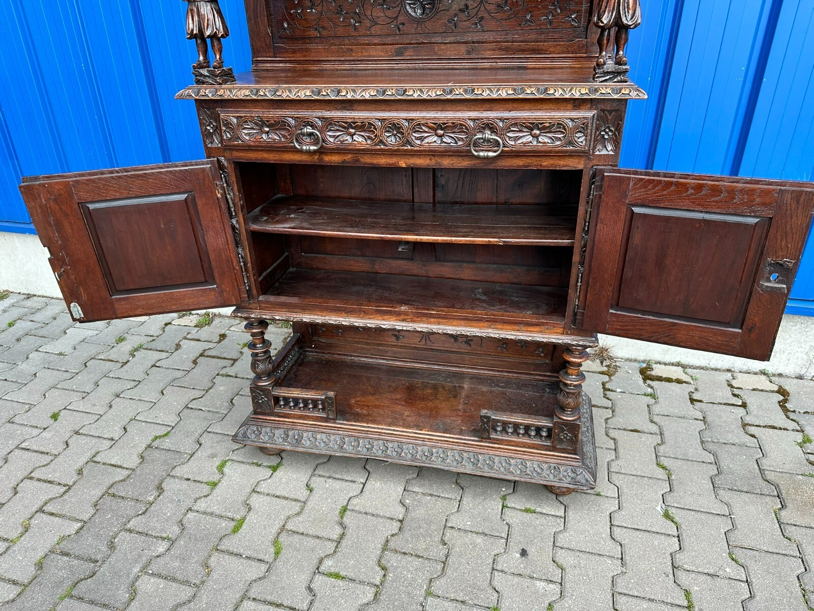 Sehr imposanter Historismus Schrank um 1880 aus Frankreich. Kastanienholz, komplett handgeschnitzt mit Figuren. An der linken mittleren Figur Tröte fehlend. Die unterste Leiste stärker berieben und bestossen, unten zwei mittlere Zapfen ebenfalls fehlend. Am Schnitzwerk insgesamt kleiner Unvollständigkeiten (Hüte, Leisten etc.) Die mittlere und die untere Ablage zum Teil berieben. Am Mittelteil wurde das Schloß ausgebaut, dieses liegt lose bei und hat wohl keine Funktion. Die Türen sind insgesamt aus den Scharnieren wacklig und müssen leicht angehoben werden, eine normale Funktionalität wird jedoch gewährleistet. Der oberste Kranz kann abgenommen werden, das restliche Möbel (hat dann eine Höhe von 202cm) ist am Stück. Abmessungen BTH 107/40/245cm.