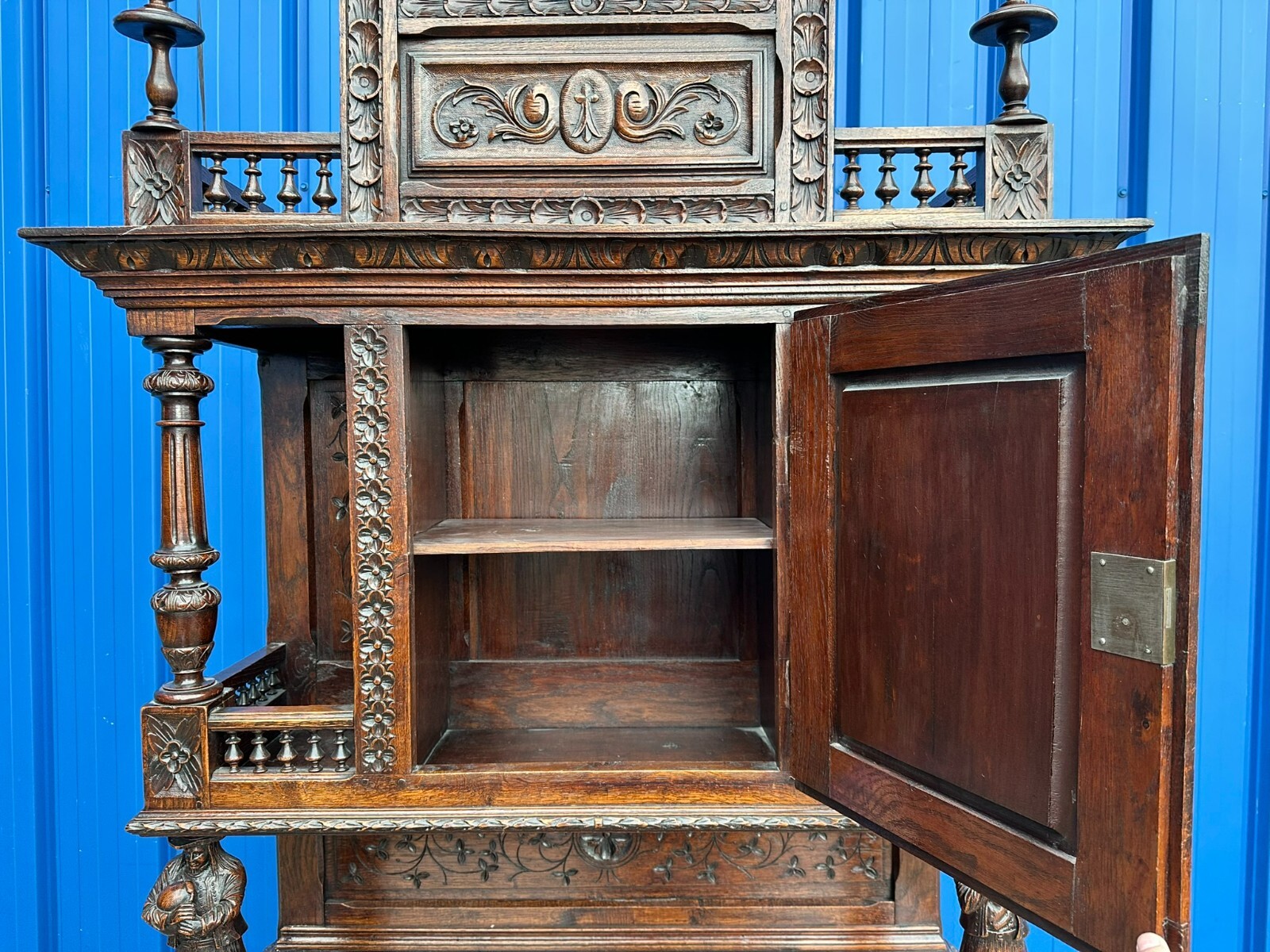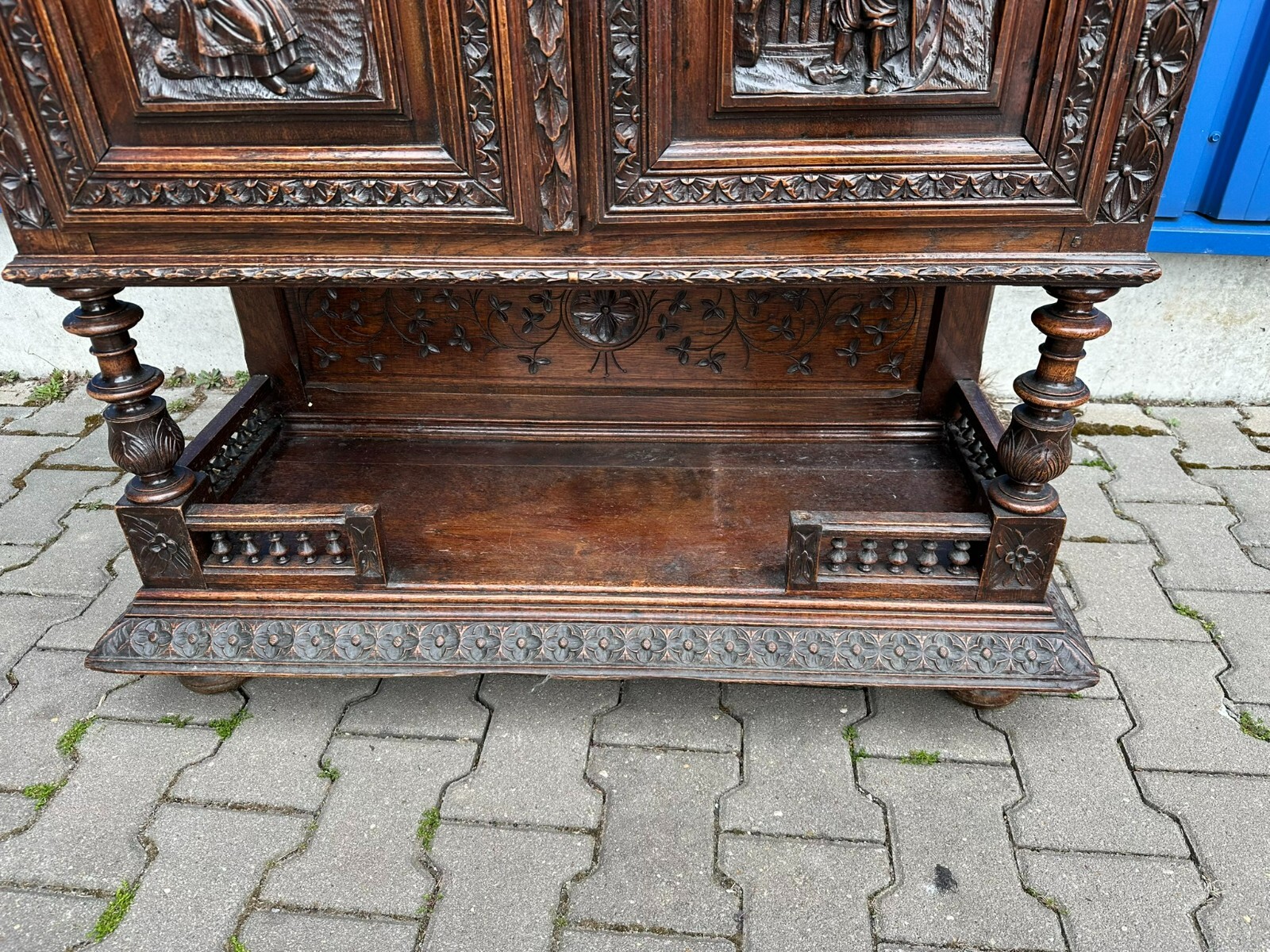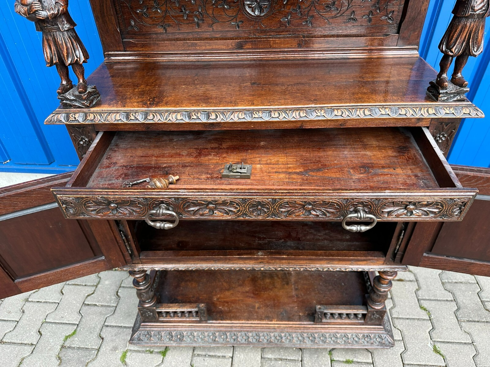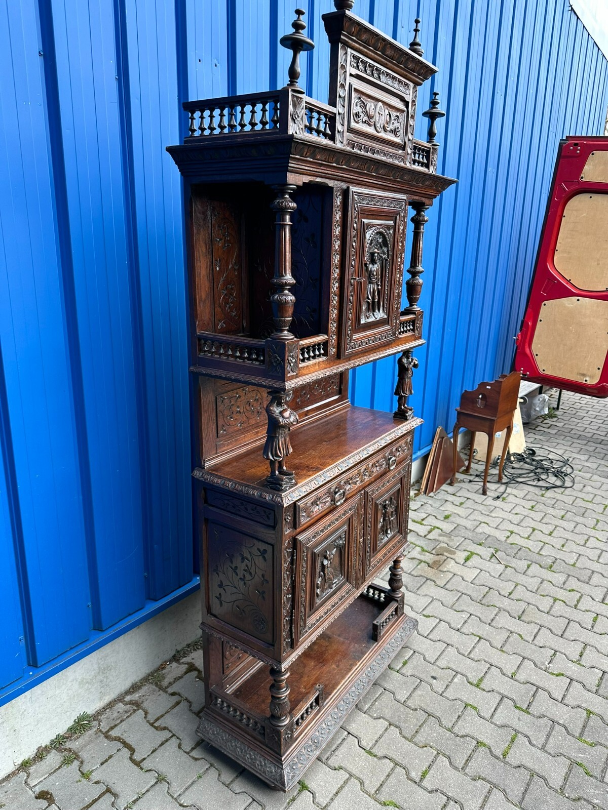 Sehr imposanter Historismus Schrank um 1880 aus Frankreich. Kastanienholz, komplett handgeschnitzt mit Figuren. An der linken mittleren Figur Tröte fehlend. Die unterste Leiste stärker berieben und bestossen, unten zwei mittlere Zapfen ebenfalls fehlend. Am Schnitzwerk insgesamt kleiner Unvollständigkeiten (Hüte, Leisten etc.) Die mittlere und die untere Ablage zum Teil berieben. Am Mittelteil wurde das Schloß ausgebaut, dieses liegt lose bei und hat wohl keine Funktion. Die Türen sind insgesamt aus den Scharnieren wacklig und müssen leicht angehoben werden, eine normale Funktionalität wird jedoch gewährleistet. Der oberste Kranz kann abgenommen werden, das restliche Möbel (hat dann eine Höhe von 202cm) ist am Stück. Abmessungen BTH 107/40/245cm.