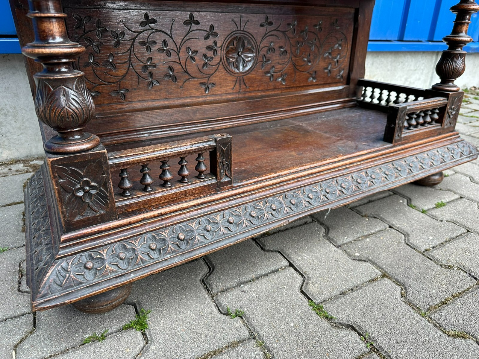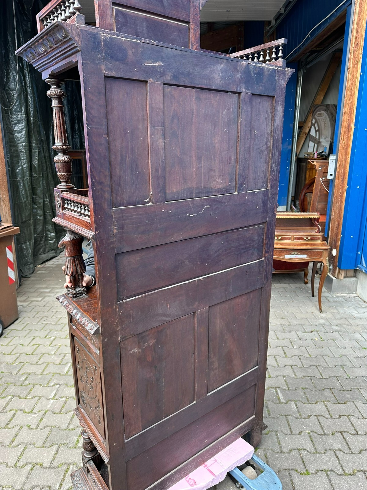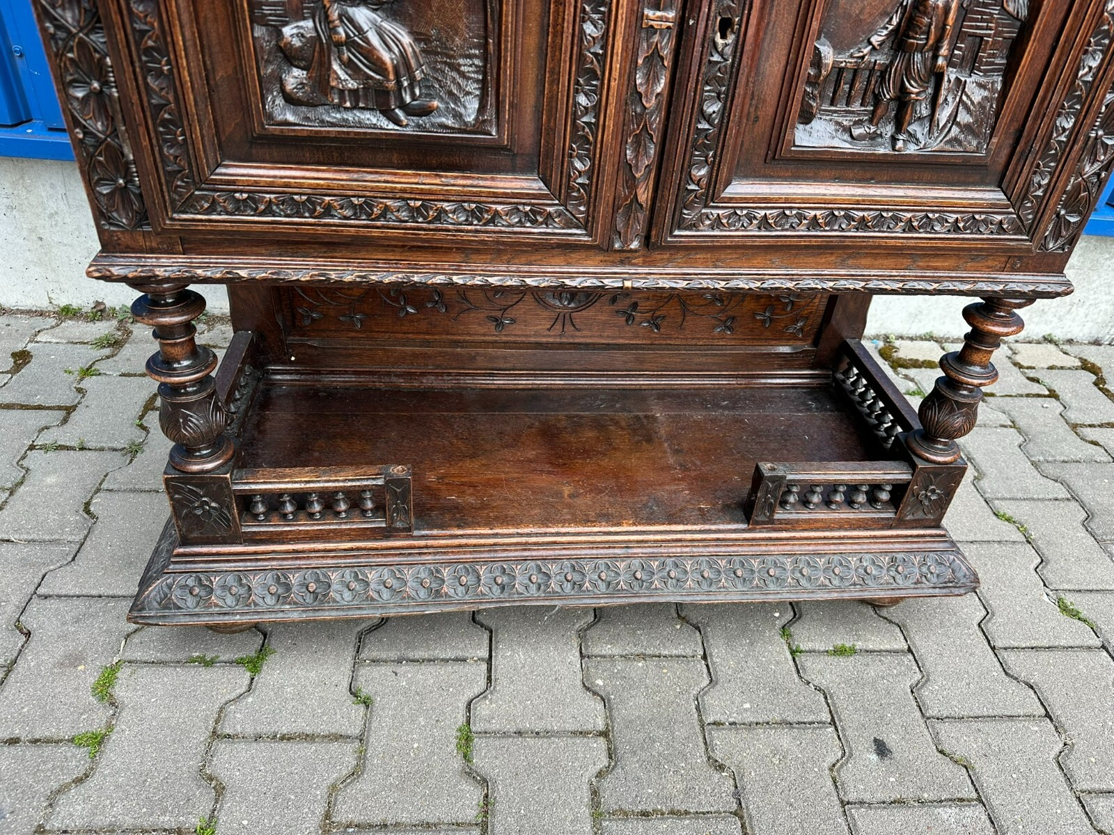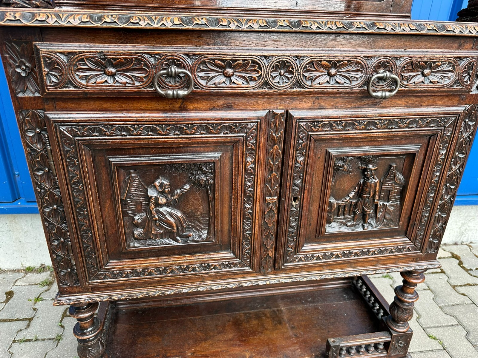 Sehr imposanter Historismus Schrank um 1880 aus Frankreich. Kastanienholz, komplett handgeschnitzt mit Figuren. An der linken mittleren Figur Tröte fehlend. Die unterste Leiste stärker berieben und bestossen, unten zwei mittlere Zapfen ebenfalls fehlend. Am Schnitzwerk insgesamt kleiner Unvollständigkeiten (Hüte, Leisten etc.) Die mittlere und die untere Ablage zum Teil berieben. Am Mittelteil wurde das Schloß ausgebaut, dieses liegt lose bei und hat wohl keine Funktion. Die Türen sind insgesamt aus den Scharnieren wacklig und müssen leicht angehoben werden, eine normale Funktionalität wird jedoch gewährleistet. Der oberste Kranz kann abgenommen werden, das restliche Möbel (hat dann eine Höhe von 202cm) ist am Stück. Abmessungen BTH 107/40/245cm.