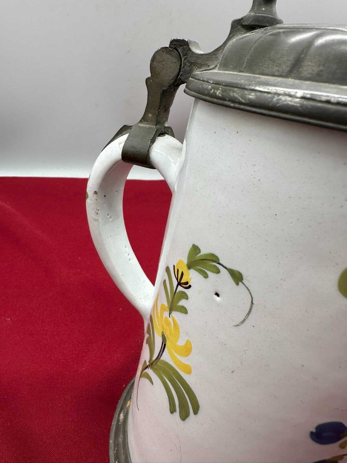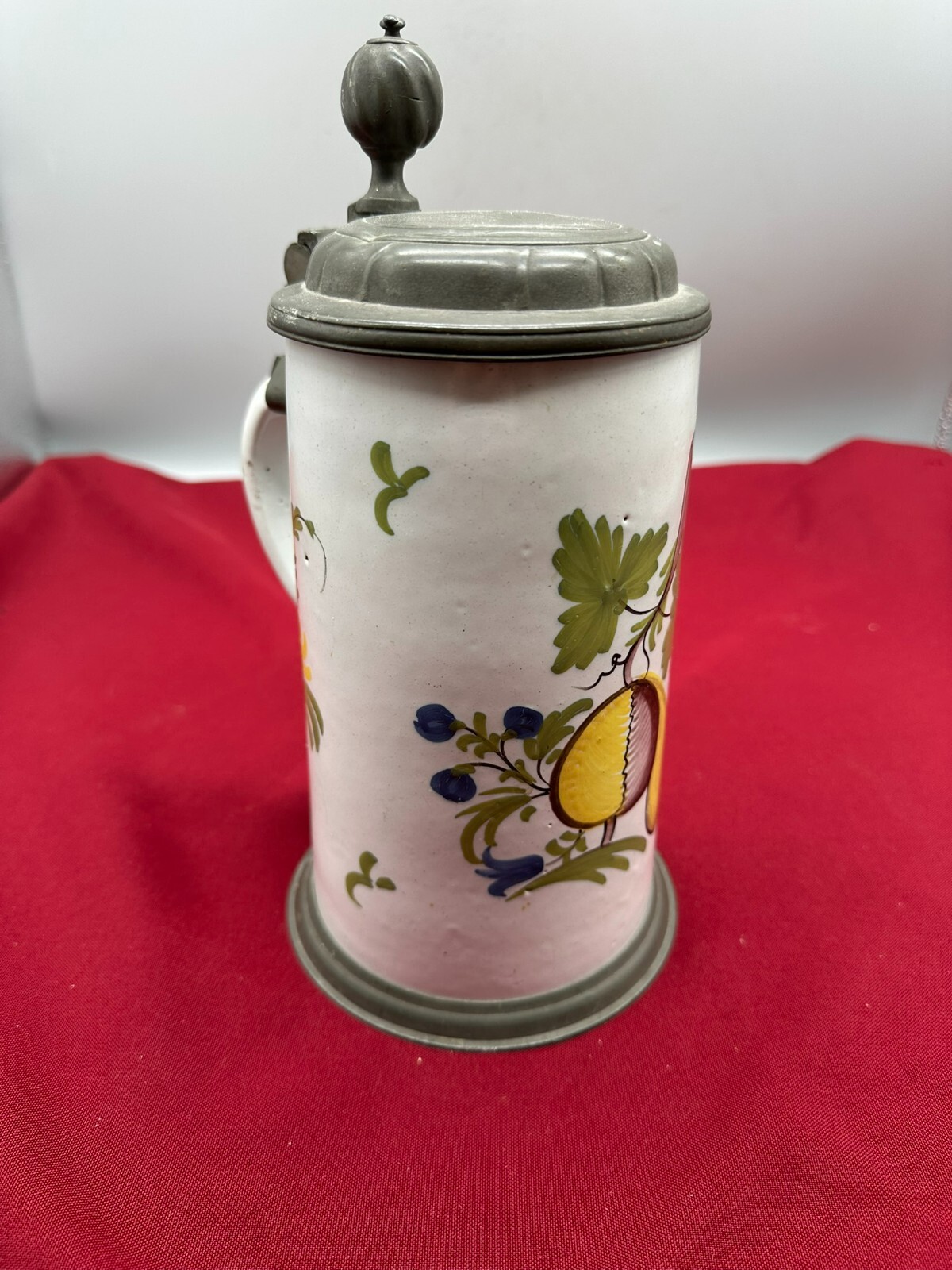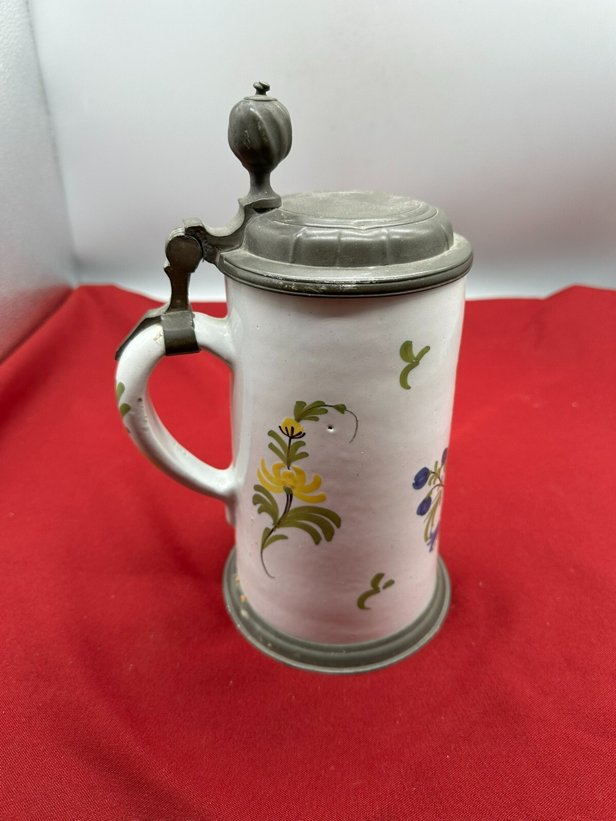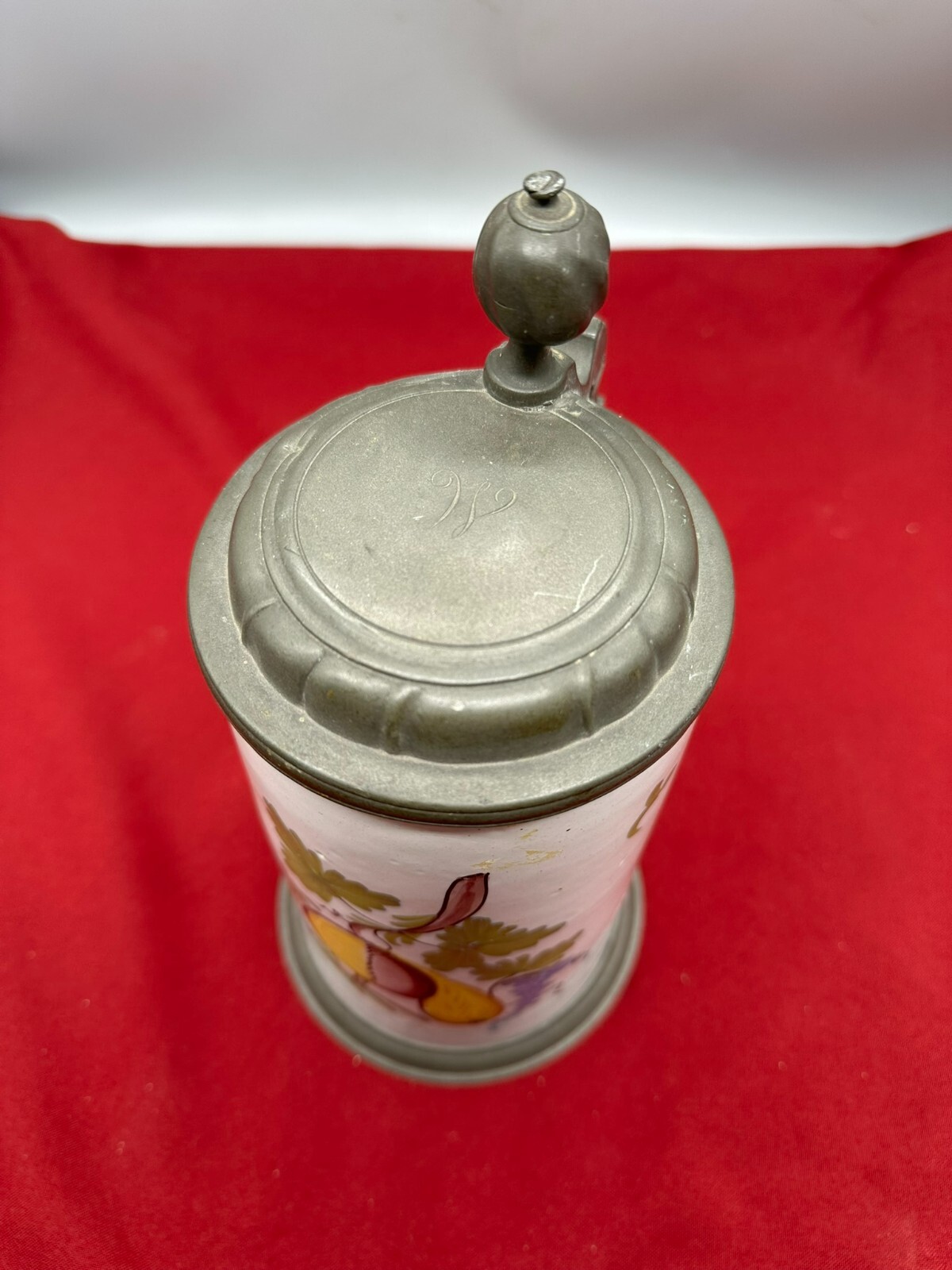 Humpen aus Keramik, im barocken Stile angefertigt mit Zinnmontur mit Monogramm, diese berieben und zum Teil verdellt. Wohl 19-tes Jhdt. Unten am Boden Haarrisse in der Glasur, am Hals kleine Chips. Daumenrast altgelötet. Höhe/Durchmesser 25/13cm.