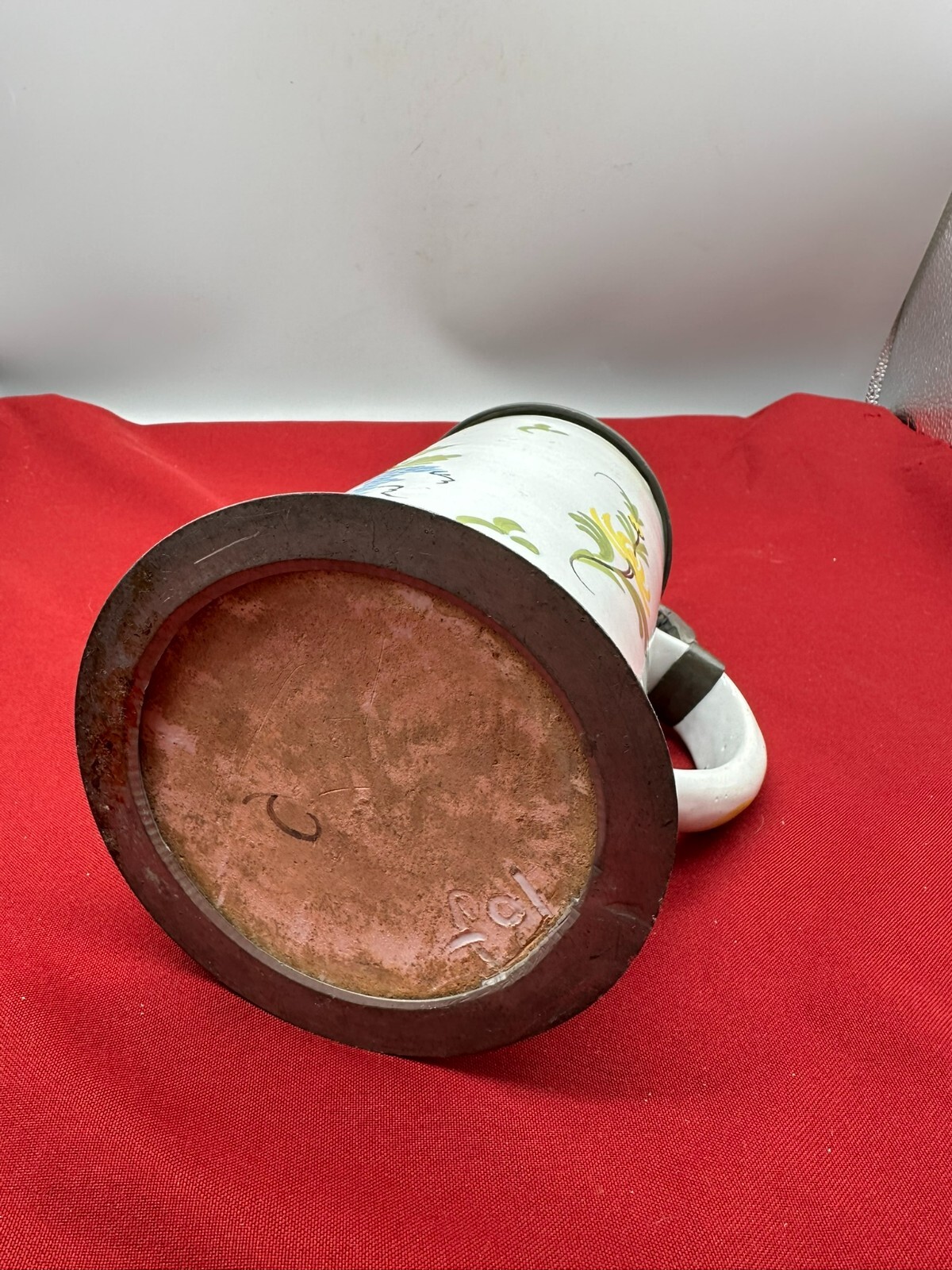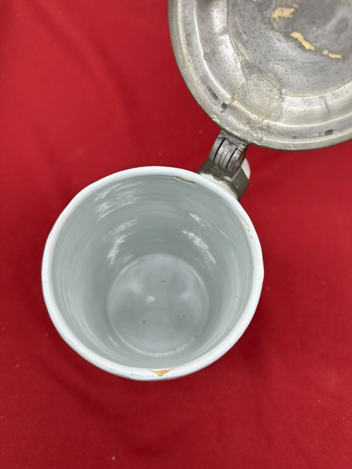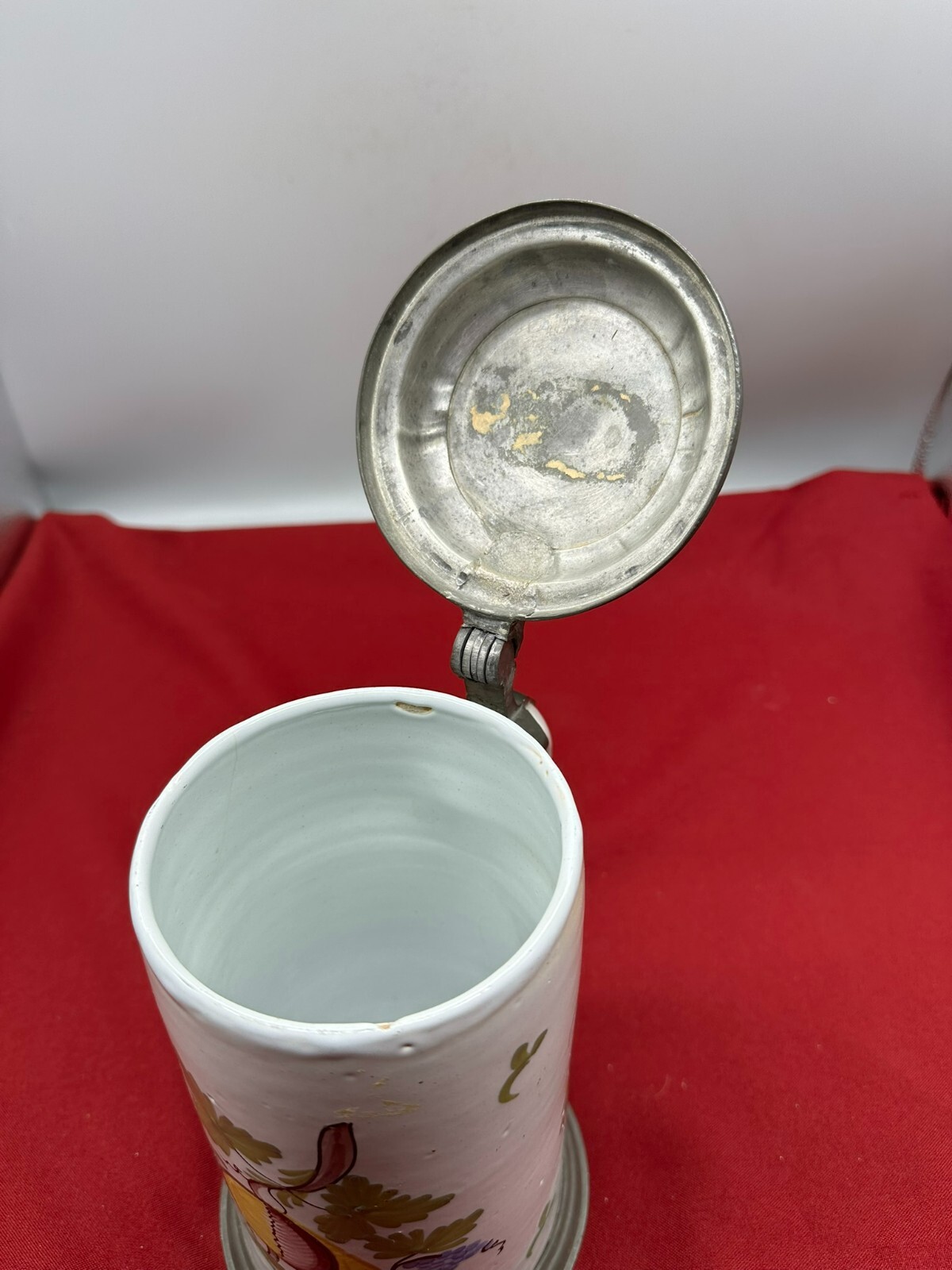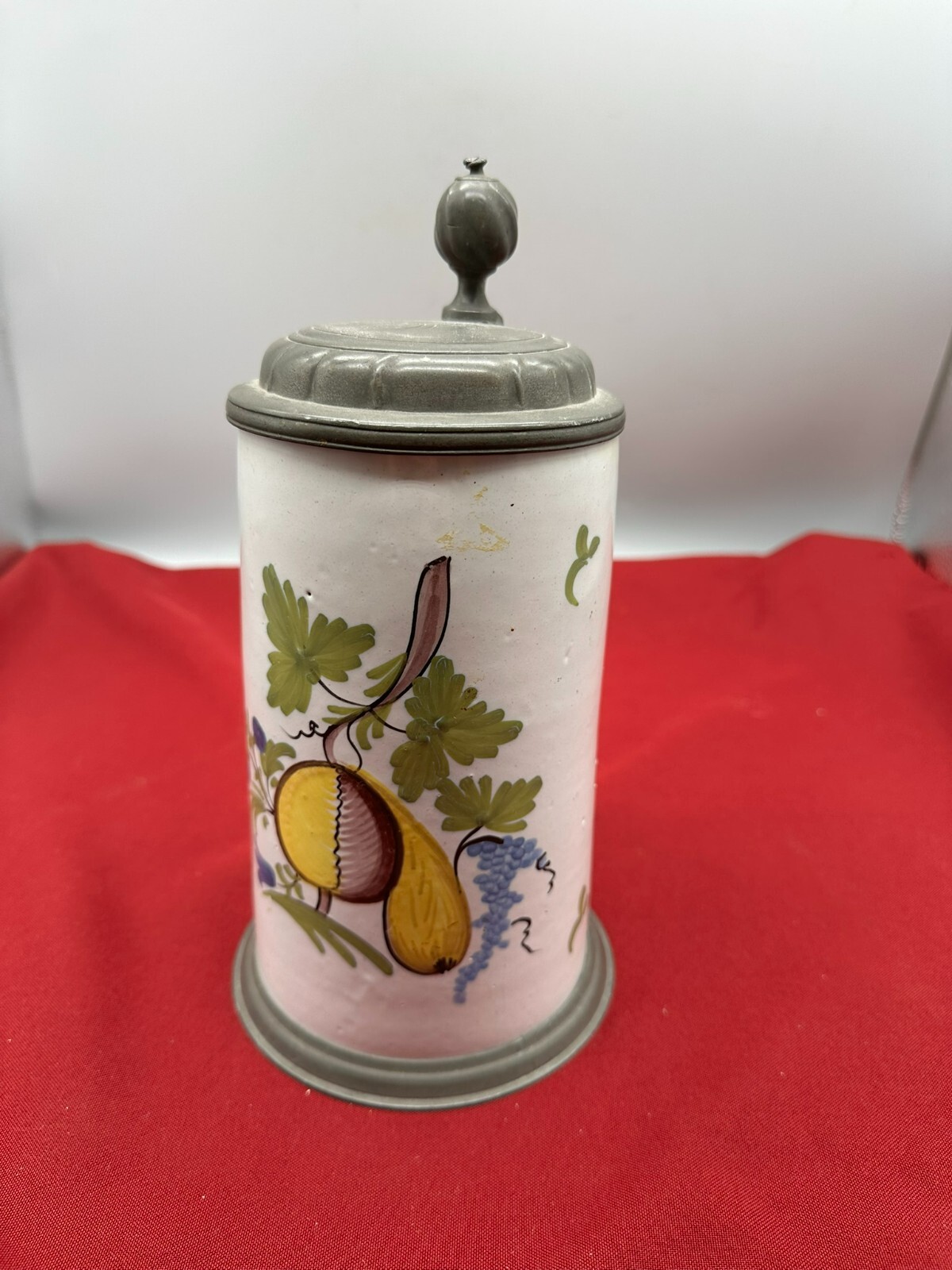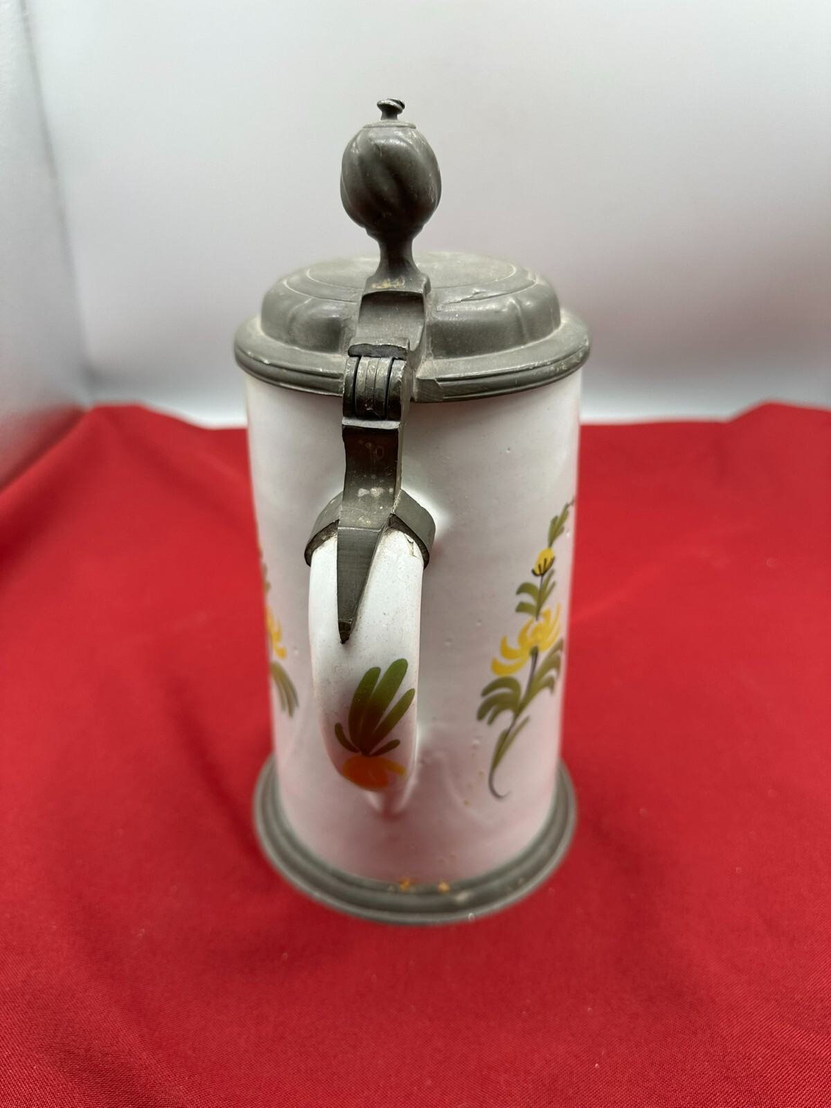 Humpen aus Keramik, im barocken Stile angefertigt mit Zinnmontur mit Monogramm, diese berieben und zum Teil verdellt. Wohl 19-tes Jhdt. Unten am Boden Haarrisse in der Glasur, am Hals kleine Chips. Daumenrast altgelötet. Höhe/Durchmesser 25/13cm.