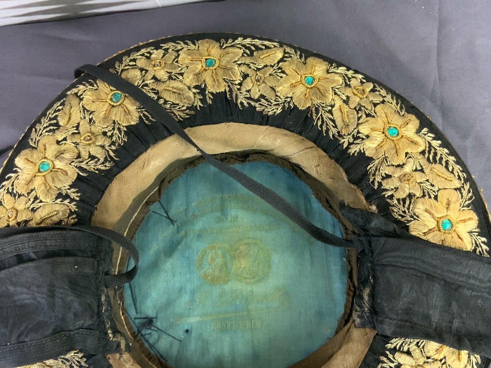 Inntaler Trachtenhut von J. Driendl, Rosenheim. Schwarzer Samt mit Goldstickerei. Alter Trachtenhut für Damen aus dem Hutgeschäft J. Driendl, Rosenheim. Reich verzierter und bestickter Hut mit langen Bändern und Quasten. Altersbedingter guter Zustand, Randbordüre beschädigt. Deutschland, Ende 19./Anfang 20. Jh. H x Ø ca. 5 x 28 cm, Kopfaufnahme 15cm.