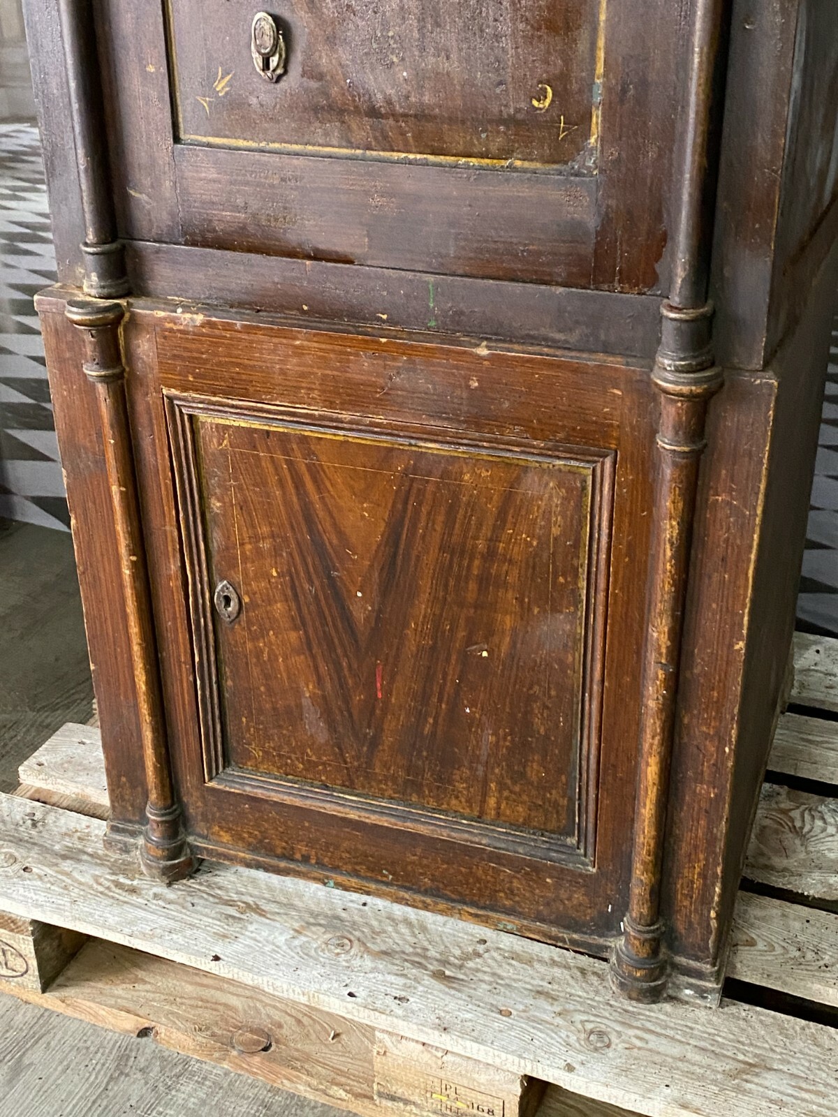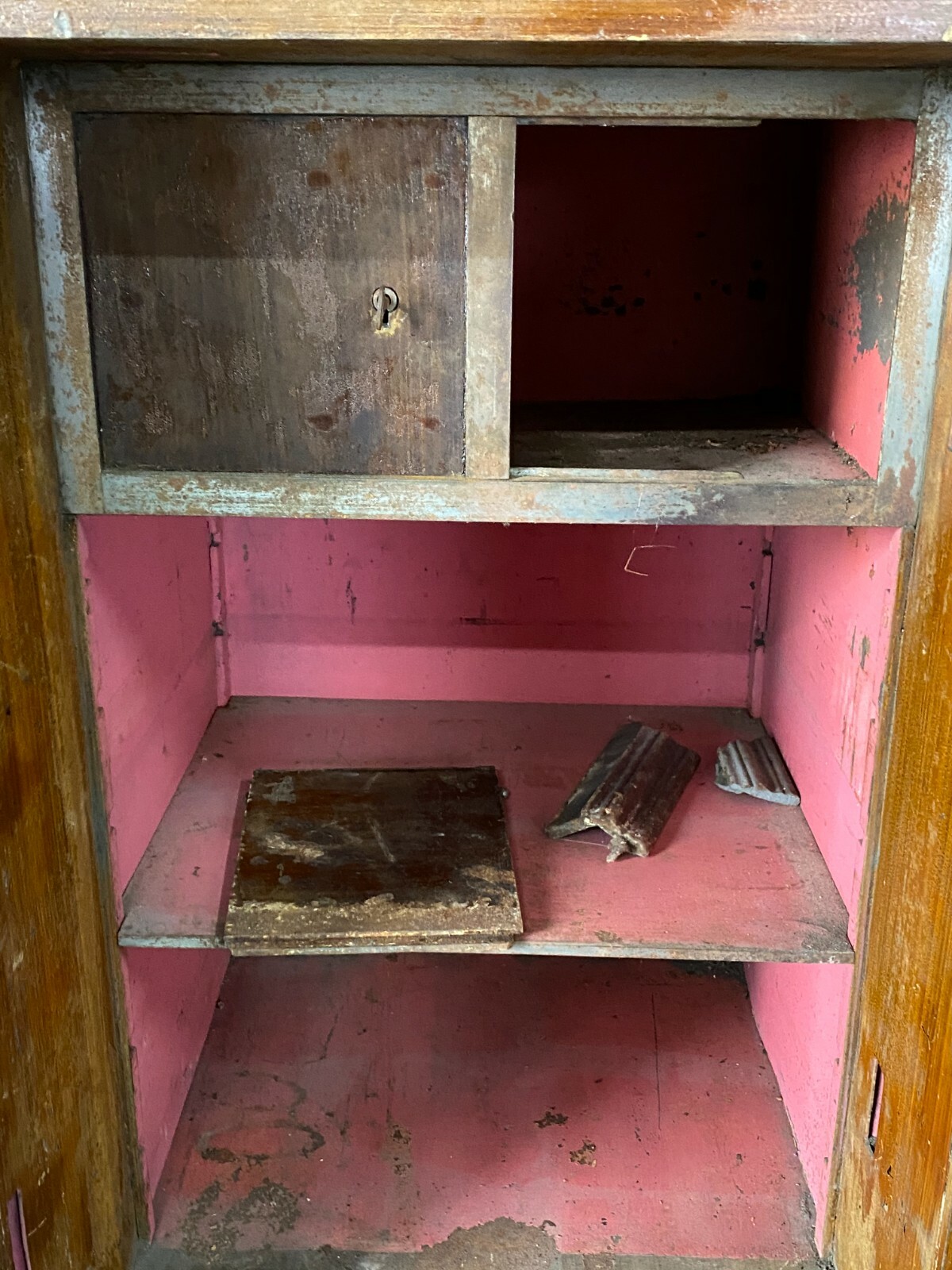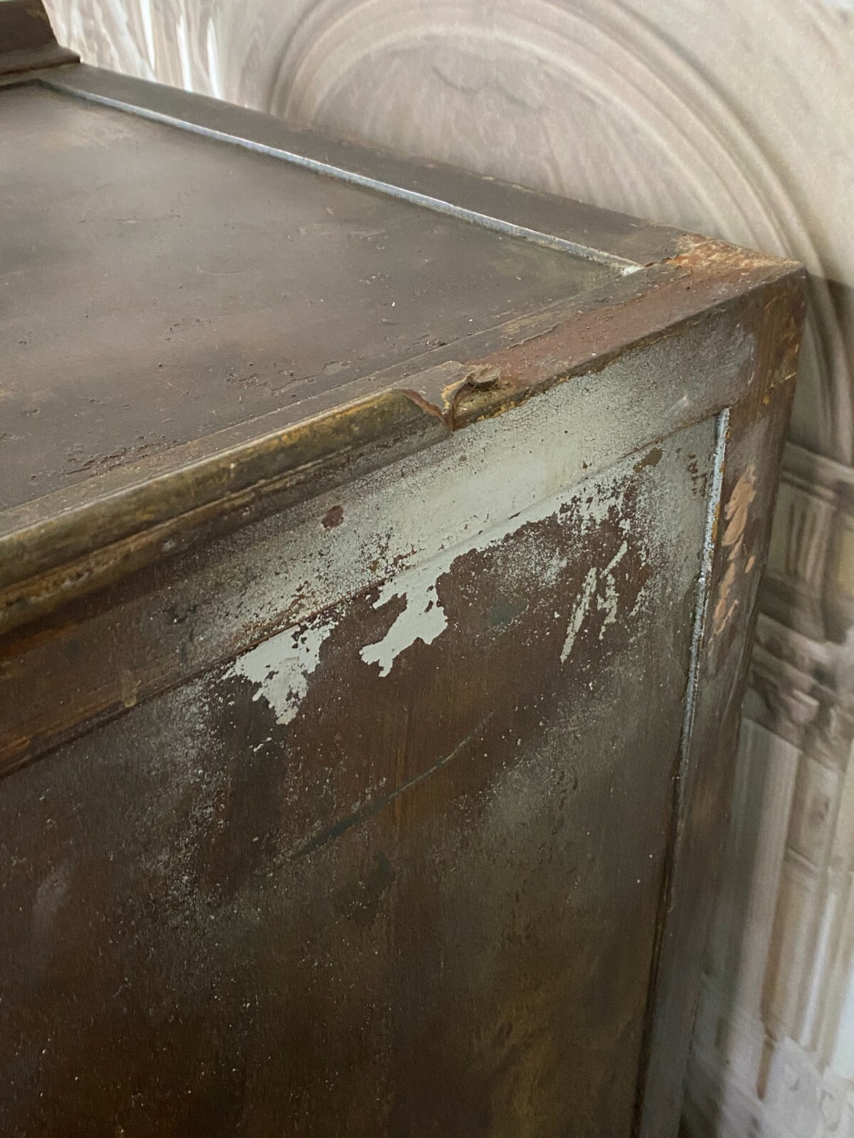 Antiker Tresor aus der Jugendstilzeit Anfang 20. Jahrhundert. Der Tresor ist zweiteilig, der Unterschrank ist aus Holz, dafür ist kein Schlüssel vorgesehen. Das Oberteil ist aus massivem Metall. Ein Hauptschlüssel vorhanden. Der Tresor lässt sich betätigen, der Schlüssel steckt jedoch fest und lässt sich nicht herausziehen, die Funktion der anderen beiden Schlösser kann somit nicht getestet werden. Der Innenraum wurde mal überfasst, die Farbe blättert hier ab. Für das obere Fach ist zwar ein Schlüssel vorhanden, dieser ist jedoch nicht passend oder das Schloss ist fest, der rechte Türflügel ist hier vorhanden, muss nur eingesetzt werden. An der Oberfläche wurde der Tresor teilweise mit Lack überzogen, dieser ist gekrauselt und die Farbe zum Teil unvollständig. Der Tresor hat an der rechten Seite Dellen und die obere Dachleiste ist beschädigt im hinteren Bereich. Die gebrochenen Stücke sind vorhanden. Uns ist nicht bekannt ob zum Betätigen des oberen und unteren Schlosses ein anderer Schlüssel notwendig ist. Der Tresor wird als nicht funktionsfähiges Restaurationsobjekt angeboten. Abmessungen BTH: 66x63x156cm, Höhe ohne Unterschrank: 94cm. Innenraumtiefe: 30cm, Höhe bis zum oberen Fach: 42cm. Die Metallteile sind zum Teil angelaufen und leicht korrodiert, zum Abladen wird zwingend ein Gabelstabler benötigt. Lieferung ohne Ladebordwand.