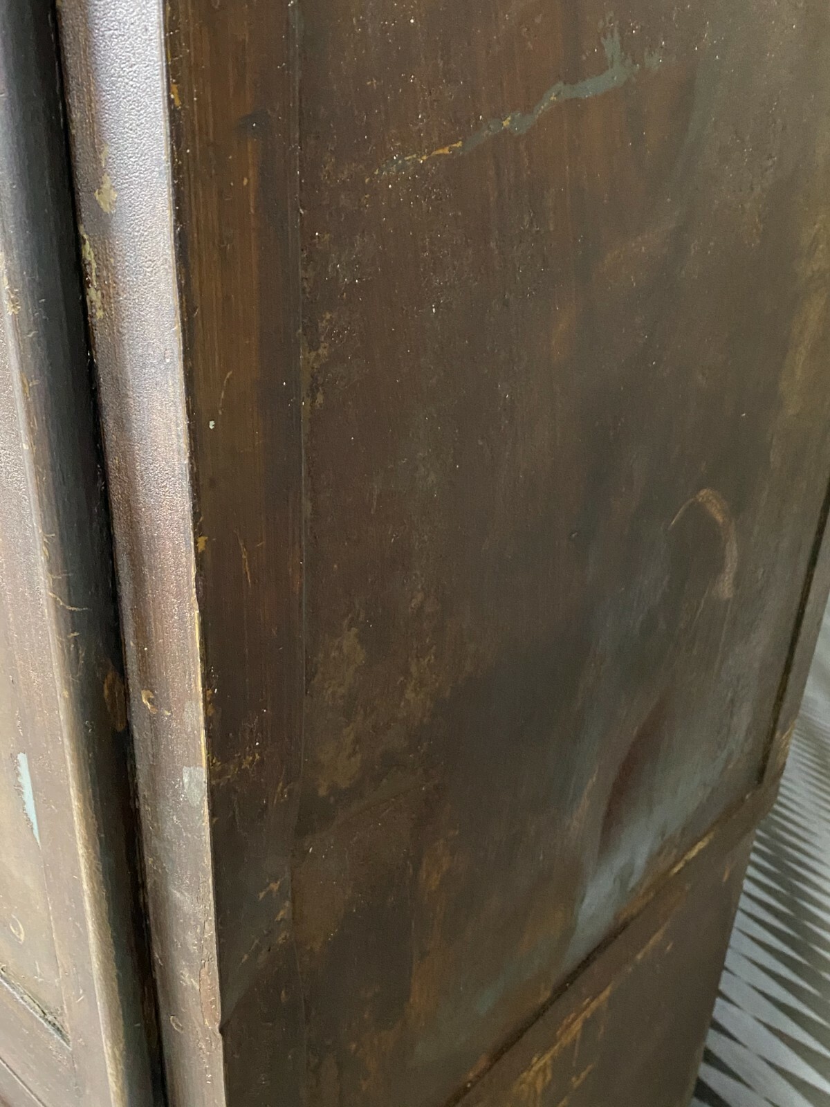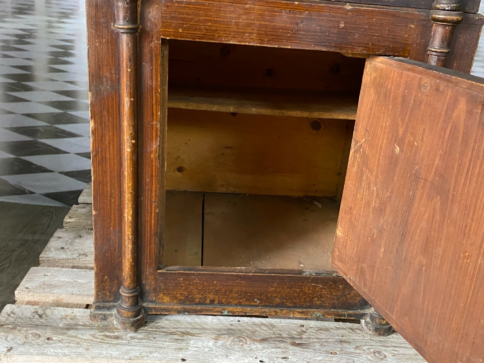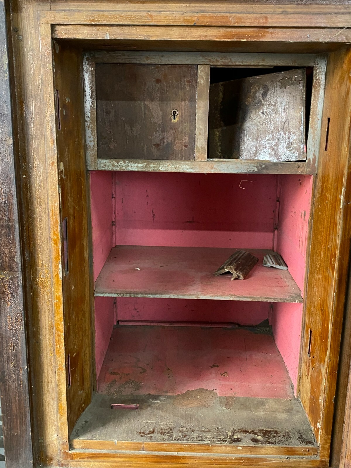 Antiker Tresor aus der Jugendstilzeit Anfang 20. Jahrhundert. Der Tresor ist zweiteilig, der Unterschrank ist aus Holz, dafür ist kein Schlüssel vorgesehen. Das Oberteil ist aus massivem Metall. Ein Hauptschlüssel vorhanden. Der Tresor lässt sich betätigen, der Schlüssel steckt jedoch fest und lässt sich nicht herausziehen, die Funktion der anderen beiden Schlösser kann somit nicht getestet werden. Der Innenraum wurde mal überfasst, die Farbe blättert hier ab. Für das obere Fach ist zwar ein Schlüssel vorhanden, dieser ist jedoch nicht passend oder das Schloss ist fest, der rechte Türflügel ist hier vorhanden, muss nur eingesetzt werden. An der Oberfläche wurde der Tresor teilweise mit Lack überzogen, dieser ist gekrauselt und die Farbe zum Teil unvollständig. Der Tresor hat an der rechten Seite Dellen und die obere Dachleiste ist beschädigt im hinteren Bereich. Die gebrochenen Stücke sind vorhanden. Uns ist nicht bekannt ob zum Betätigen des oberen und unteren Schlosses ein anderer Schlüssel notwendig ist. Der Tresor wird als nicht funktionsfähiges Restaurationsobjekt angeboten. Abmessungen BTH: 66x63x156cm, Höhe ohne Unterschrank: 94cm. Innenraumtiefe: 30cm, Höhe bis zum oberen Fach: 42cm. Die Metallteile sind zum Teil angelaufen und leicht korrodiert, zum Abladen wird zwingend ein Gabelstabler benötigt. Lieferung ohne Ladebordwand.