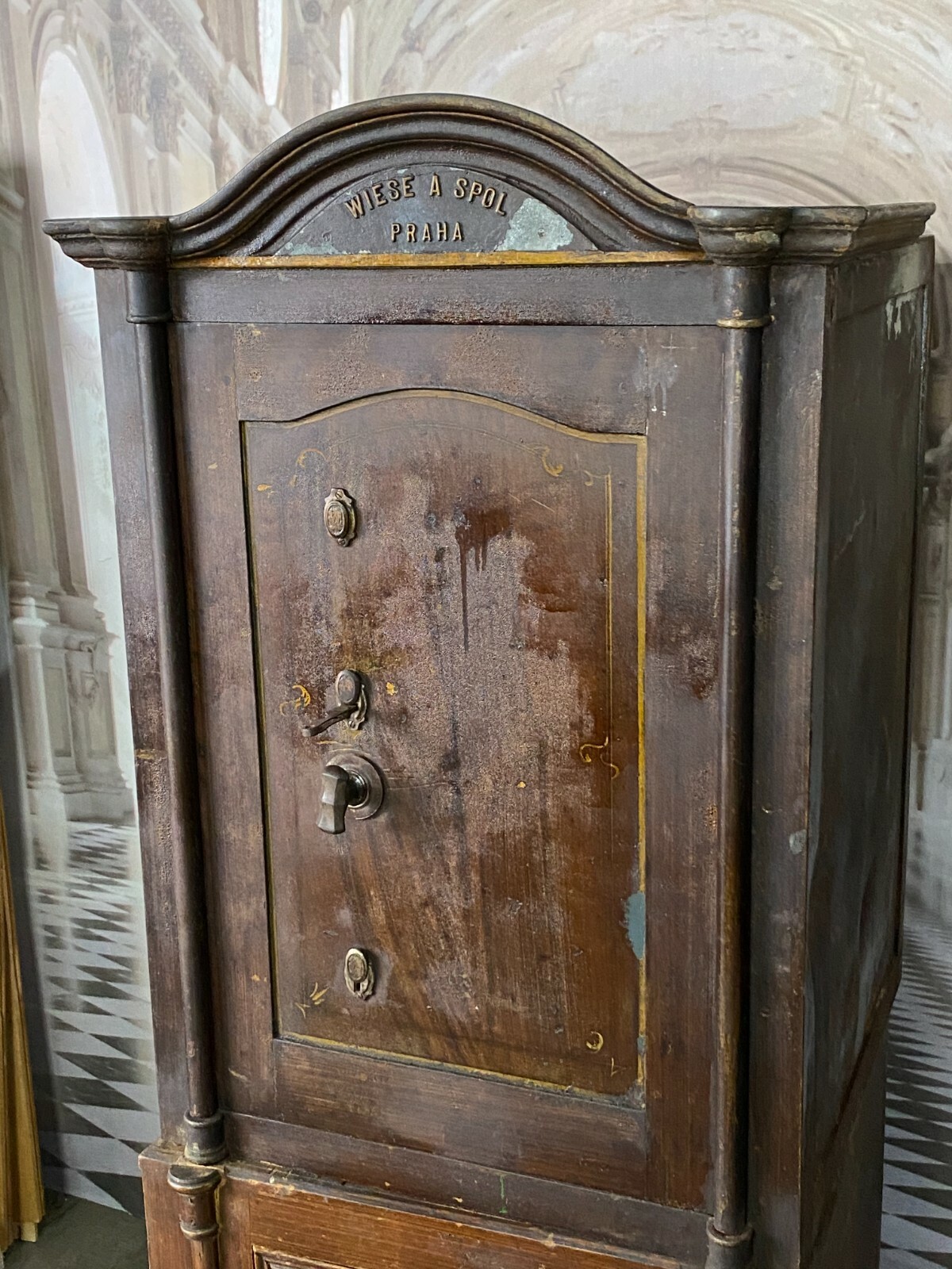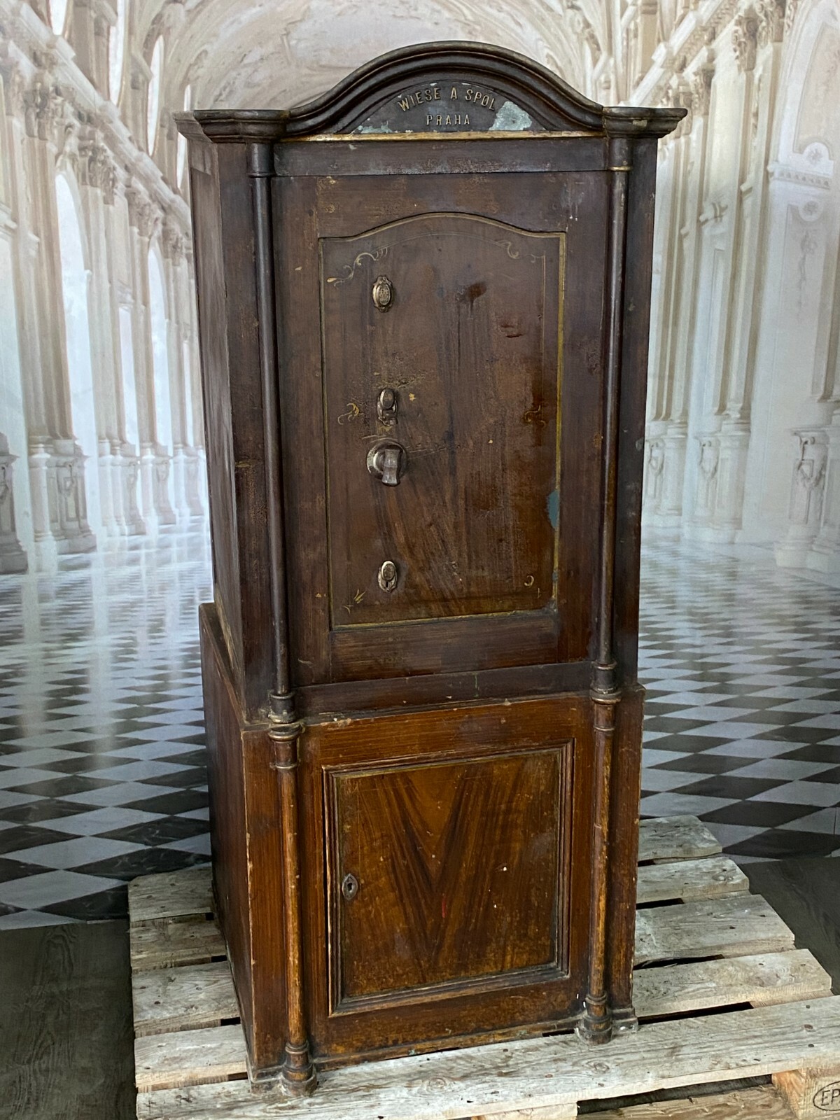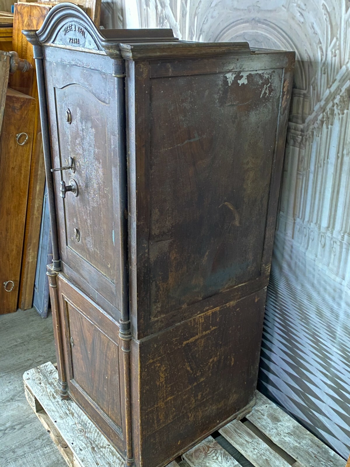 ANTIKER JUGENDSTIL TRESOR WIESE SPOL PRAG METALLGUSS MIT UNTERSCHRANK