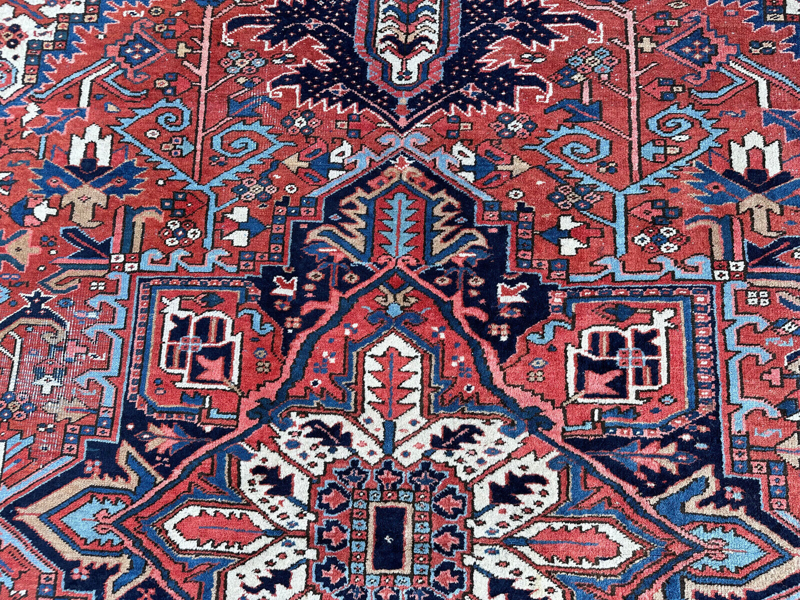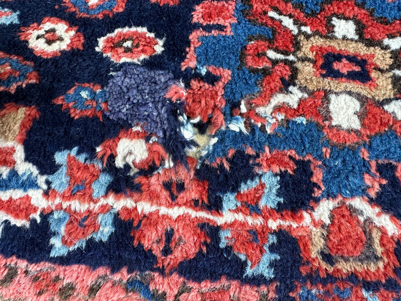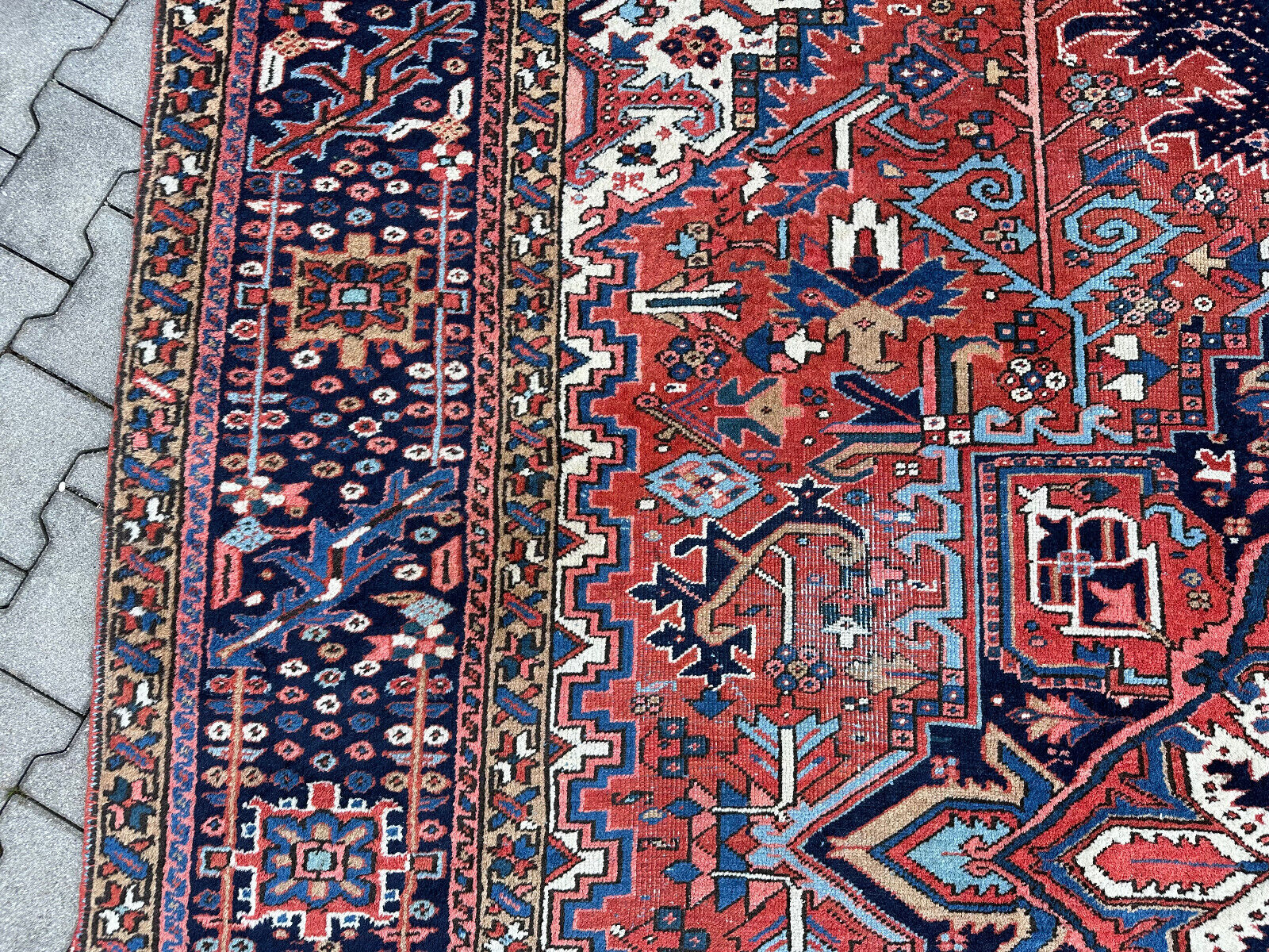 Sehr grosser antiker Kasak Teppich aus Wolle, wohl erste Hälfte 20-tes Jhdt. An vielen Stellen bis zum Grundgewebe verschlissen, ein Loch, teils altgenähte Risse etc. Fransen verschlissen, der untere Fransenrand lose und eingerissen an mehreren Stellen, der obere altbefestigt. Ränder sonst teils lose, Oberfläche teils fleckig. Abmessungen 400x306cm INKLUSIVE Fransen. Der Teppich ist nicht gereinigt und riecht weder nach Rauch noch nach Haustieren.