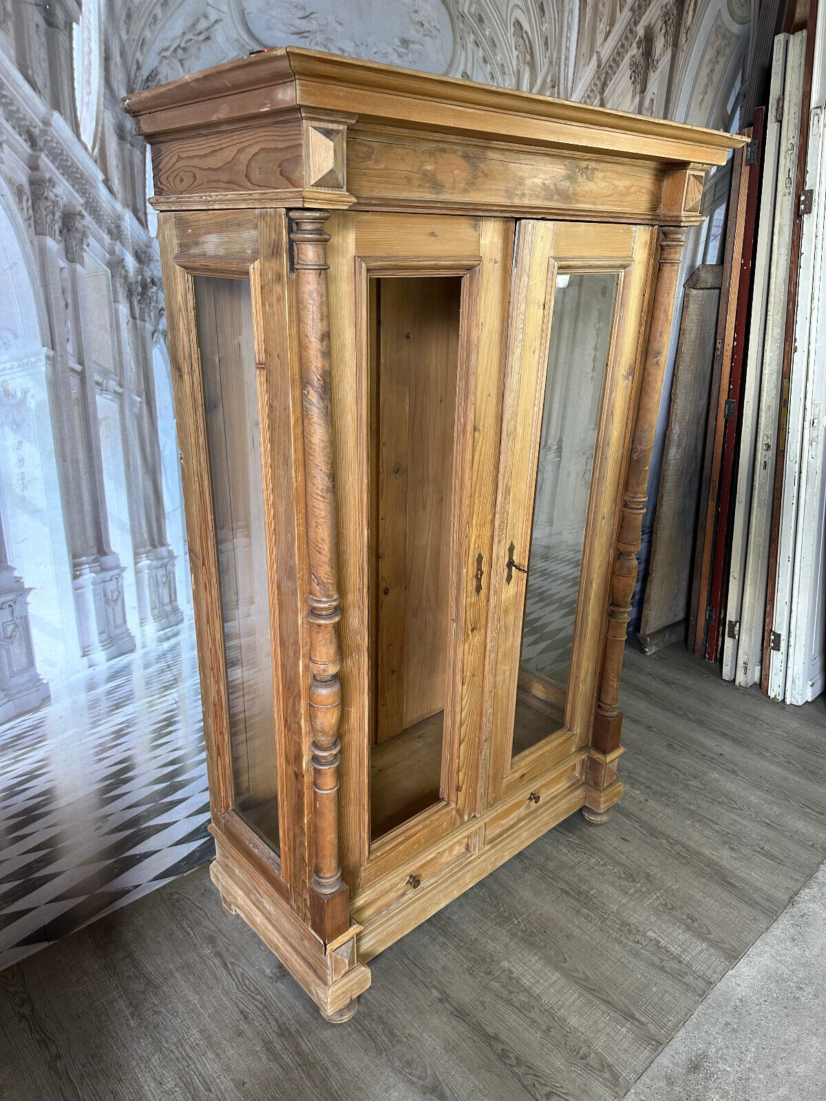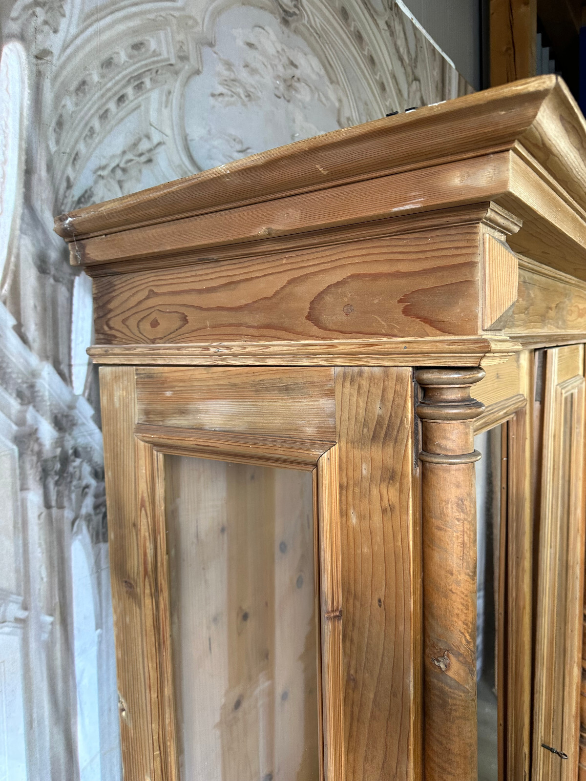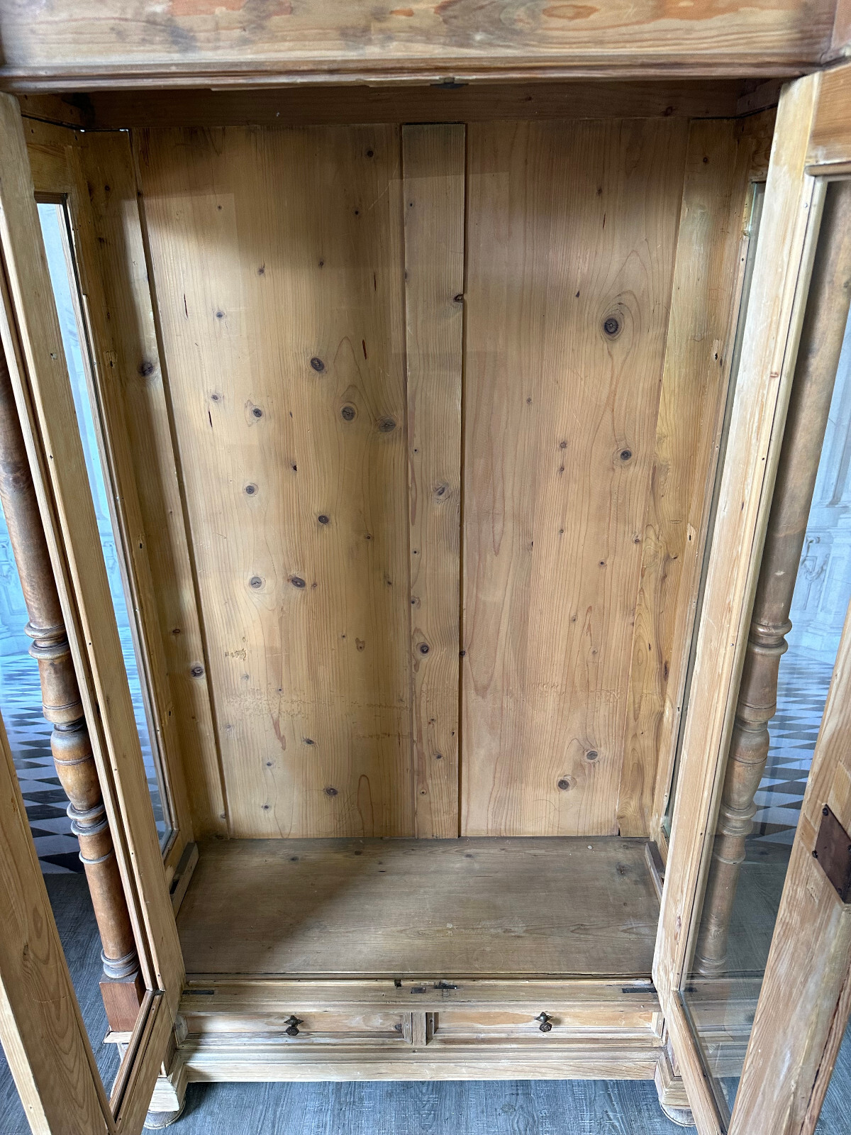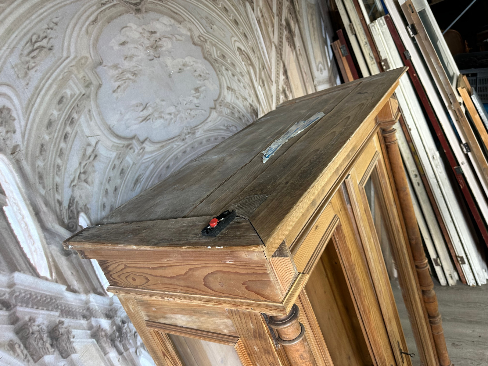 Antiker ehemaliger Kleiderschrank aus massivem Weichholz, Gründerzeit um 1890. Der Schrank wurde komplett abgeschliffen. Die seitlichen Kassetten und an den Türen wurden durch Glas ersetzt, die linke Tür hat aktuell KEINE Scheibe. Alle Leisten bestoßen und zum Teil unvollständig, Oberfläche zum Teil fleckig. Die rechte Tür ist leicht in sich gewölbt, oben ragt diese leicht raus. Am Dach und an der Bodenplatte Dehnungsrisse, die inneren Leisten um die Scheiben sind ebenfalls unvollständig. Der Schrank wurde mal elektrifiziert, die Elektrifizierung ist unvollständig. Schubladen mit Flecken und Dehnungsrissen. Die inneren Ablagebretter, so wie die vier Befestigungskeile sind nicht vorhanden. Stabiler Zustand Abmessungen BTH: 127x59x196cm. Der Schrank ist komplett zerlegbar und wird als unvollständiges Restaurationsobjekt angeboten.