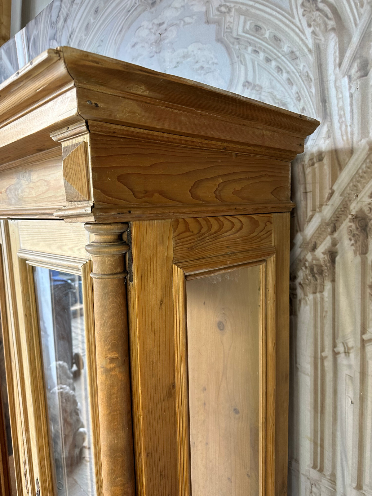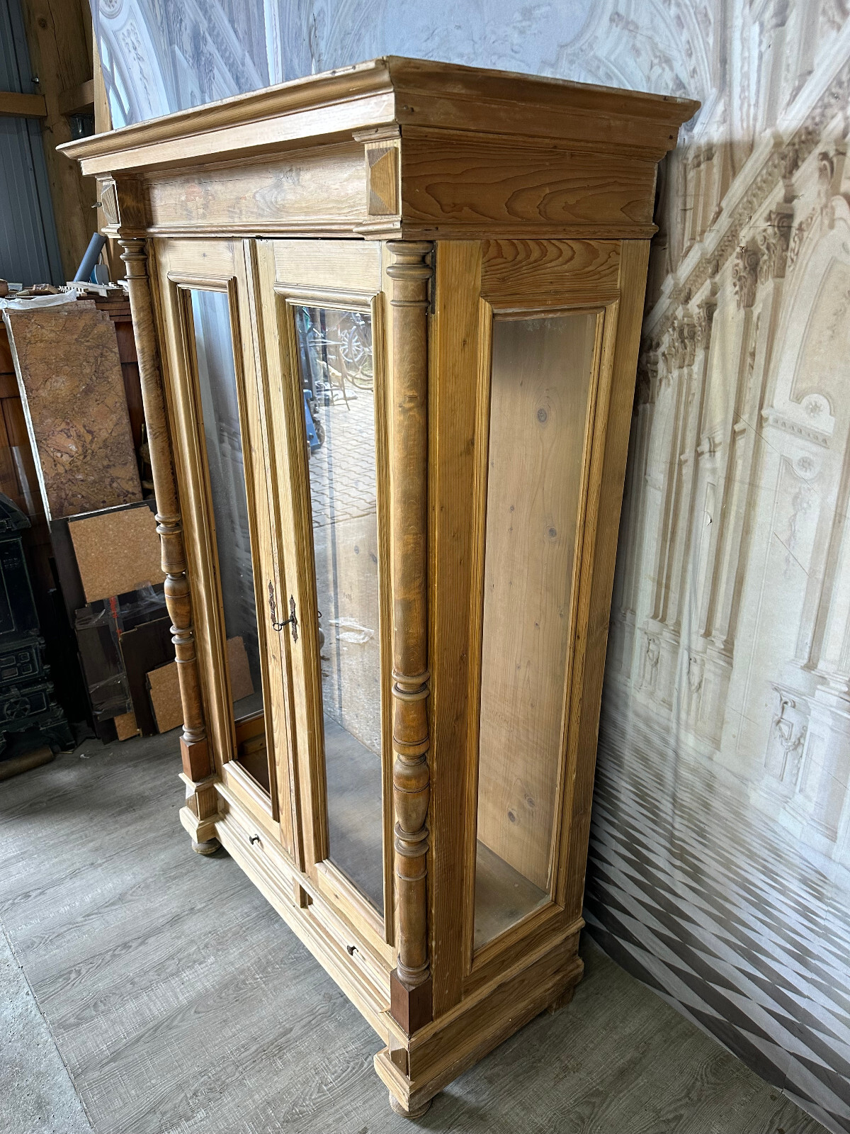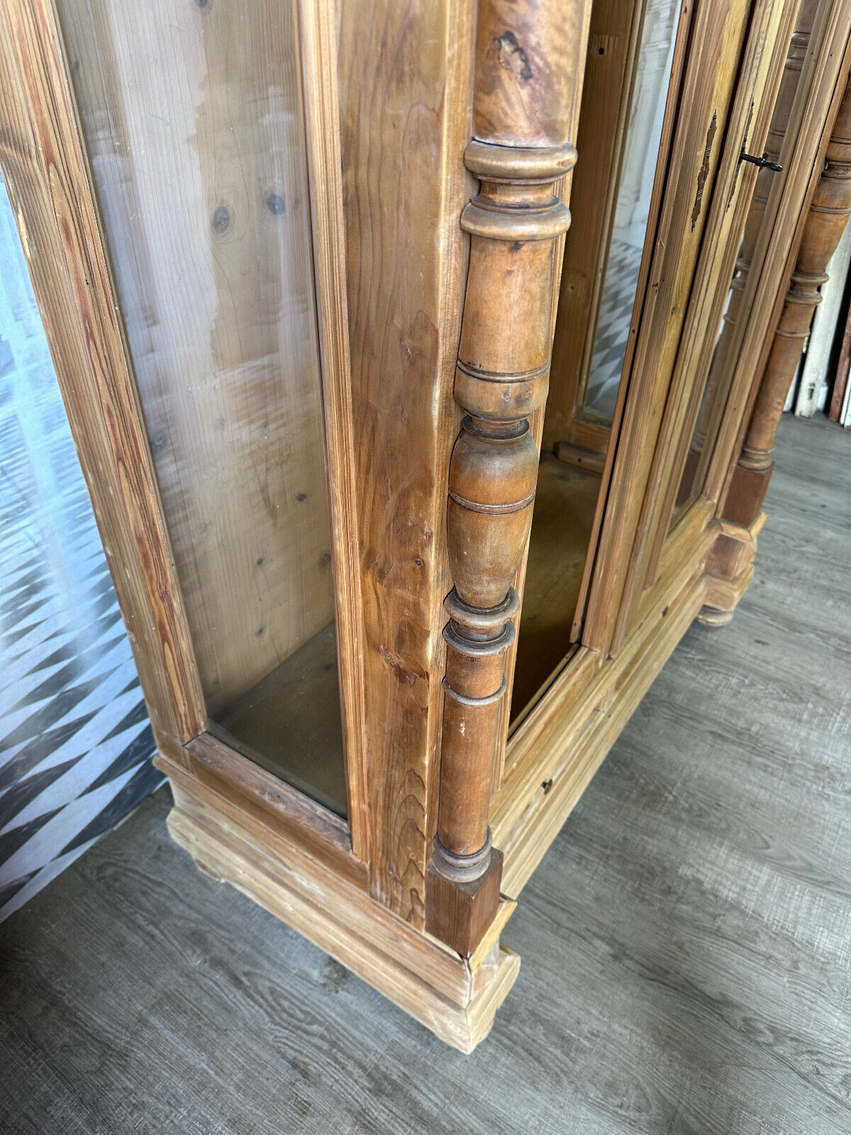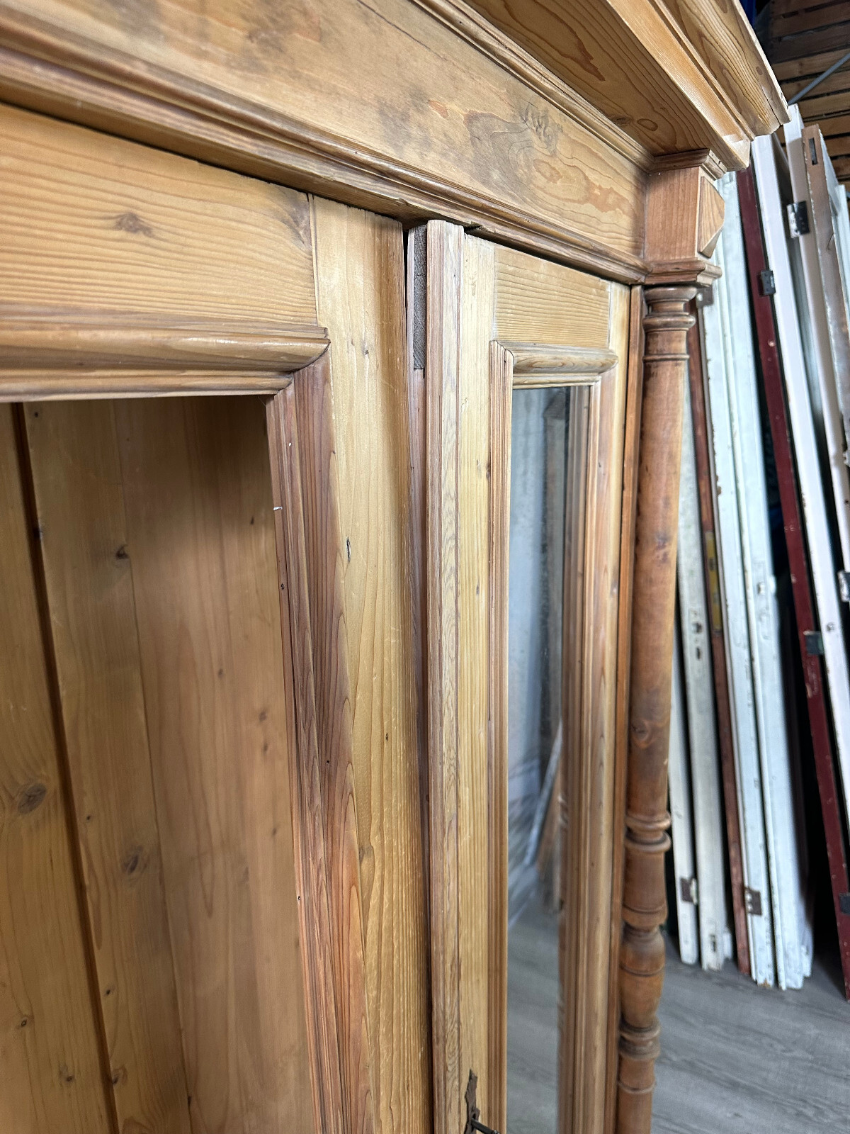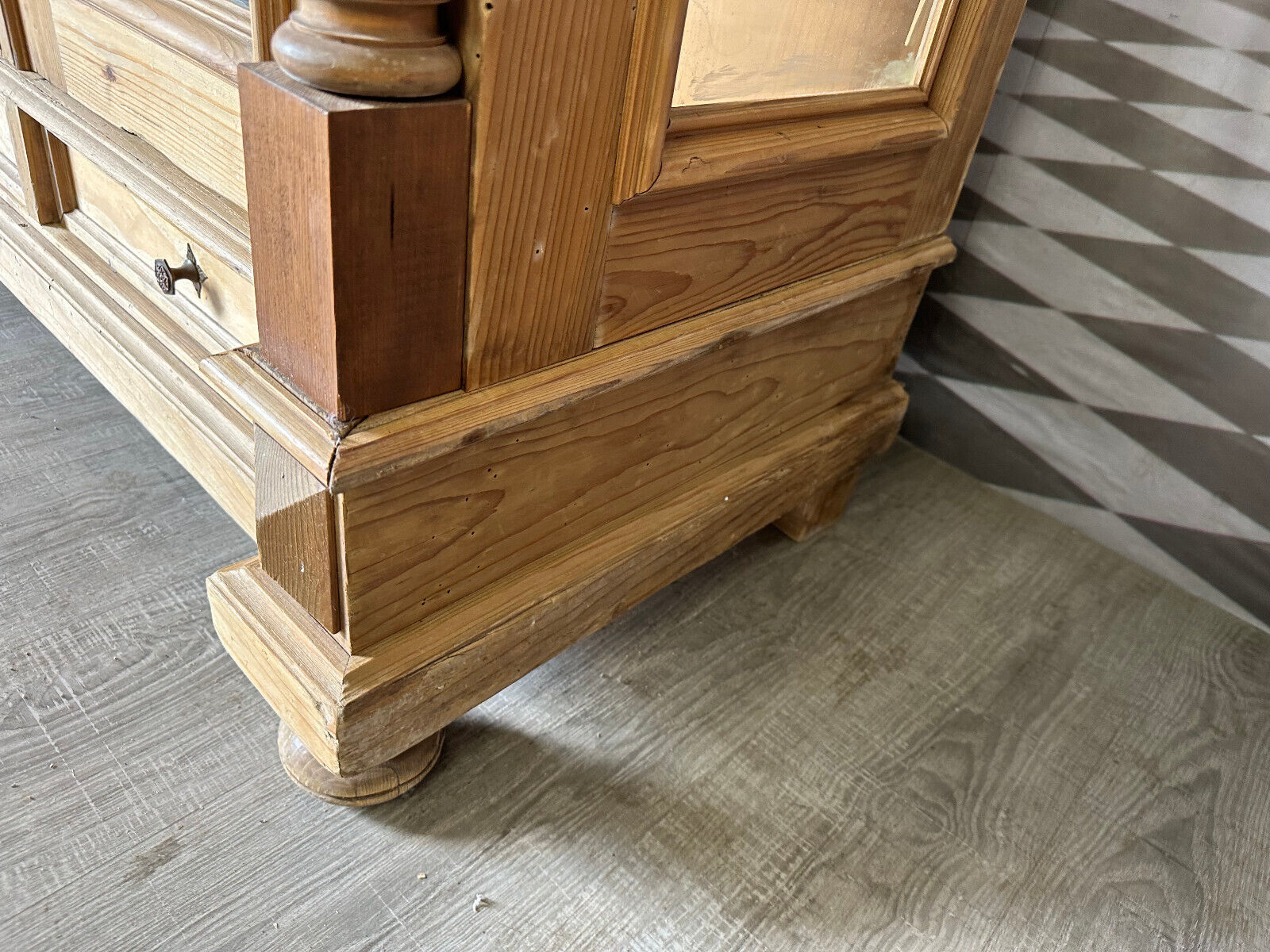 Antiker ehemaliger Kleiderschrank aus massivem Weichholz, Gründerzeit um 1890. Der Schrank wurde komplett abgeschliffen. Die seitlichen Kassetten und an den Türen wurden durch Glas ersetzt, die linke Tür hat aktuell KEINE Scheibe. Alle Leisten bestoßen und zum Teil unvollständig, Oberfläche zum Teil fleckig. Die rechte Tür ist leicht in sich gewölbt, oben ragt diese leicht raus. Am Dach und an der Bodenplatte Dehnungsrisse, die inneren Leisten um die Scheiben sind ebenfalls unvollständig. Der Schrank wurde mal elektrifiziert, die Elektrifizierung ist unvollständig. Schubladen mit Flecken und Dehnungsrissen. Die inneren Ablagebretter, so wie die vier Befestigungskeile sind nicht vorhanden. Stabiler Zustand Abmessungen BTH: 127x59x196cm. Der Schrank ist komplett zerlegbar und wird als unvollständiges Restaurationsobjekt angeboten.