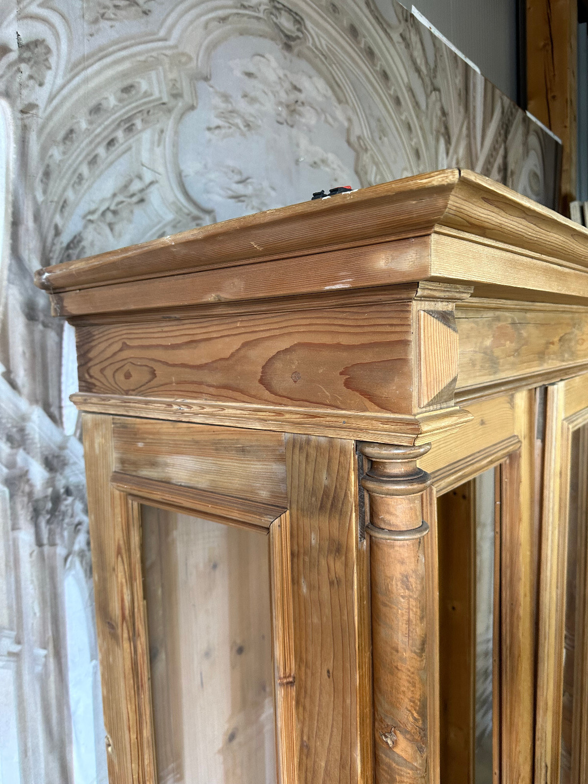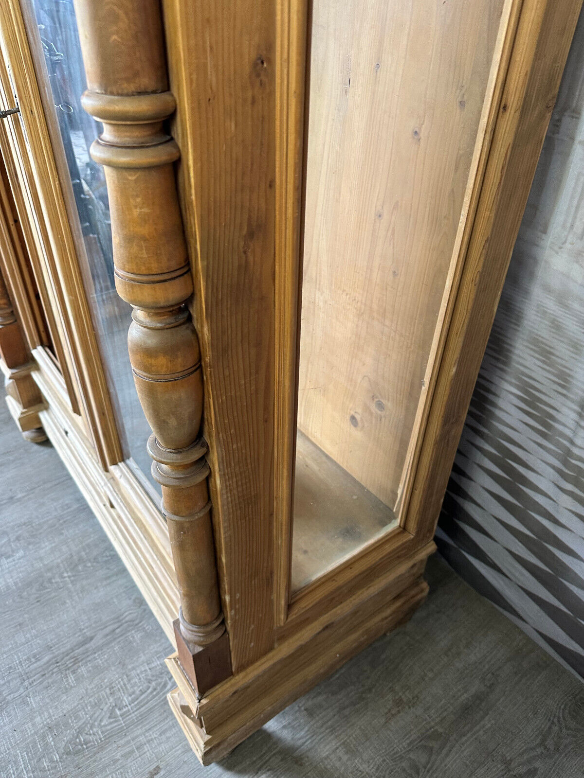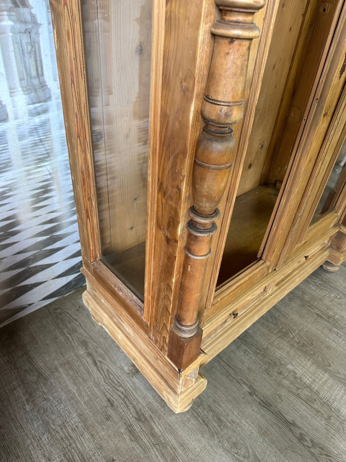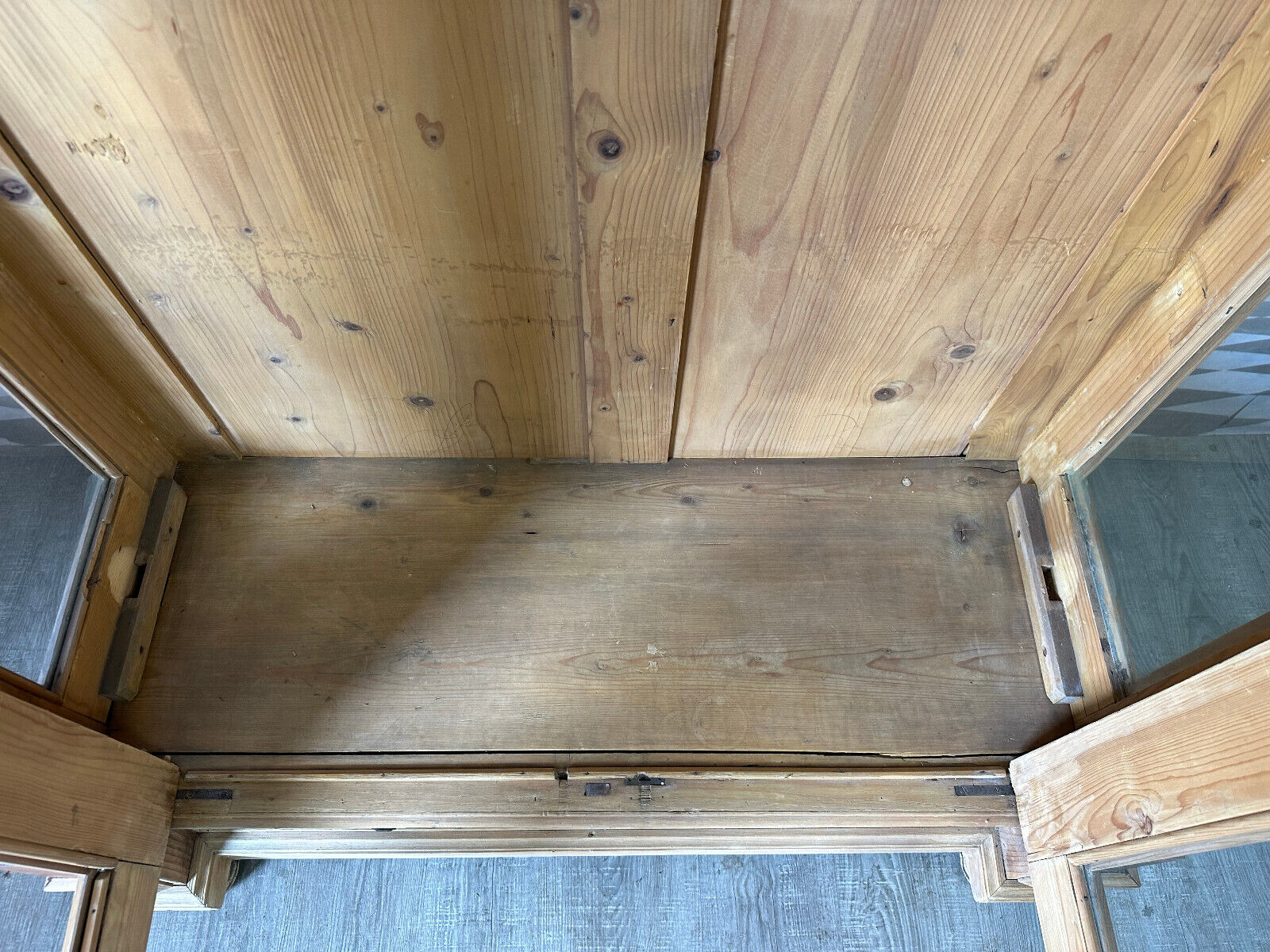 Antiker ehemaliger Kleiderschrank aus massivem Weichholz, Gründerzeit um 1890. Der Schrank wurde komplett abgeschliffen. Die seitlichen Kassetten und an den Türen wurden durch Glas ersetzt, die linke Tür hat aktuell KEINE Scheibe. Alle Leisten bestoßen und zum Teil unvollständig, Oberfläche zum Teil fleckig. Die rechte Tür ist leicht in sich gewölbt, oben ragt diese leicht raus. Am Dach und an der Bodenplatte Dehnungsrisse, die inneren Leisten um die Scheiben sind ebenfalls unvollständig. Der Schrank wurde mal elektrifiziert, die Elektrifizierung ist unvollständig. Schubladen mit Flecken und Dehnungsrissen. Die inneren Ablagebretter, so wie die vier Befestigungskeile sind nicht vorhanden. Stabiler Zustand Abmessungen BTH: 127x59x196cm. Der Schrank ist komplett zerlegbar und wird als unvollständiges Restaurationsobjekt angeboten.