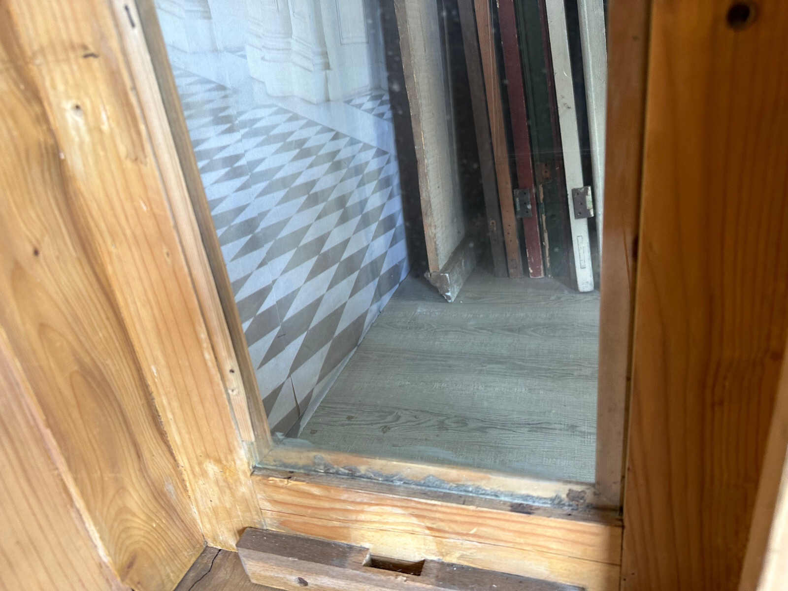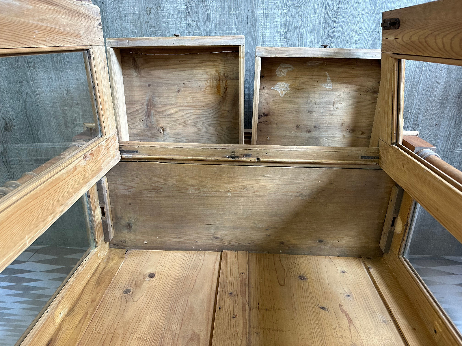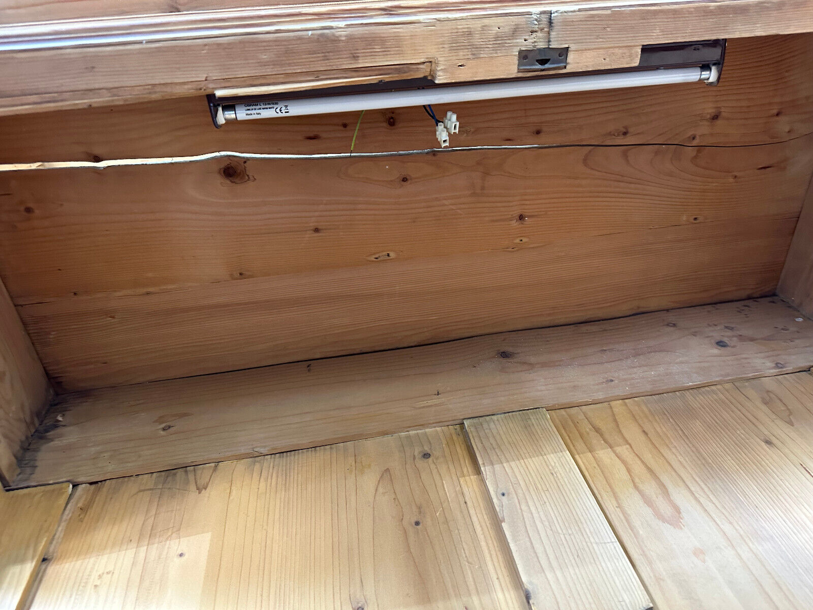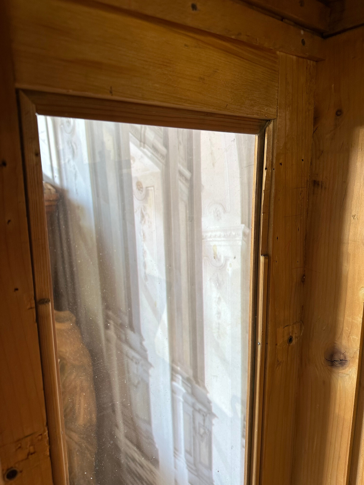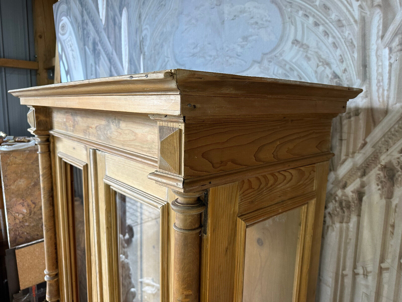 Antiker ehemaliger Kleiderschrank aus massivem Weichholz, Gründerzeit um 1890. Der Schrank wurde komplett abgeschliffen. Die seitlichen Kassetten und an den Türen wurden durch Glas ersetzt, die linke Tür hat aktuell KEINE Scheibe. Alle Leisten bestoßen und zum Teil unvollständig, Oberfläche zum Teil fleckig. Die rechte Tür ist leicht in sich gewölbt, oben ragt diese leicht raus. Am Dach und an der Bodenplatte Dehnungsrisse, die inneren Leisten um die Scheiben sind ebenfalls unvollständig. Der Schrank wurde mal elektrifiziert, die Elektrifizierung ist unvollständig. Schubladen mit Flecken und Dehnungsrissen. Die inneren Ablagebretter, so wie die vier Befestigungskeile sind nicht vorhanden. Stabiler Zustand Abmessungen BTH: 127x59x196cm. Der Schrank ist komplett zerlegbar und wird als unvollständiges Restaurationsobjekt angeboten.