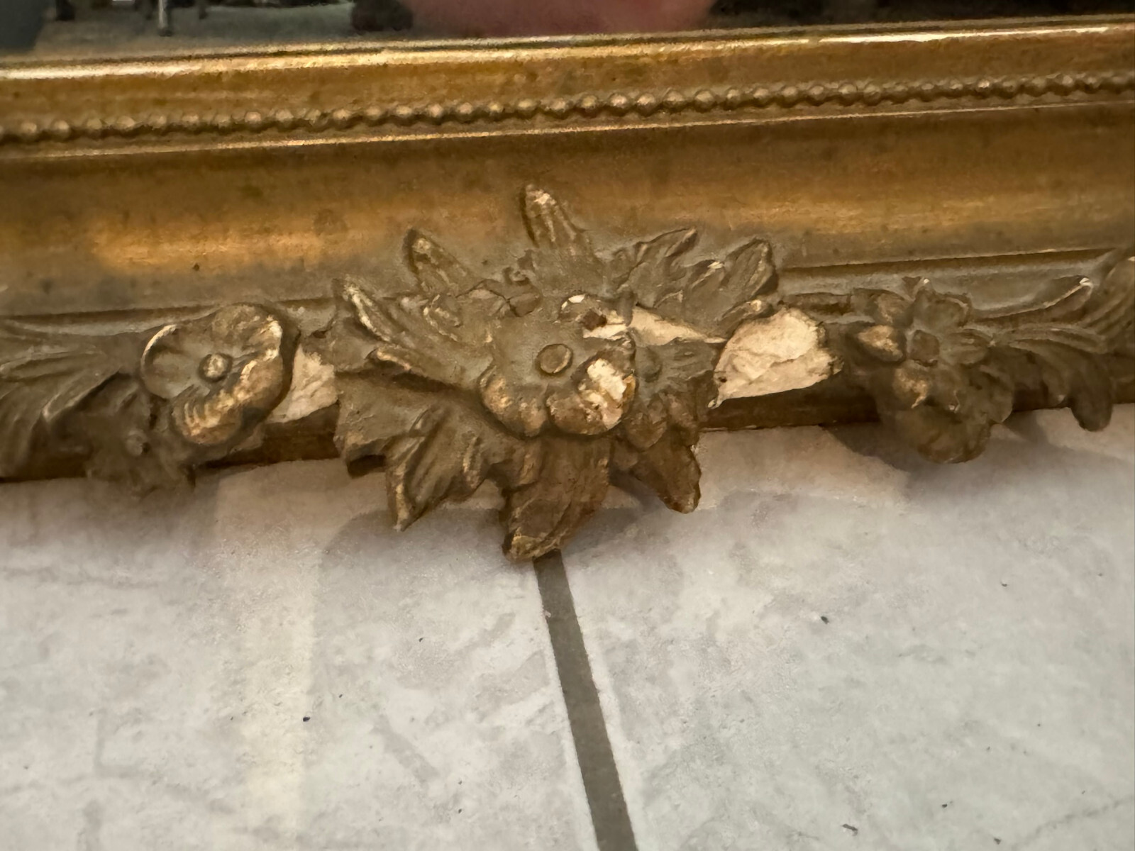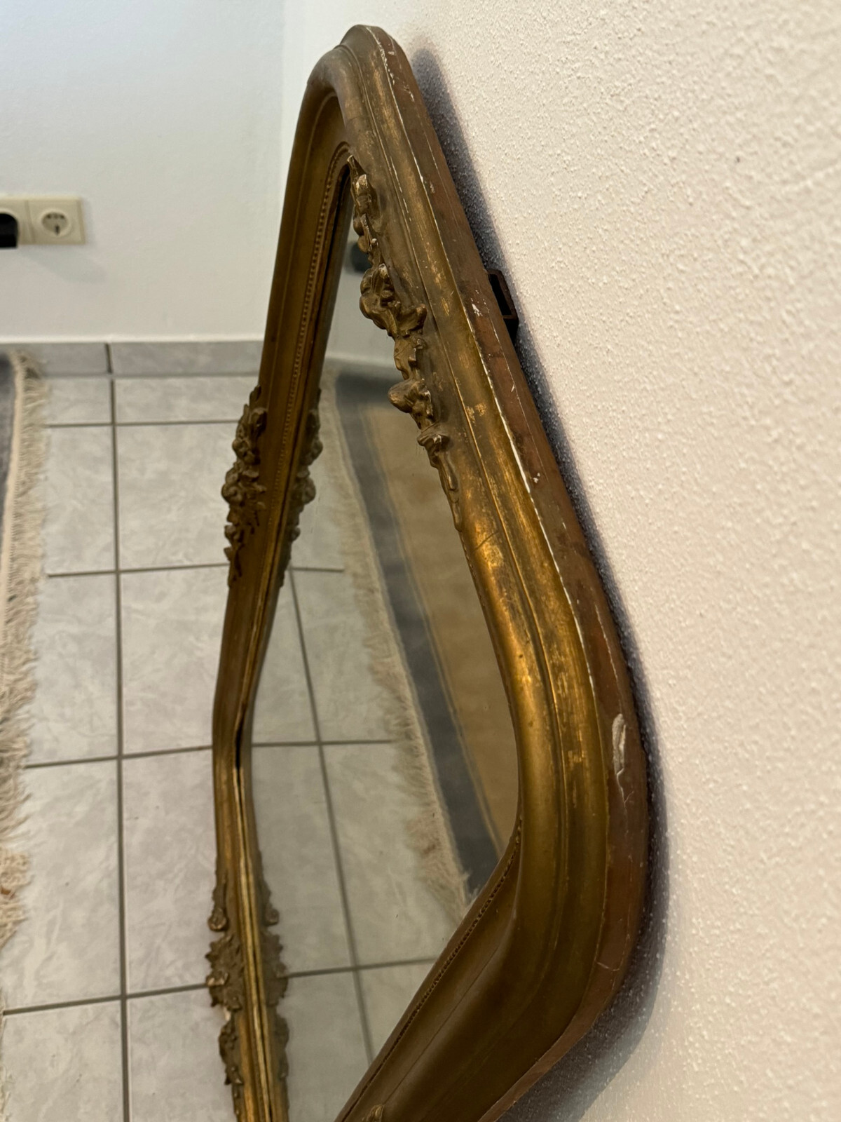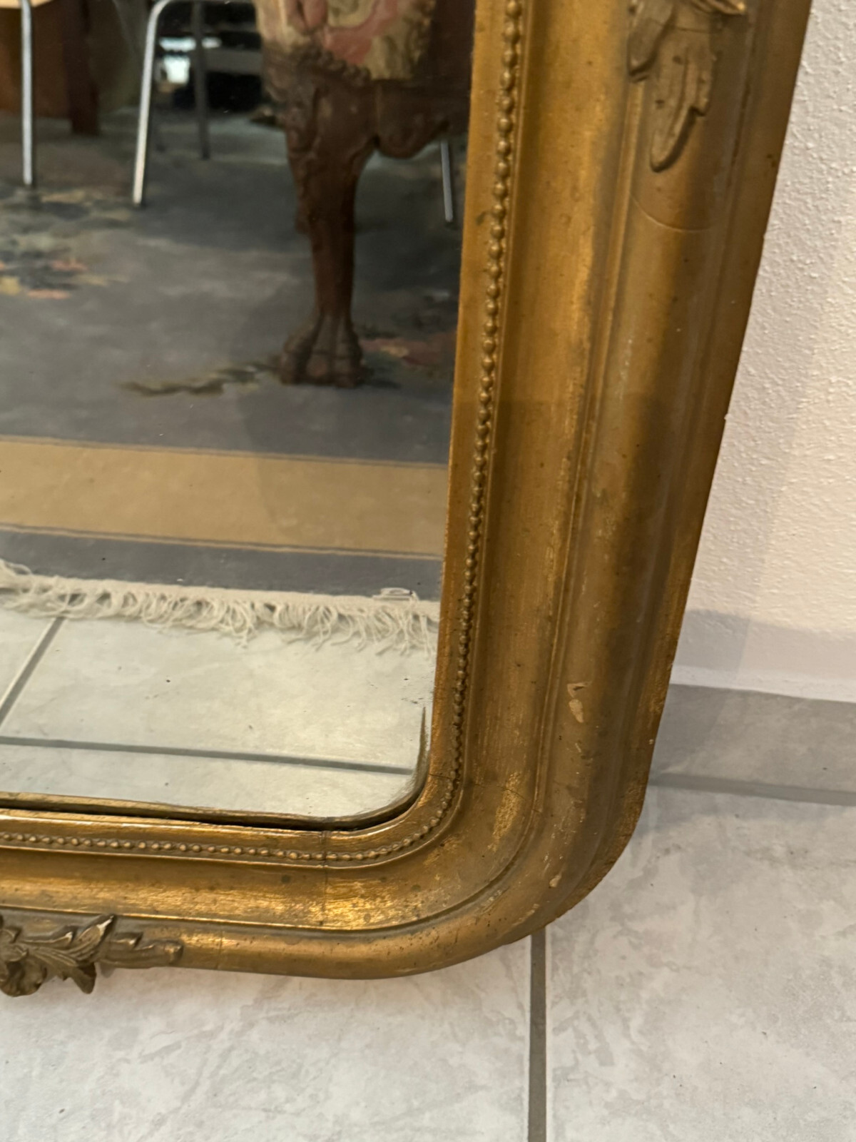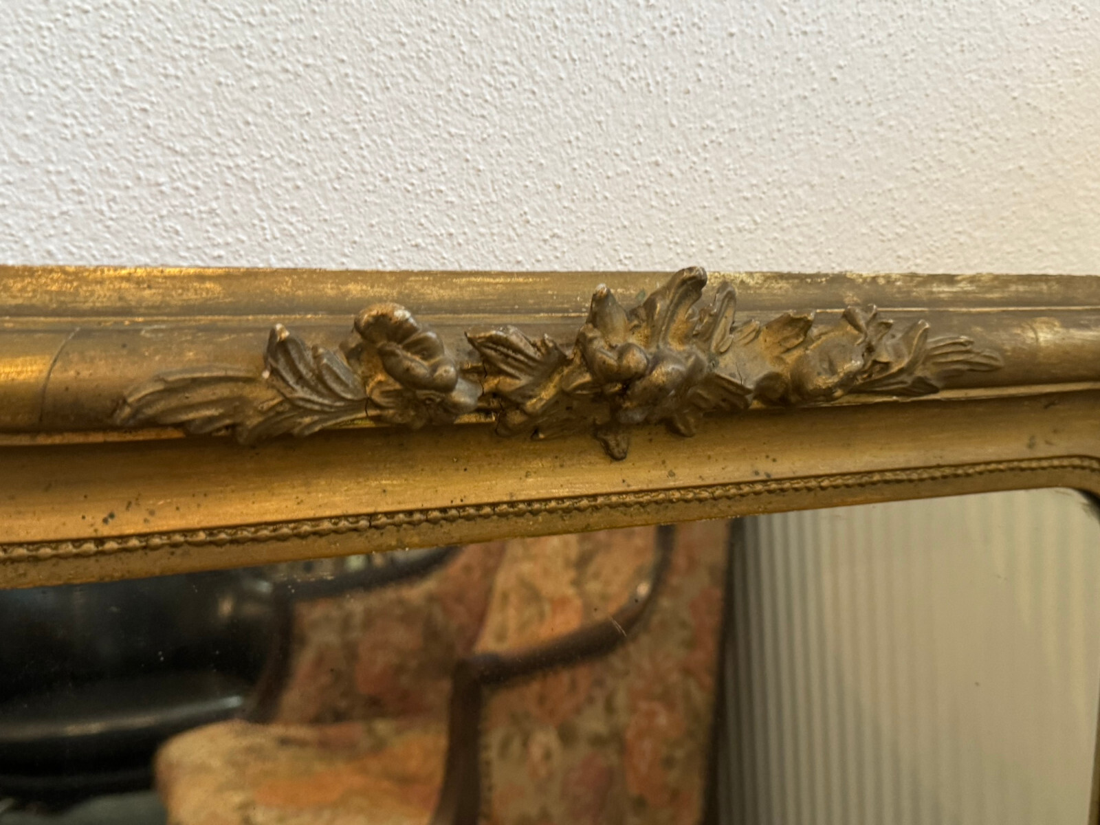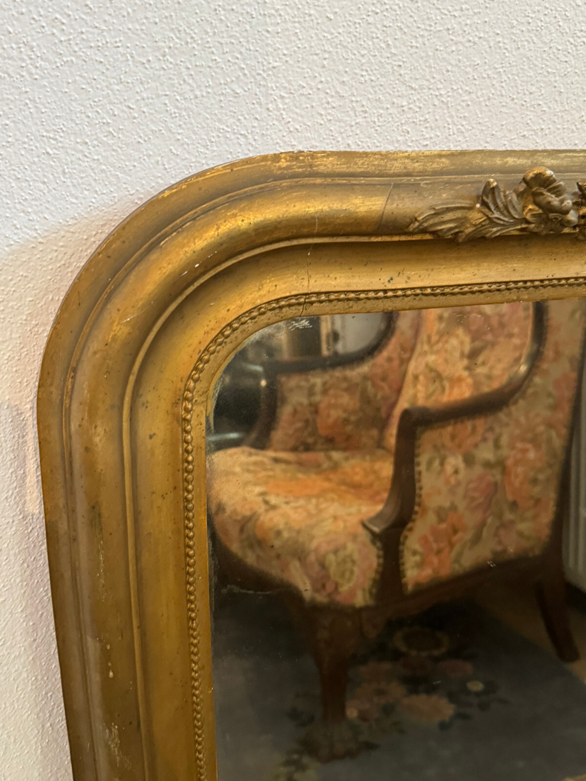 Sehr schöner Spiegel mit massivem Rahmen aus Holz und teils Stuckaufbau, Louis Seize Stil um 1920. Spiegelglas in gutem Zustand, der Stuckaufbau ist besonders an der Unterseite stärker bestoßen und unvollständig. Generell ist der Rahmen berieben, übermalt und weist teils Abplatzer auf. HxB: 100x67cm.