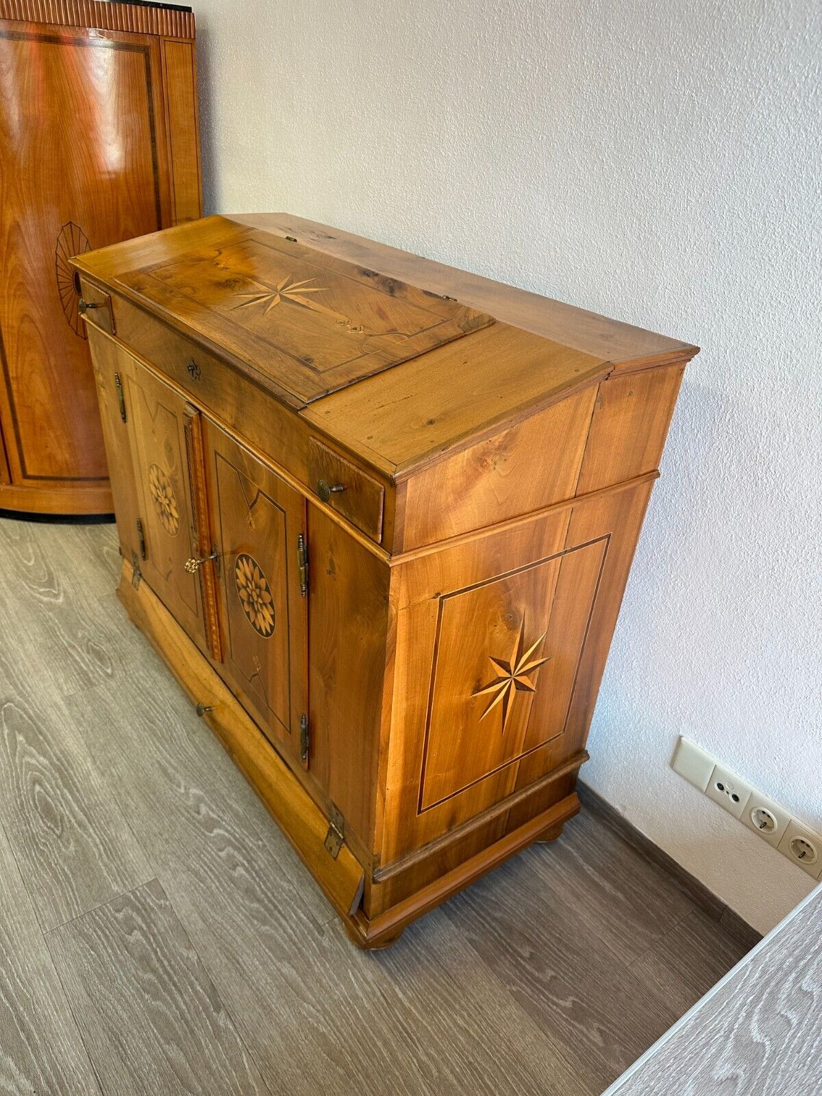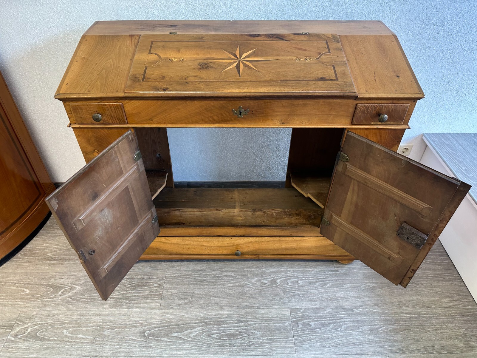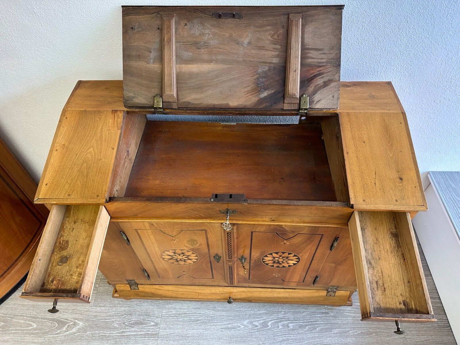 Sehr schöner, antiker Louis Seize Sekretär um 1780/1800. Holzkorpus, Nussbaum furniert und sehr schön intarsiert. Innenraum zum Teil berieben und fleckig. Beide Schlösser funktionsfähig, der untere Schlüssel verbogen und leicht angerissen. Im Innenraum wurde der untere Boden und die Rückwand ausgeschnitten, diese Teile sind nicht mehr vorhanden. Die untere Klappe lässt sich nicht mehr ganz schließen. Die unterste Leiste wohl mal erneuert, die Seitenwände mit Dehnungsfugen, weiterhin an der gesamten Oberfläche kleinste Bestoßungen und Fehlstellen. Abmessungen BTH: 124x52x102cm. Die Rückwand kann auf Wunsch von uns ergänzt werden.
