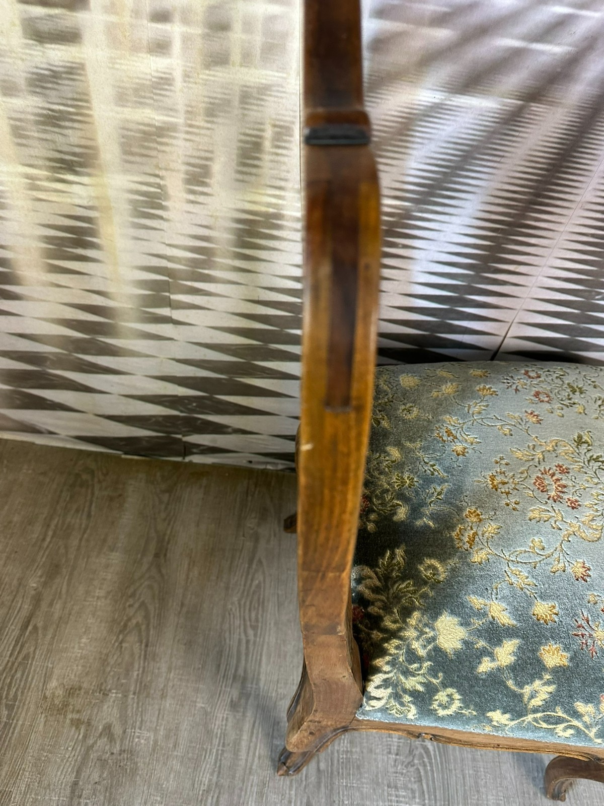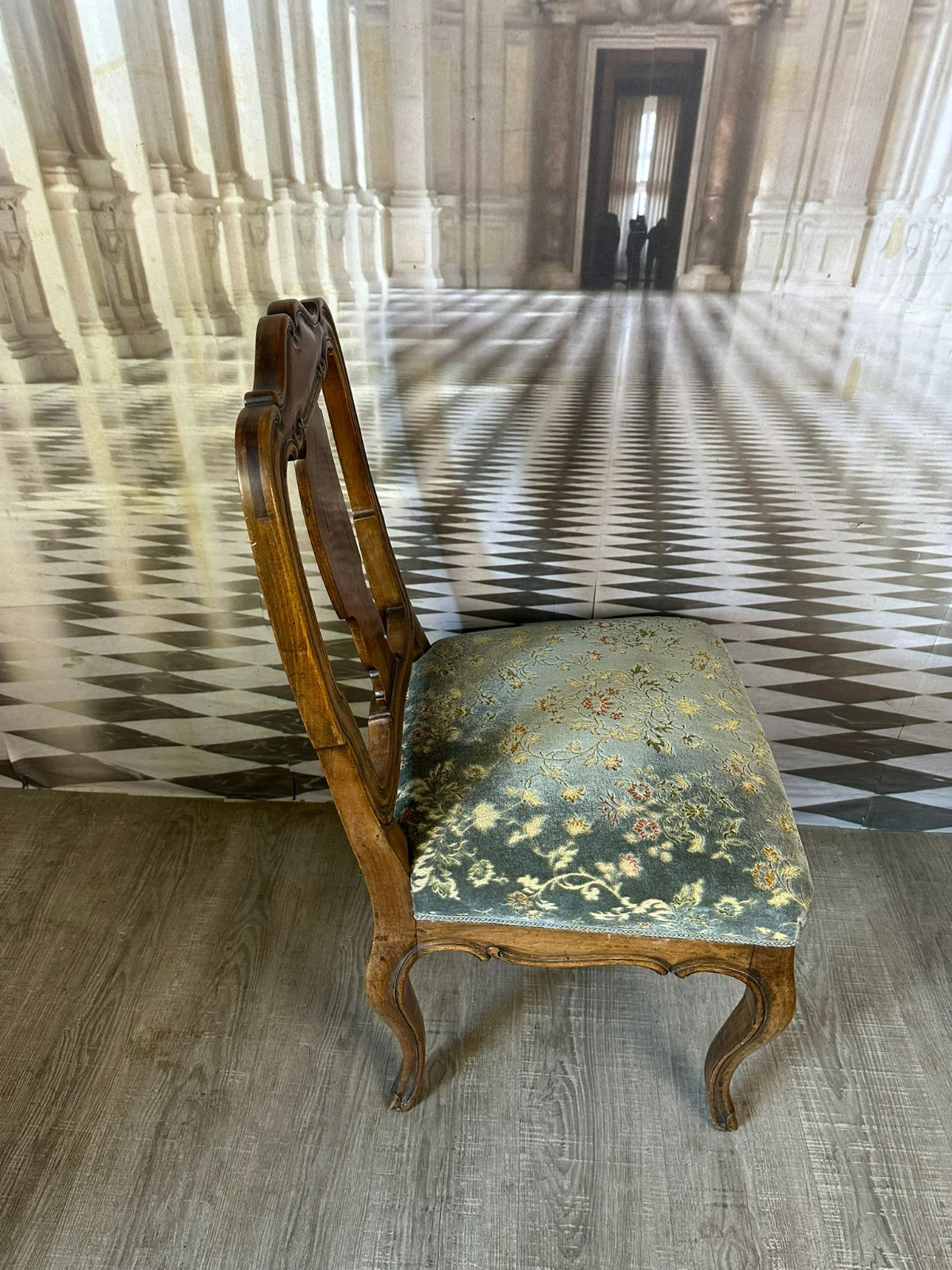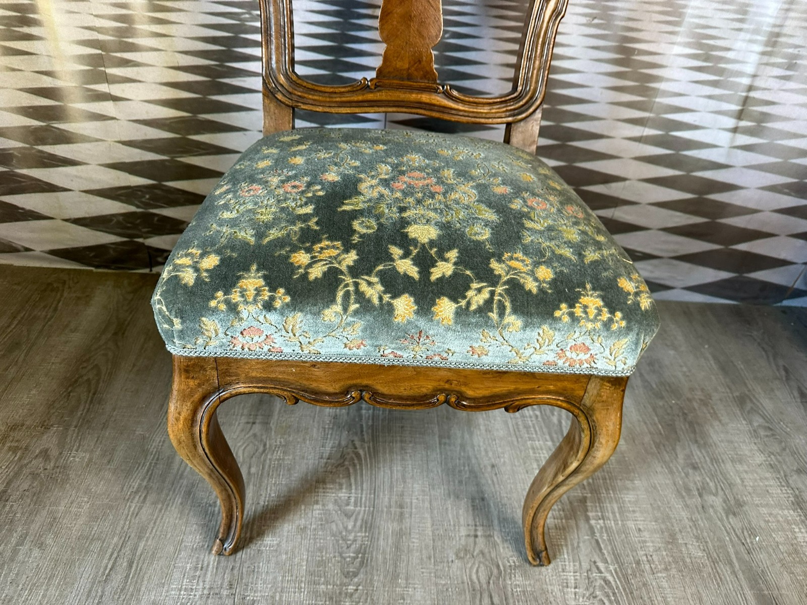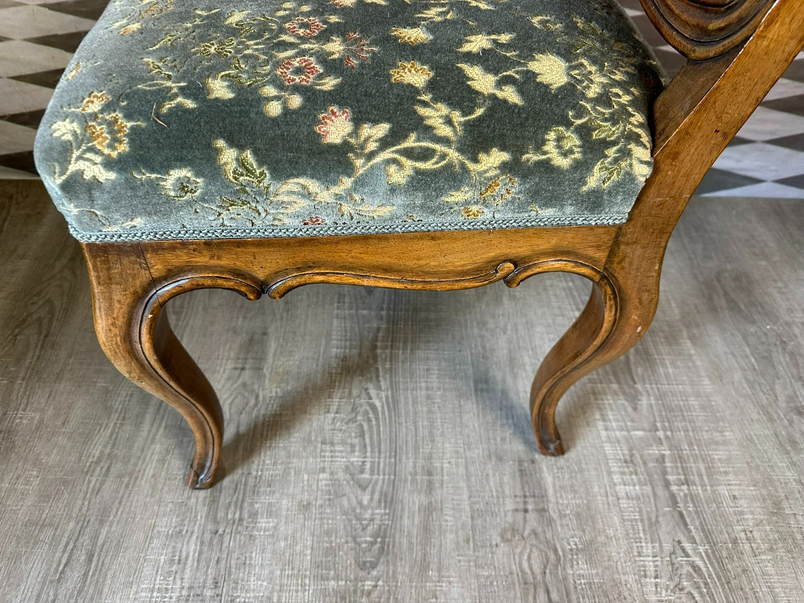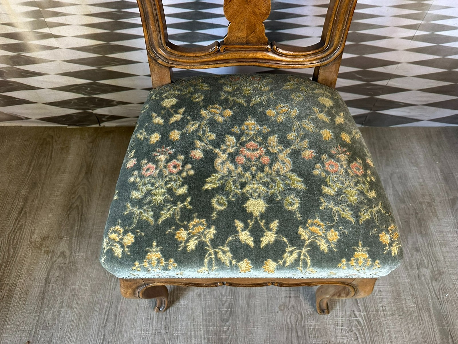 Antiker Stuhl im Barockstil um 1880. Sehr schönes Nußbaumgestell mit guterhaltener Polsterung, diese mal ausgetauscht, an der Rückenlehne intarsiert. Am Gestell minimaler Abrieb und wenige kleinste Bestossungen. Stabiler Zustand, guter Sitzkomfort, Abmessungen BTH 49/55/96cm, Sitzhöhe 49cm.