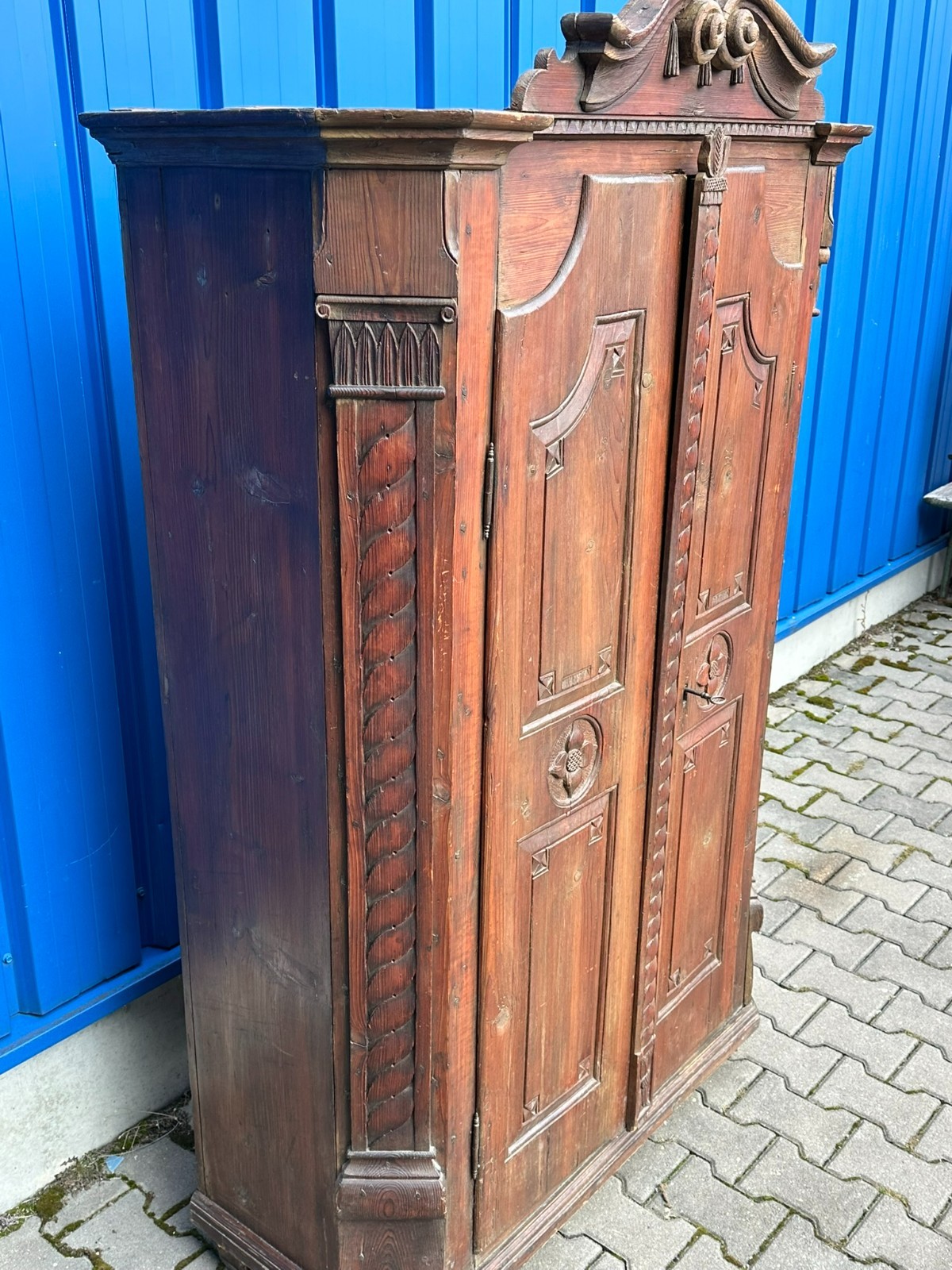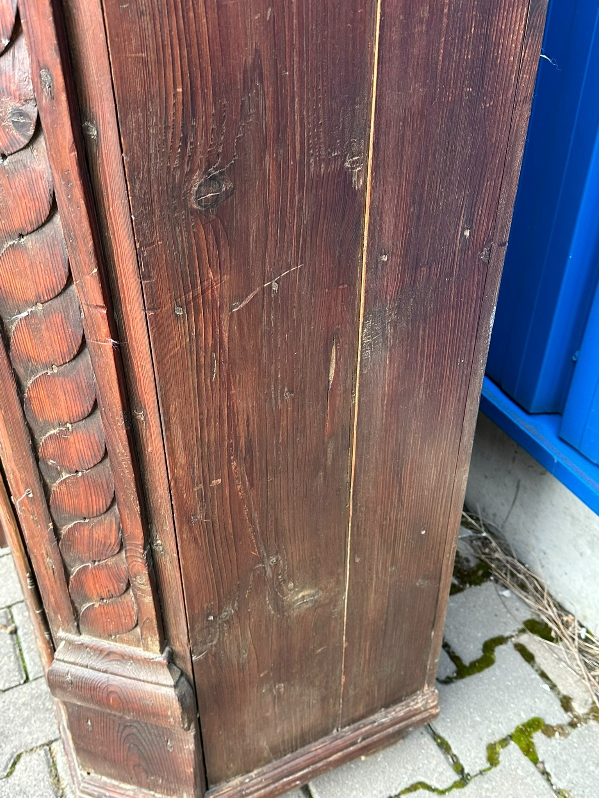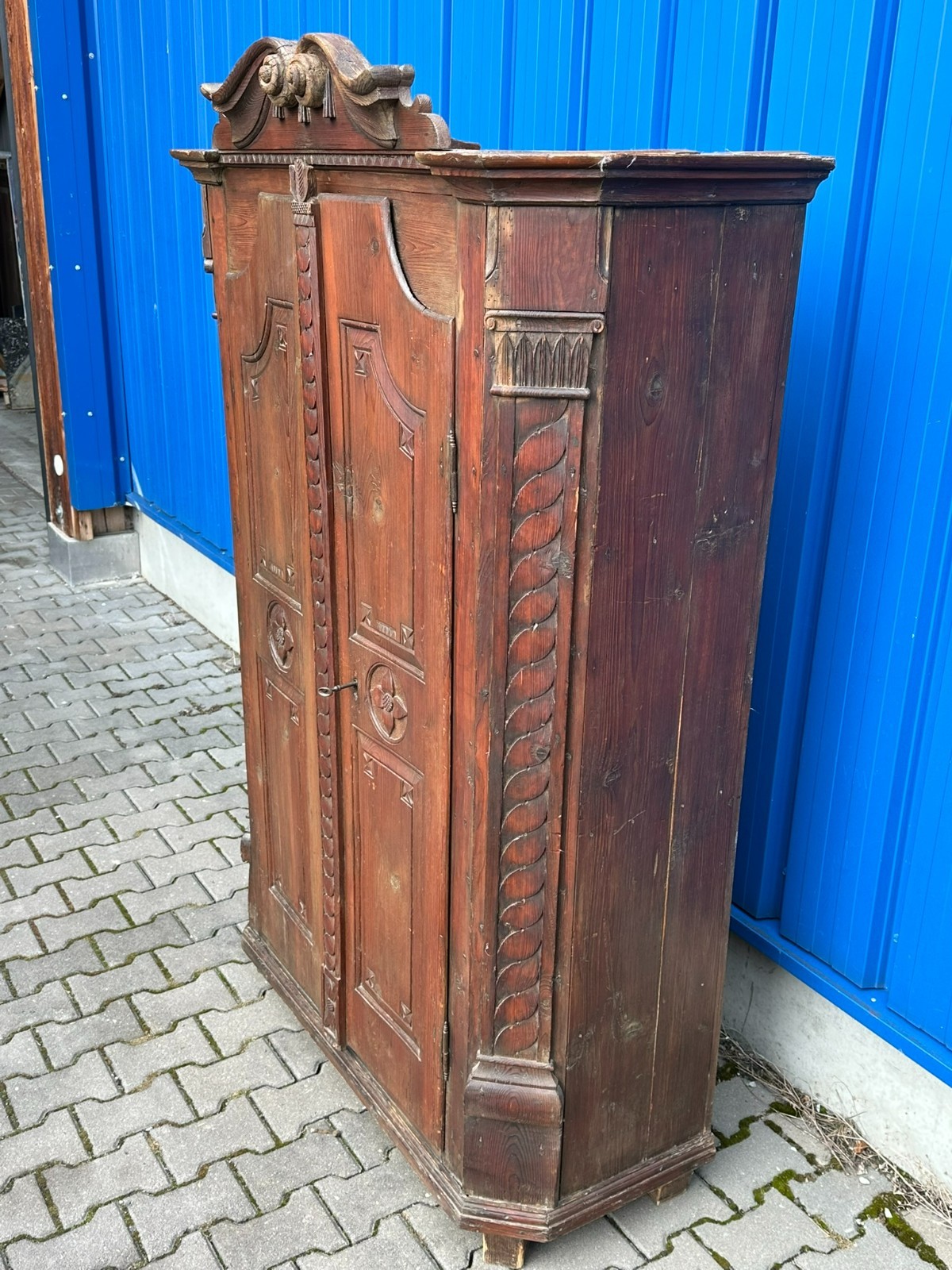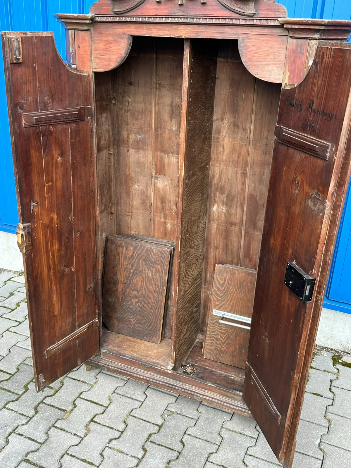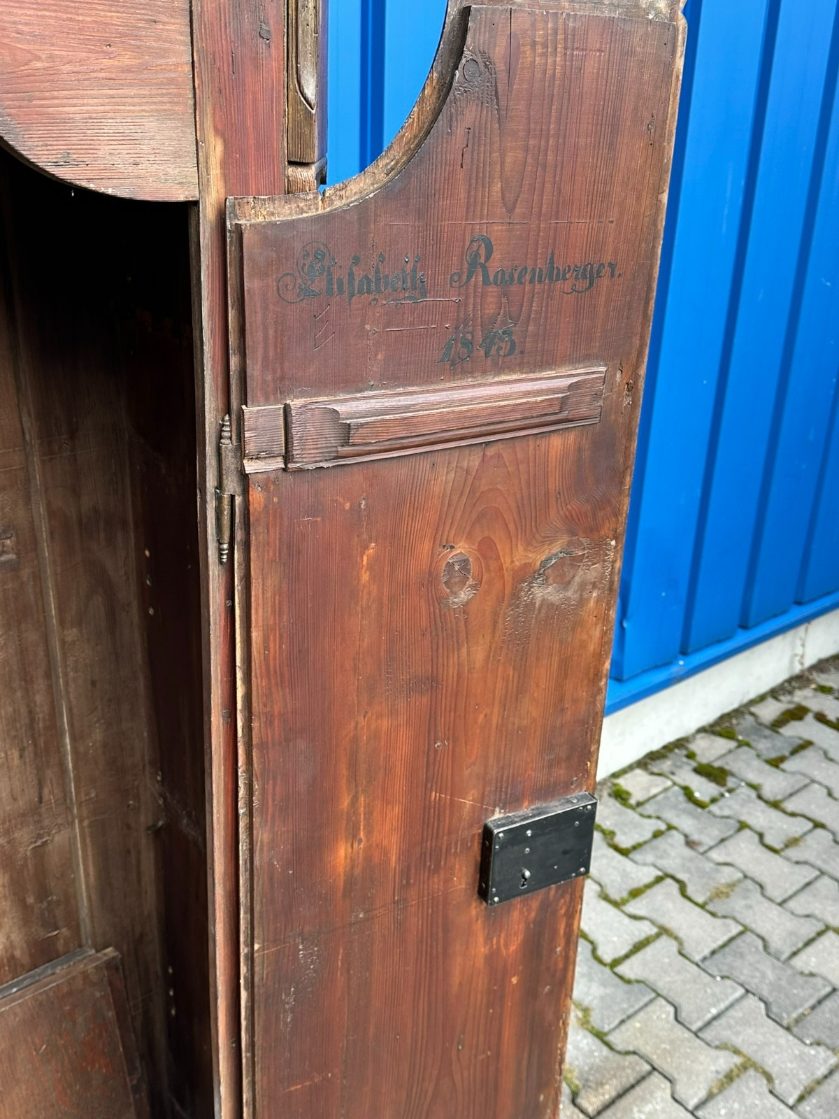 Antiker Bauernschrank, innen namentlich Bezeichnet und datiert „1843“. Massiver Weichholzkorpus, dunkelbraun patiniert. Leichter alter, inaktiver Wurmfraß. An der gesamten Oberfläche Abrieb, kleinere Bestoßungen und feine Dehnungsrisse. Das Schloss und das komplette Innenleben nicht original, für die Ablagebretter sind nur 29 Stifte vorhanden. Der Schrank ist nicht zerlegbar. Abmessungen BTH: 117x52x189cm. Ein Schlüssel vorhanden, Schloss funktionsfähig.