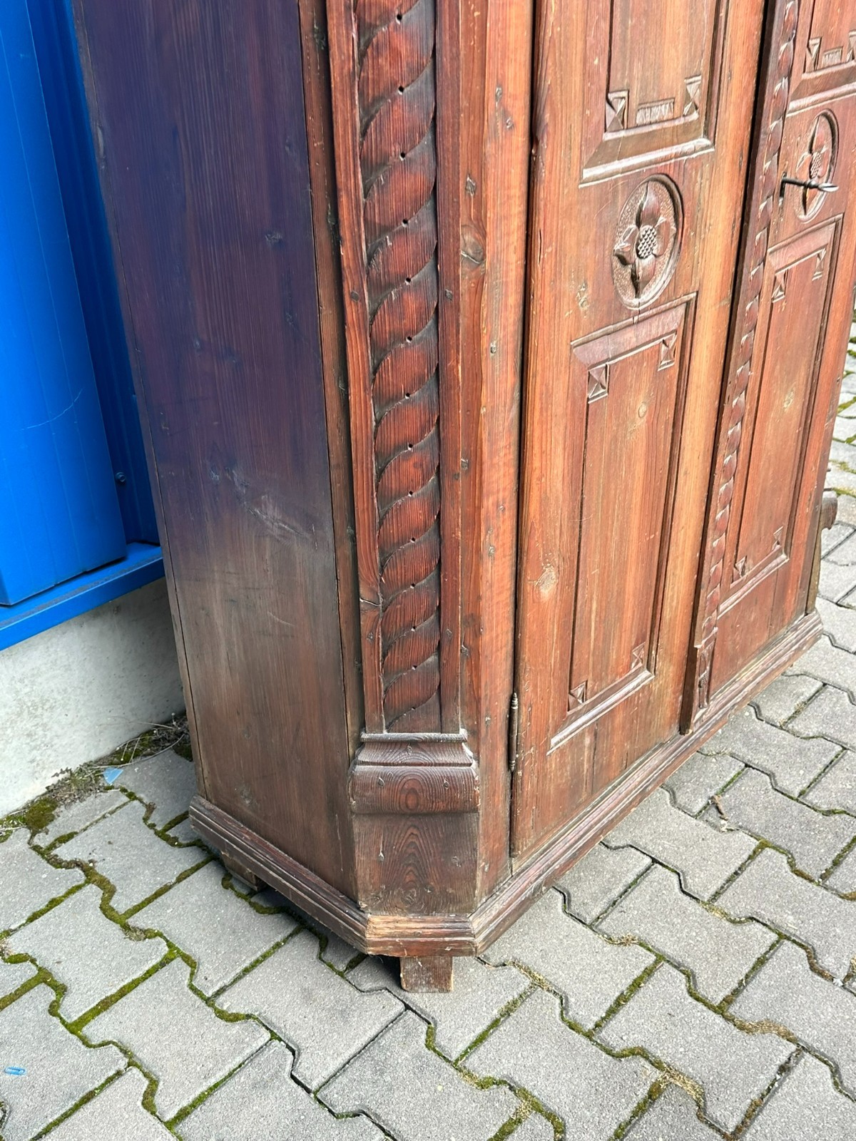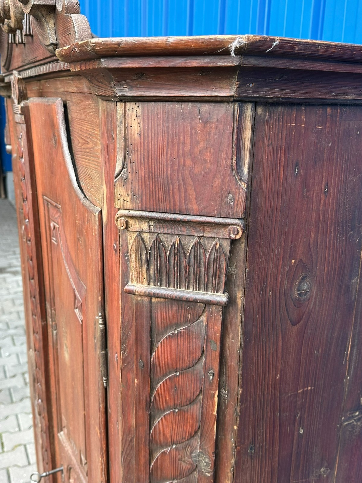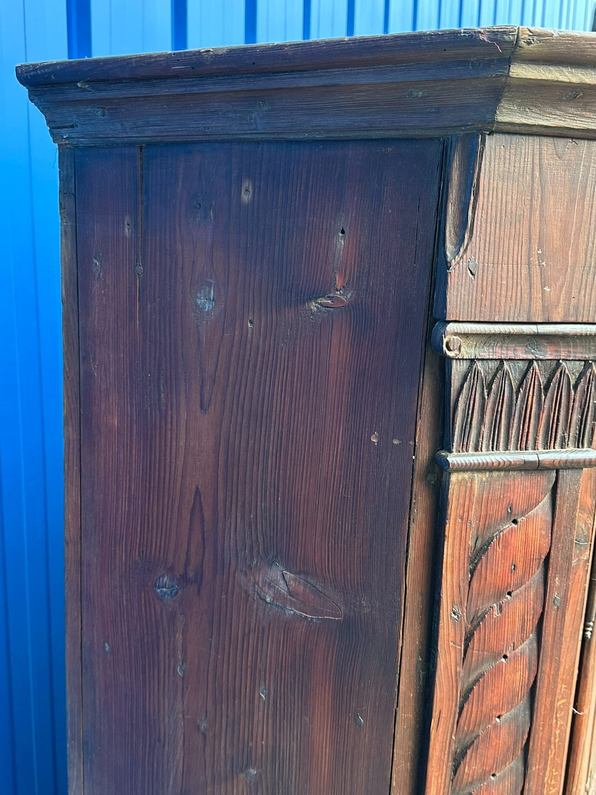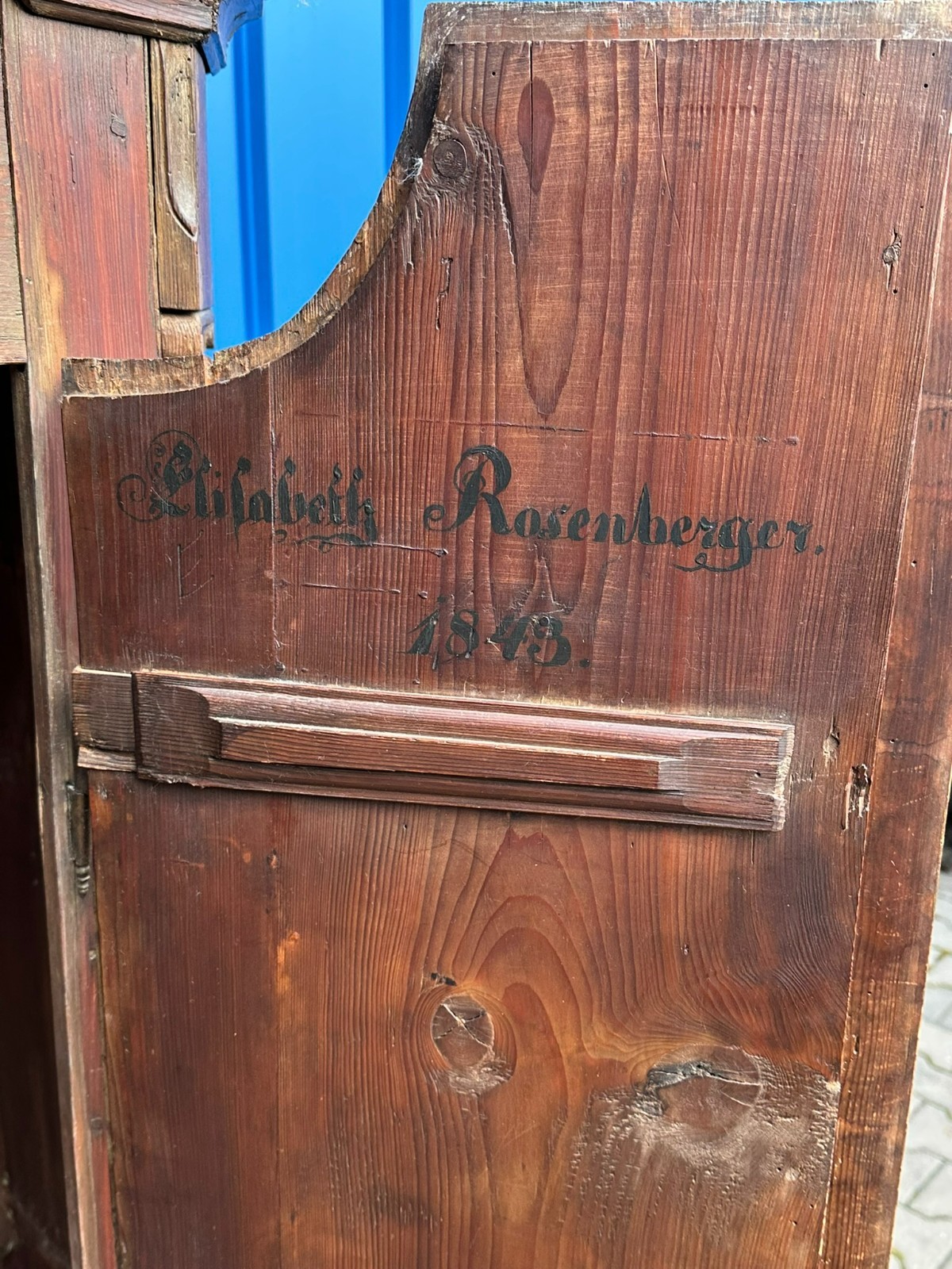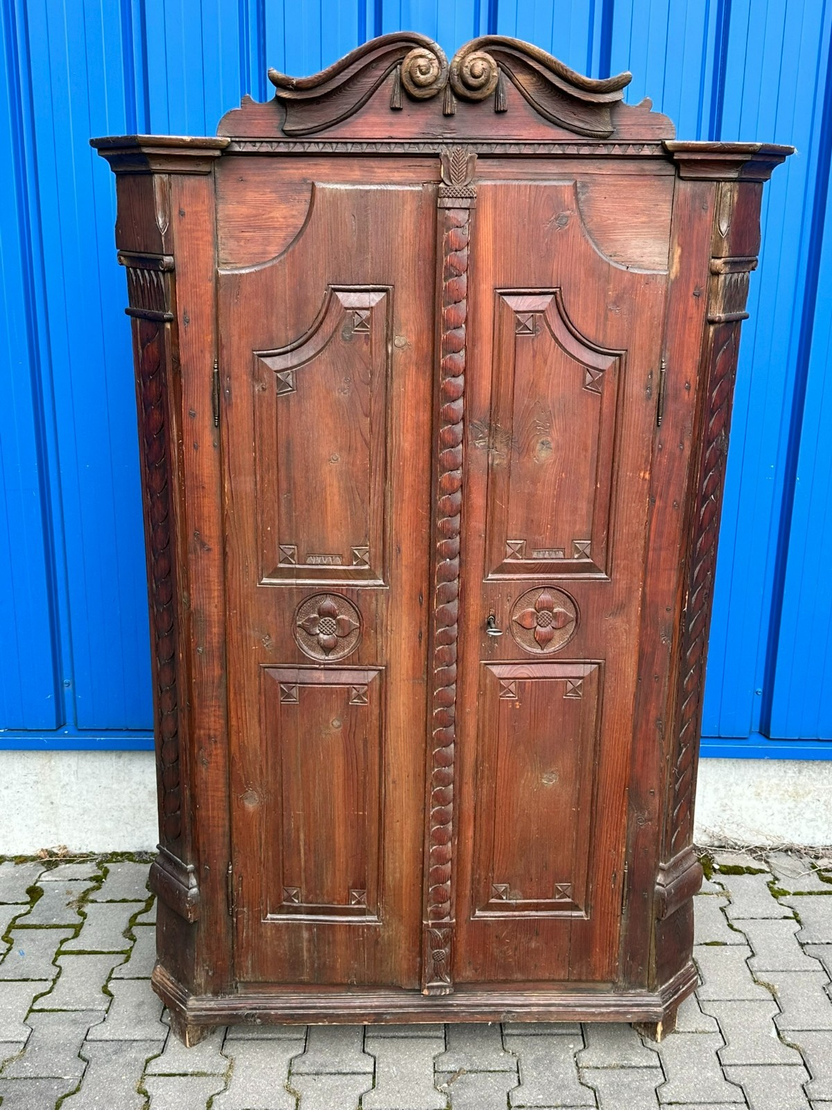 Antiker Bauernschrank, innen namentlich Bezeichnet und datiert „1843“. Massiver Weichholzkorpus, dunkelbraun patiniert. Leichter alter, inaktiver Wurmfraß. An der gesamten Oberfläche Abrieb, kleinere Bestoßungen und feine Dehnungsrisse. Das Schloss und das komplette Innenleben nicht original, für die Ablagebretter sind nur 29 Stifte vorhanden. Der Schrank ist nicht zerlegbar. Abmessungen BTH: 117x52x189cm. Ein Schlüssel vorhanden, Schloss funktionsfähig.