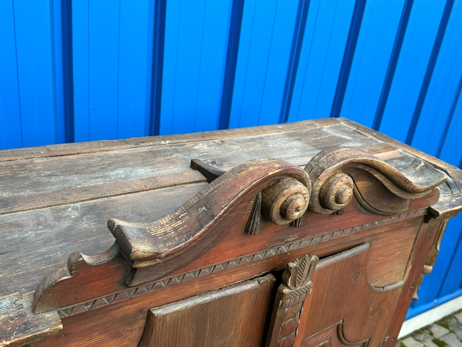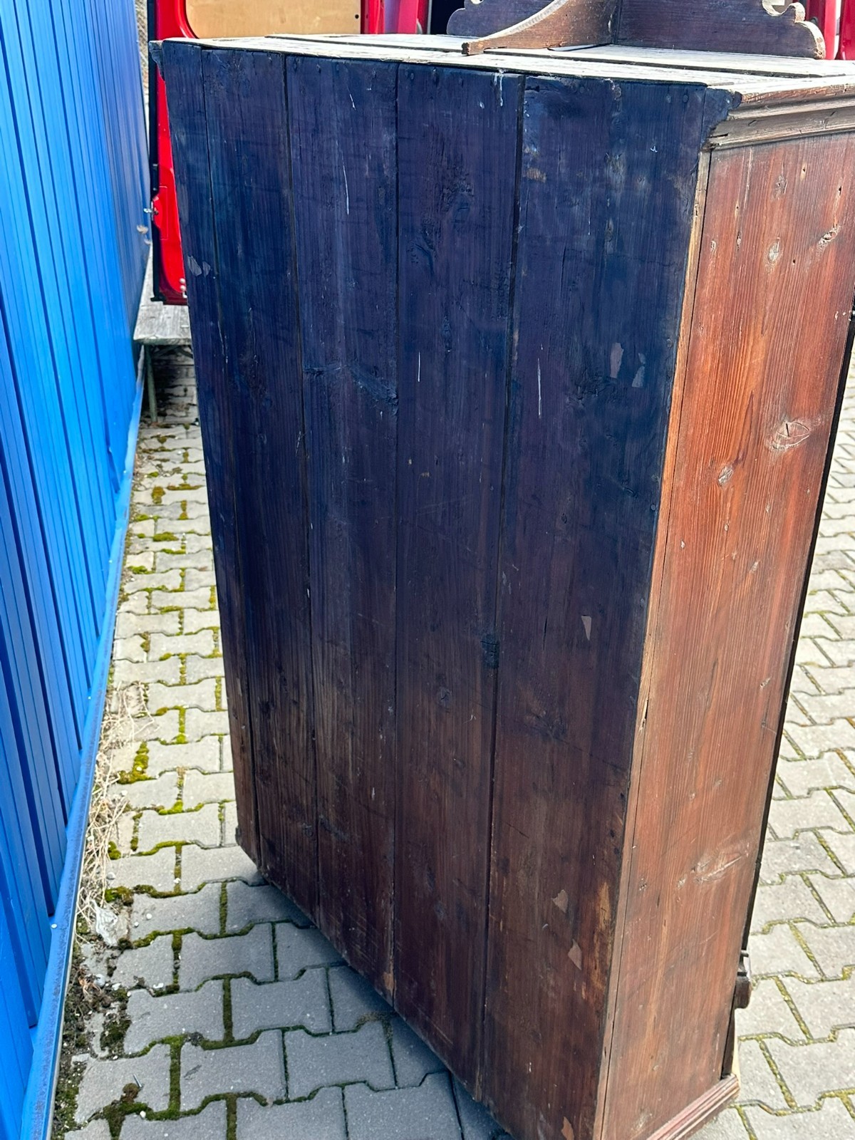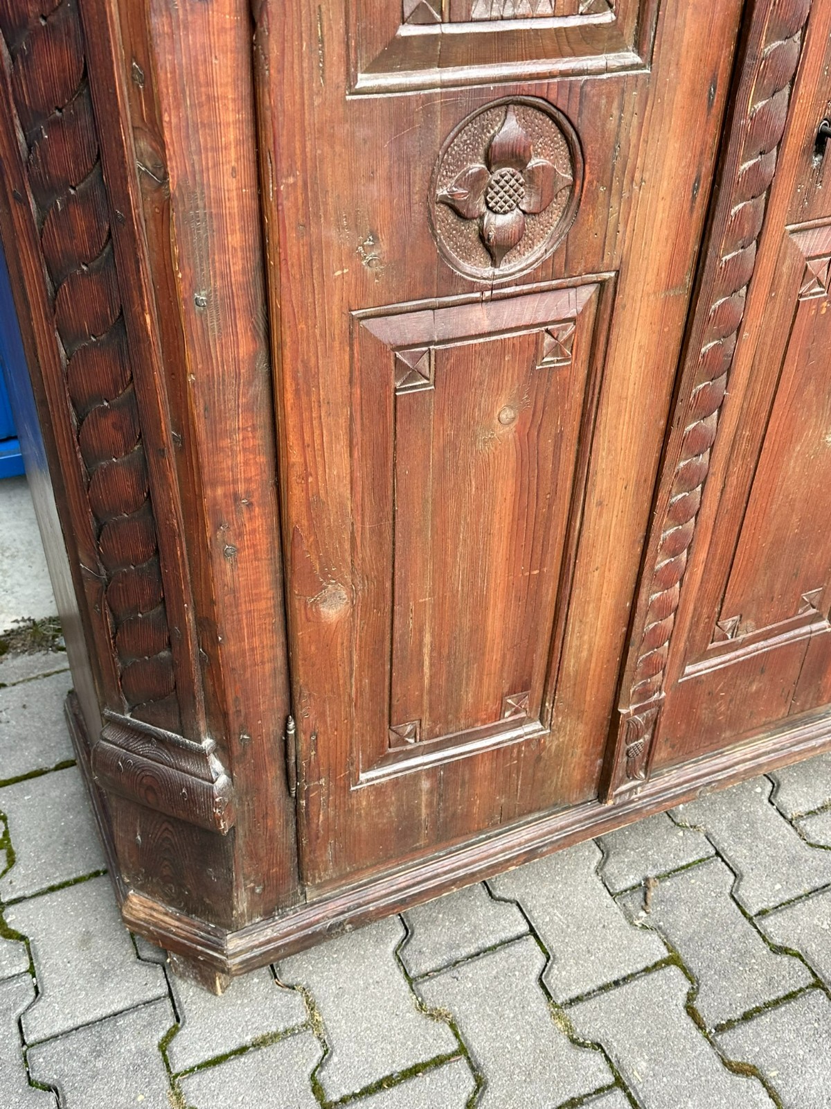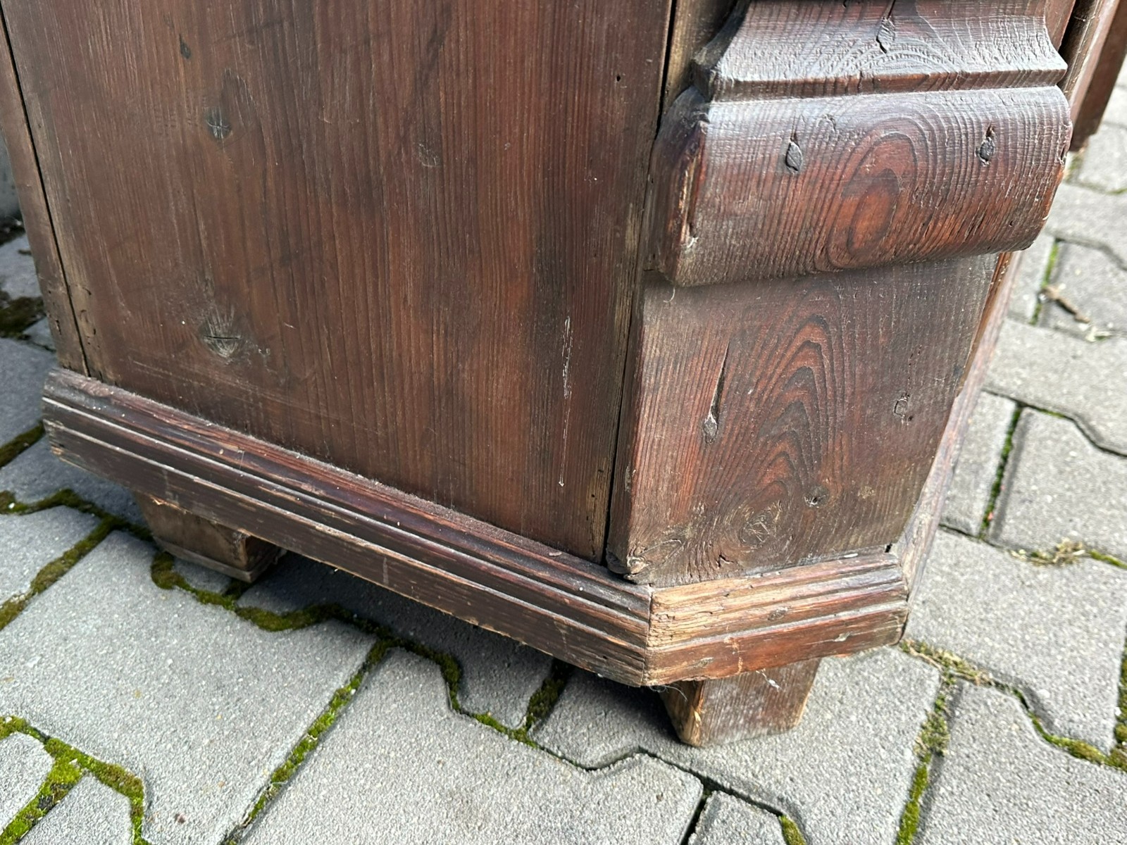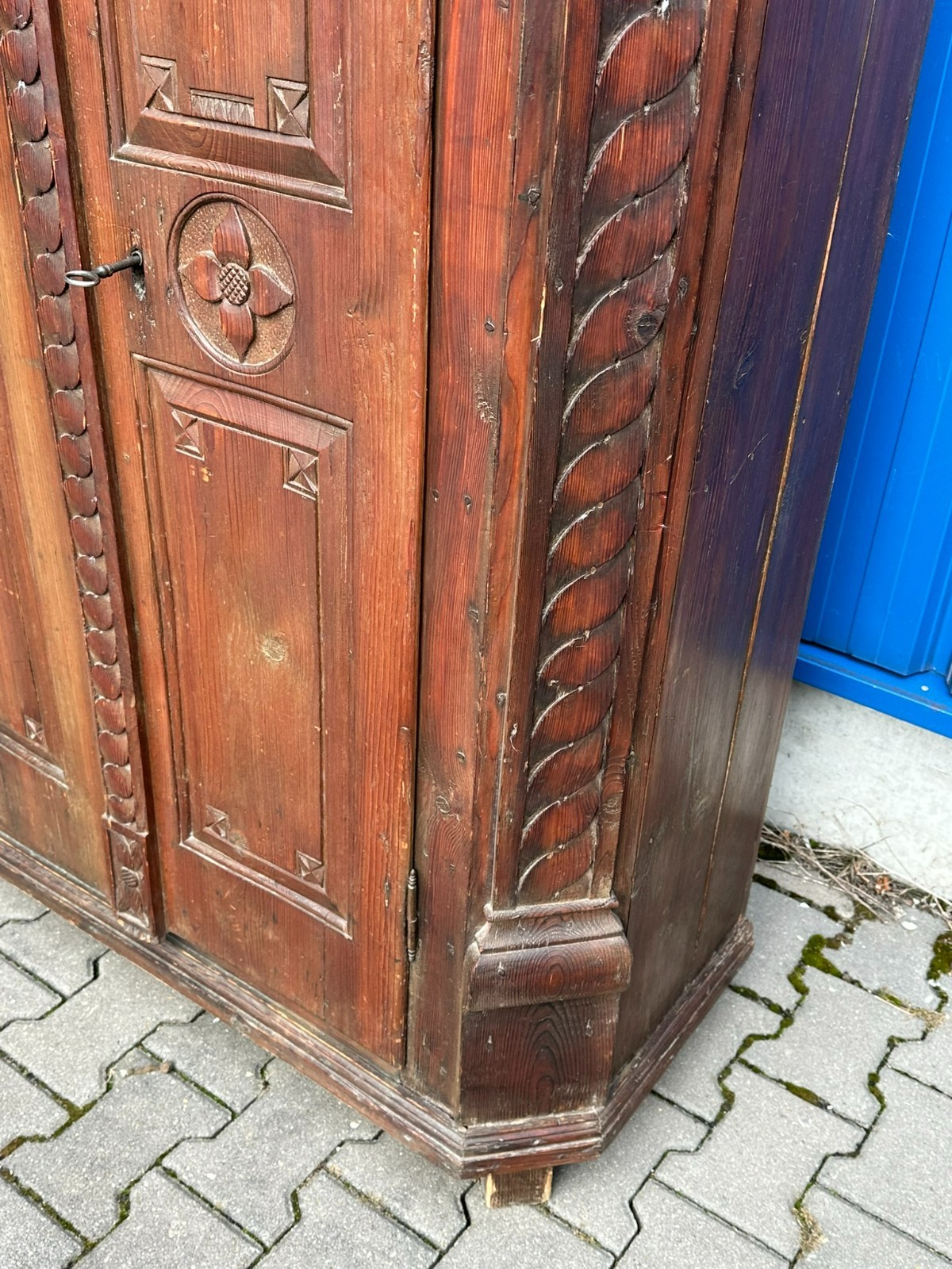 Antiker Bauernschrank, innen namentlich Bezeichnet und datiert „1843“. Massiver Weichholzkorpus, dunkelbraun patiniert. Leichter alter, inaktiver Wurmfraß. An der gesamten Oberfläche Abrieb, kleinere Bestoßungen und feine Dehnungsrisse. Das Schloss und das komplette Innenleben nicht original, für die Ablagebretter sind nur 29 Stifte vorhanden. Der Schrank ist nicht zerlegbar. Abmessungen BTH: 117x52x189cm. Ein Schlüssel vorhanden, Schloss funktionsfähig.