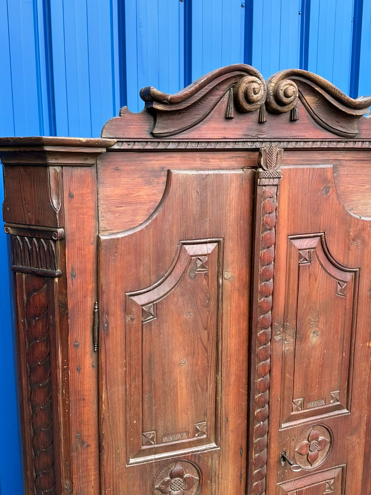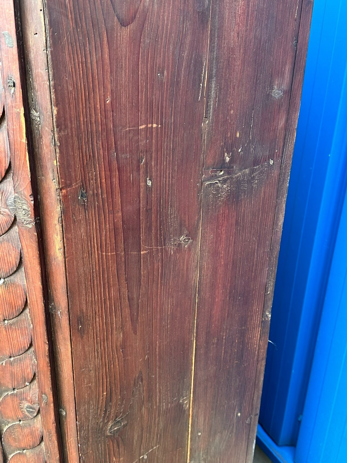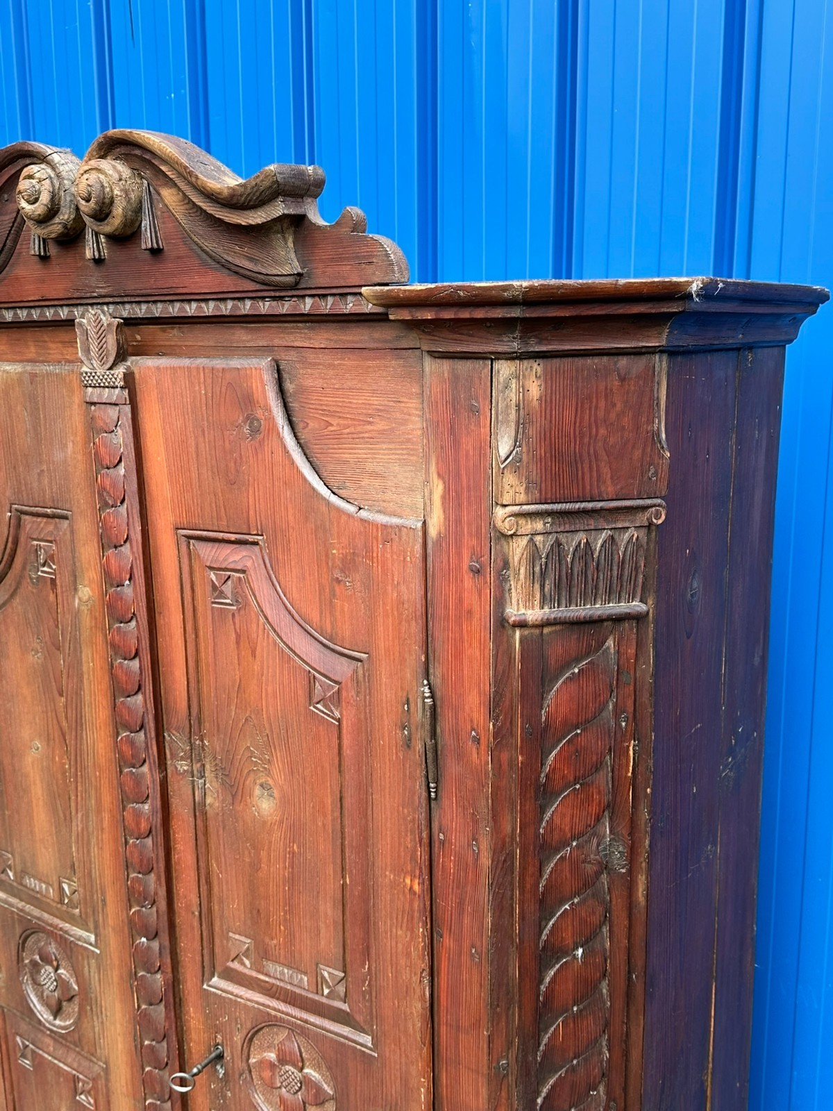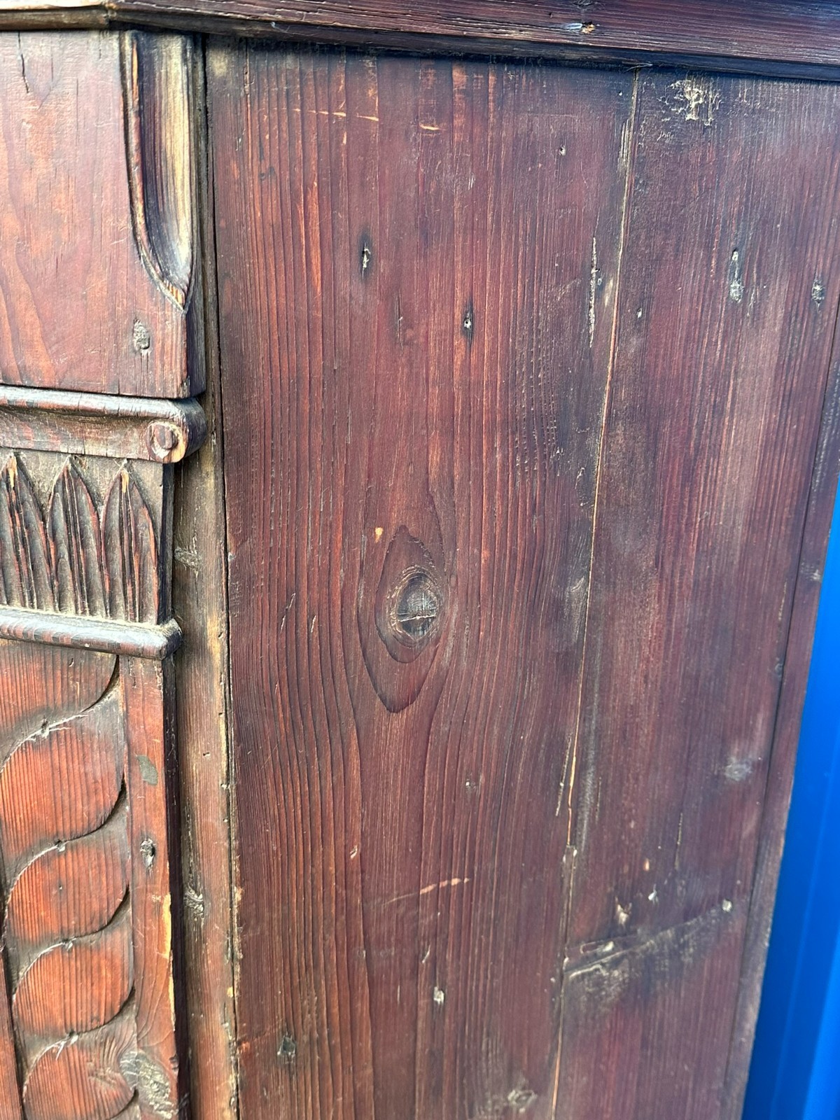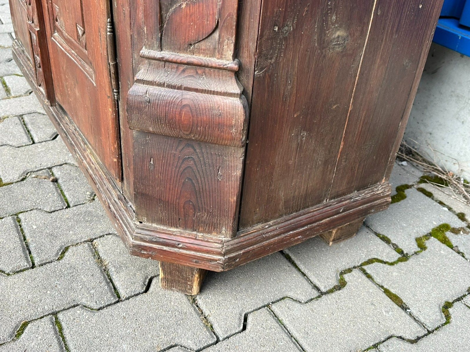 Antiker Bauernschrank, innen namentlich Bezeichnet und datiert „1843“. Massiver Weichholzkorpus, dunkelbraun patiniert. Leichter alter, inaktiver Wurmfraß. An der gesamten Oberfläche Abrieb, kleinere Bestoßungen und feine Dehnungsrisse. Das Schloss und das komplette Innenleben nicht original, für die Ablagebretter sind nur 29 Stifte vorhanden. Der Schrank ist nicht zerlegbar. Abmessungen BTH: 117x52x189cm. Ein Schlüssel vorhanden, Schloss funktionsfähig.