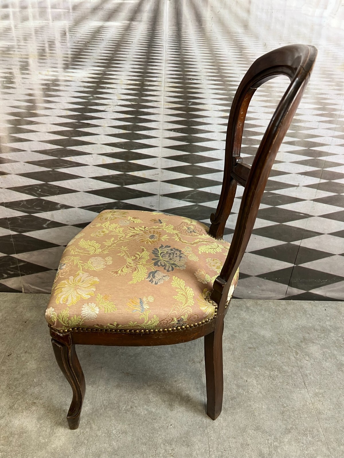 Antiker Louis Philippe Stuhl aus dem 19. Jahrhundert, mal komplett restauriert, mit nicht originalem Sitzbezug. Am Gestell teilweise geklebte Risse, leicht ergänzt. Die Sitzfläche ist zum Teil verblichen, harter Sitzkomfort, komplett stabil. Abmessungen BTH: 47x47x90cm, Sitzfläche: 45cm.
