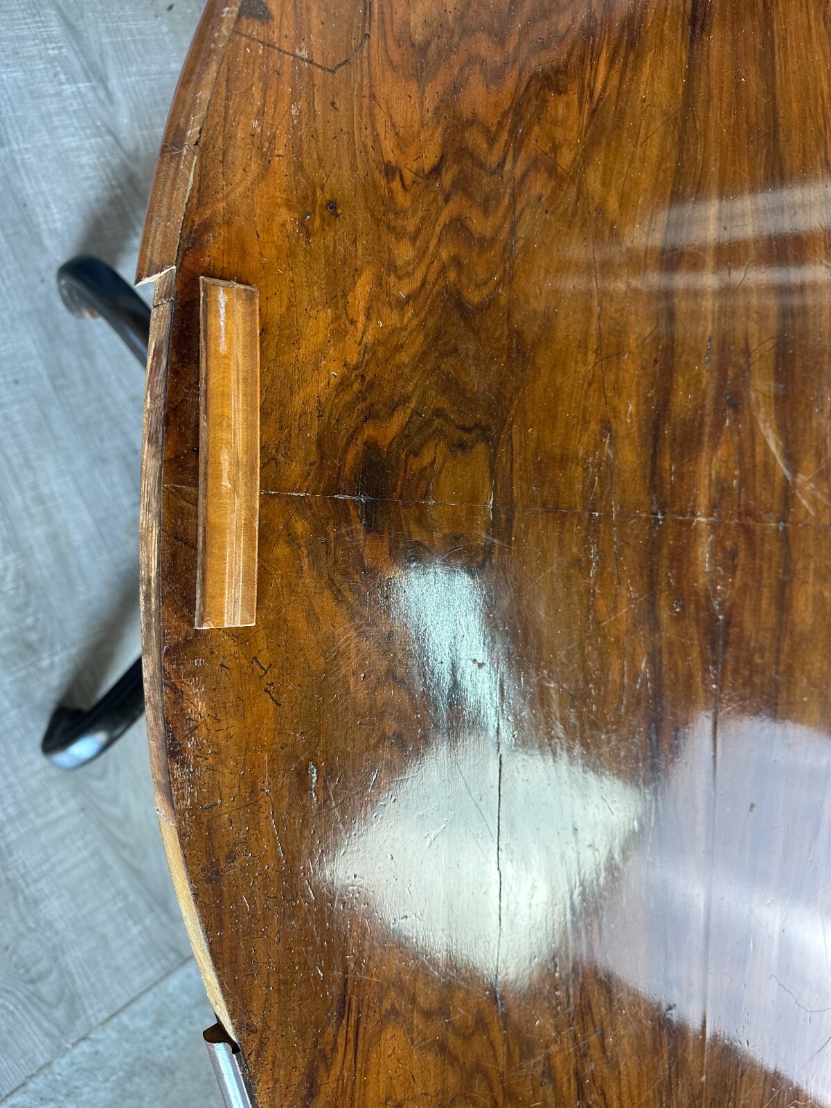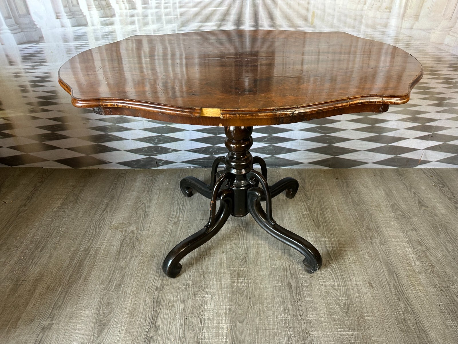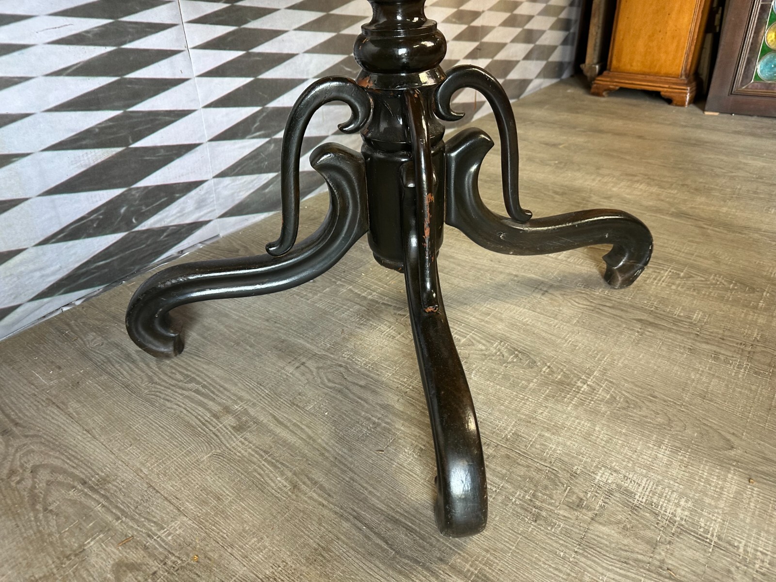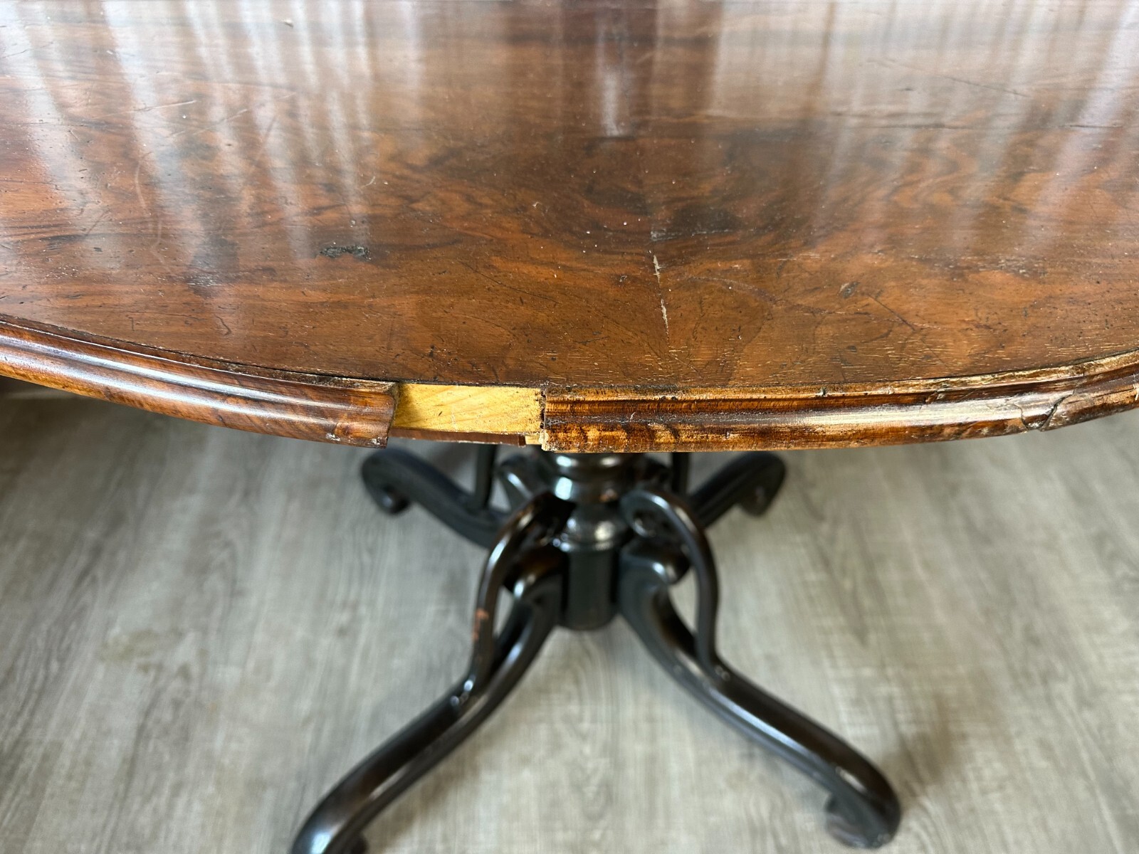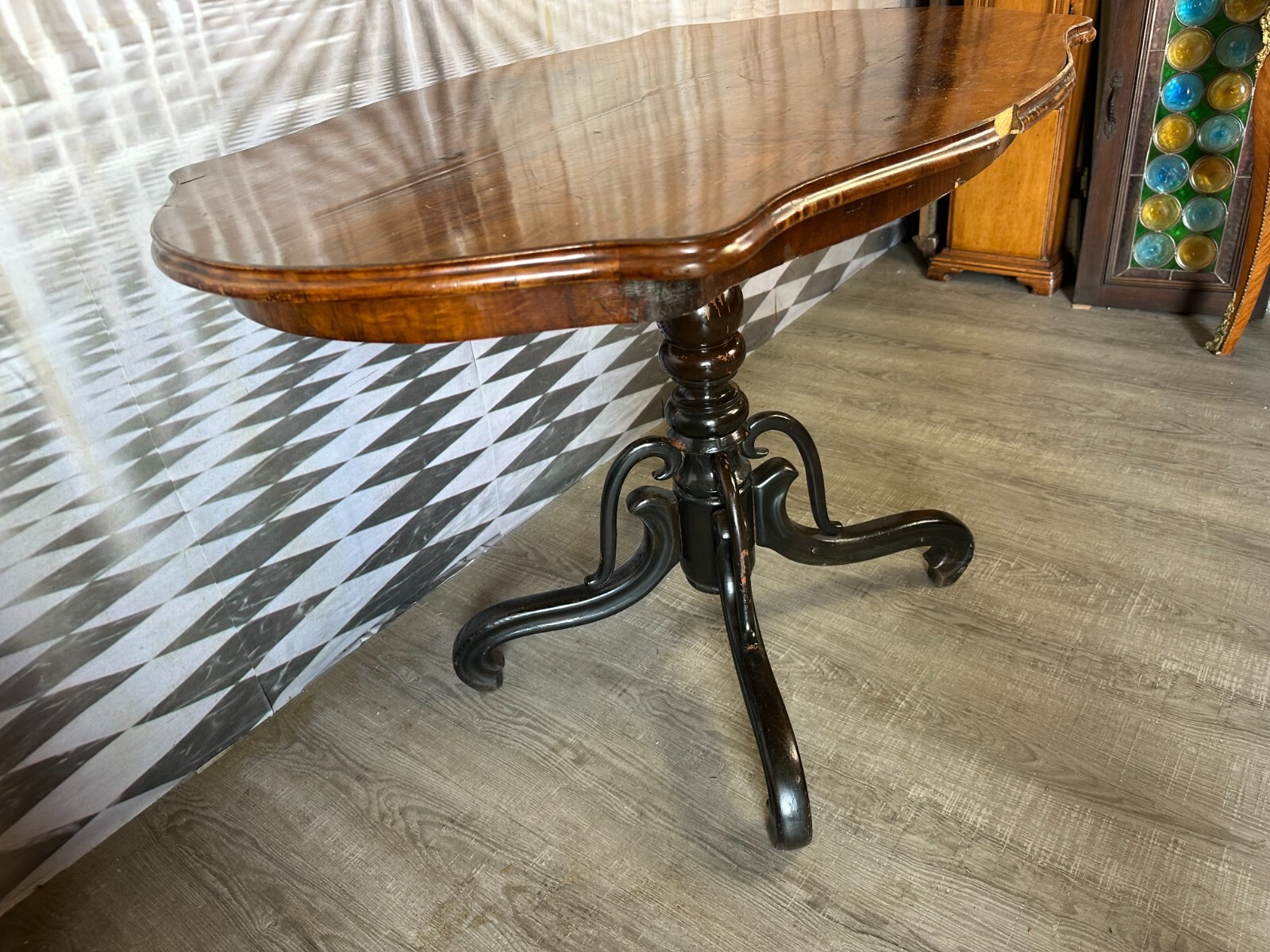 Antiker Beistelltisch, zweite Hälfte 19tes Jahrhundert. Fuß wurde mal komplett übermalt und ist an diversen Stellen berieben, die obere Platte Mahagoni furniert, diverse Druck- und Abriebsstellen. Die seitliche Leiste ist zum Teil lose und unvollständig, es wird nur das abgebildete lose Stück mitgeliefert. Der Seitenrand unterhalb der Platte ebenfalls mit Fehlteilen. Stabiler Zustand, Abmessungen BTH: 111x72x78cm.