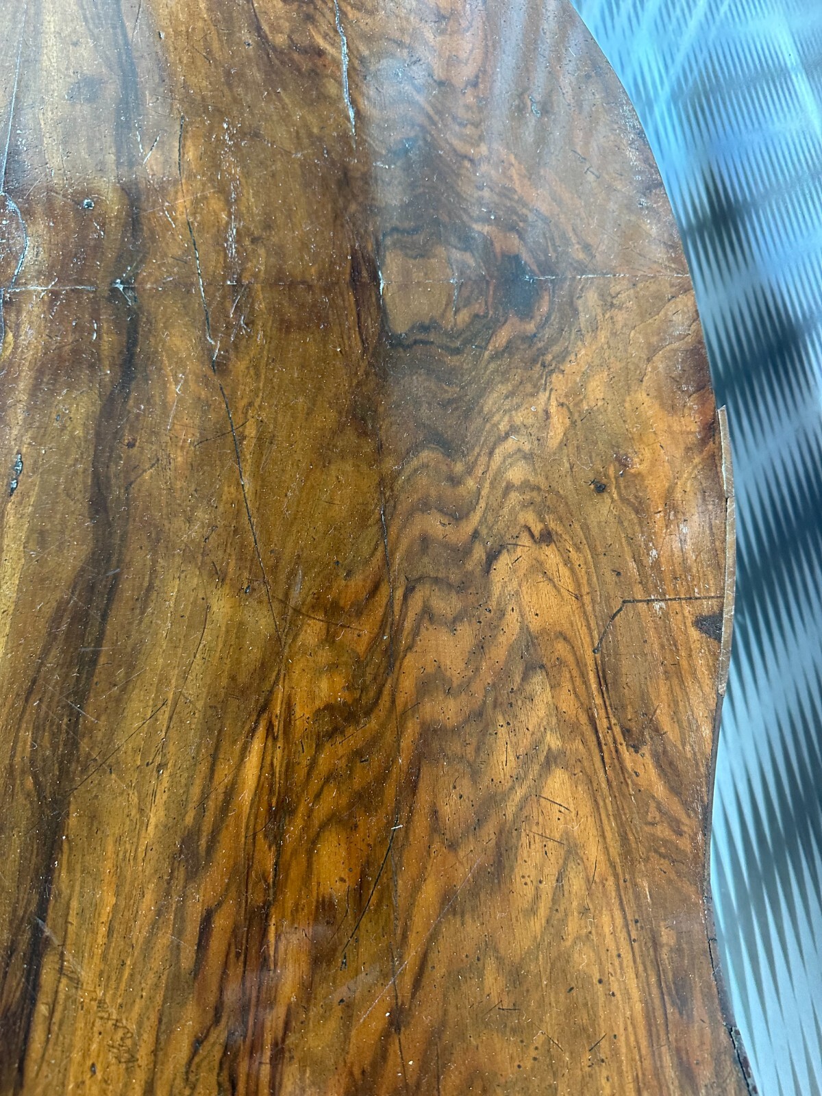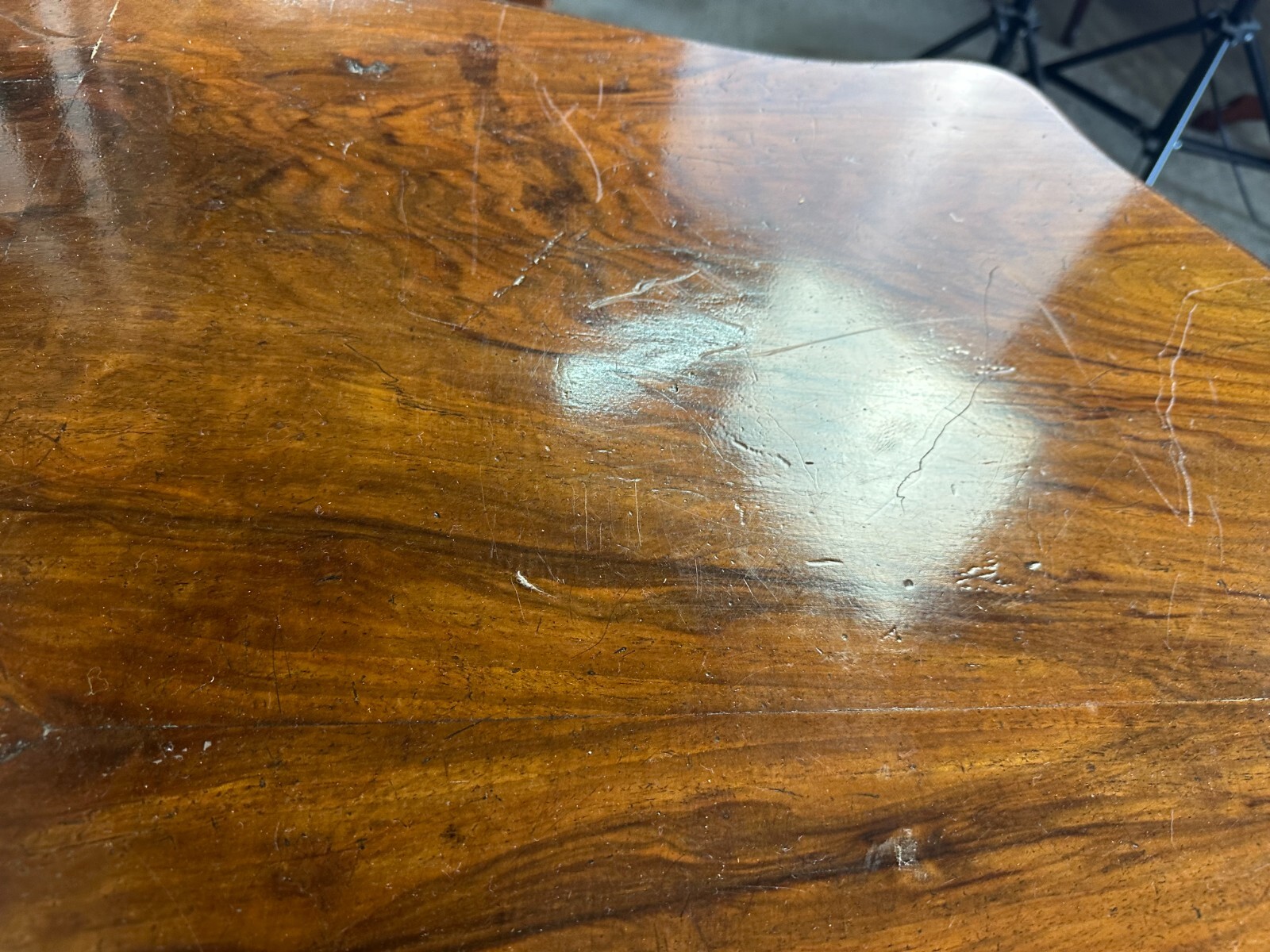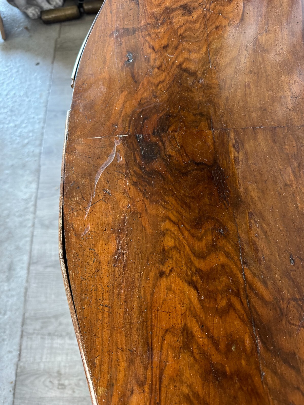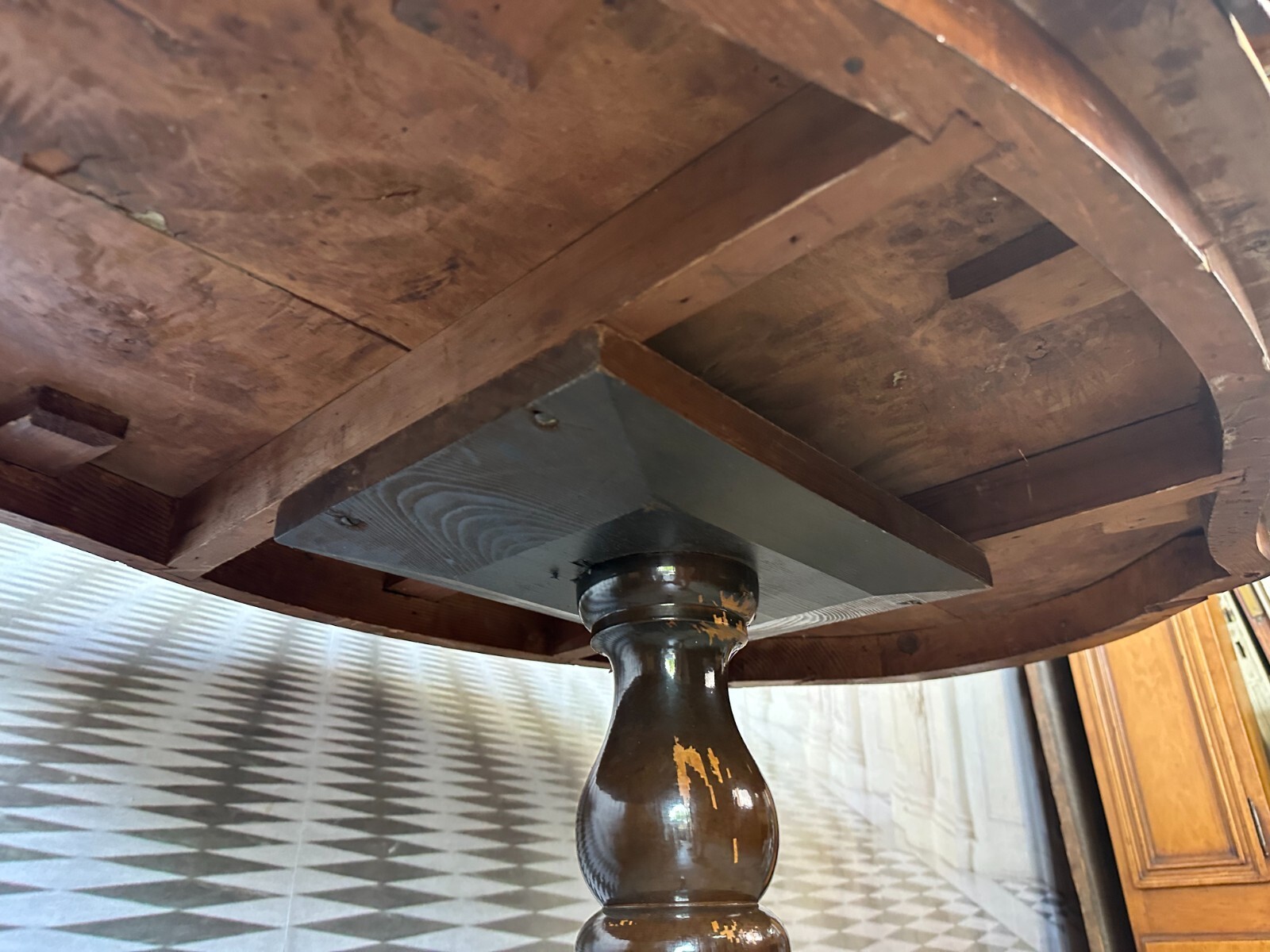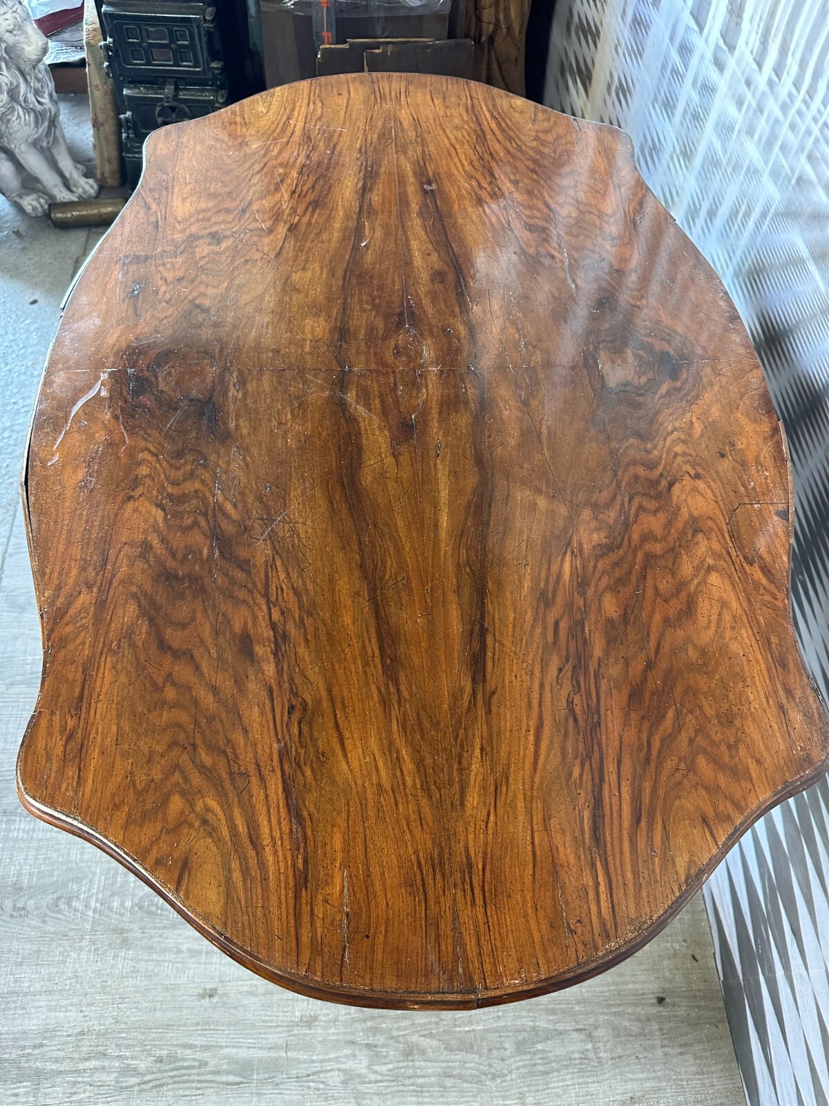 Antiker Beistelltisch, zweite Hälfte 19tes Jahrhundert. Fuß wurde mal komplett übermalt und ist an diversen Stellen berieben, die obere Platte Mahagoni furniert, diverse Druck- und Abriebsstellen. Die seitliche Leiste ist zum Teil lose und unvollständig, es wird nur das abgebildete lose Stück mitgeliefert. Der Seitenrand unterhalb der Platte ebenfalls mit Fehlteilen. Stabiler Zustand, Abmessungen BTH: 111x72x78cm.
