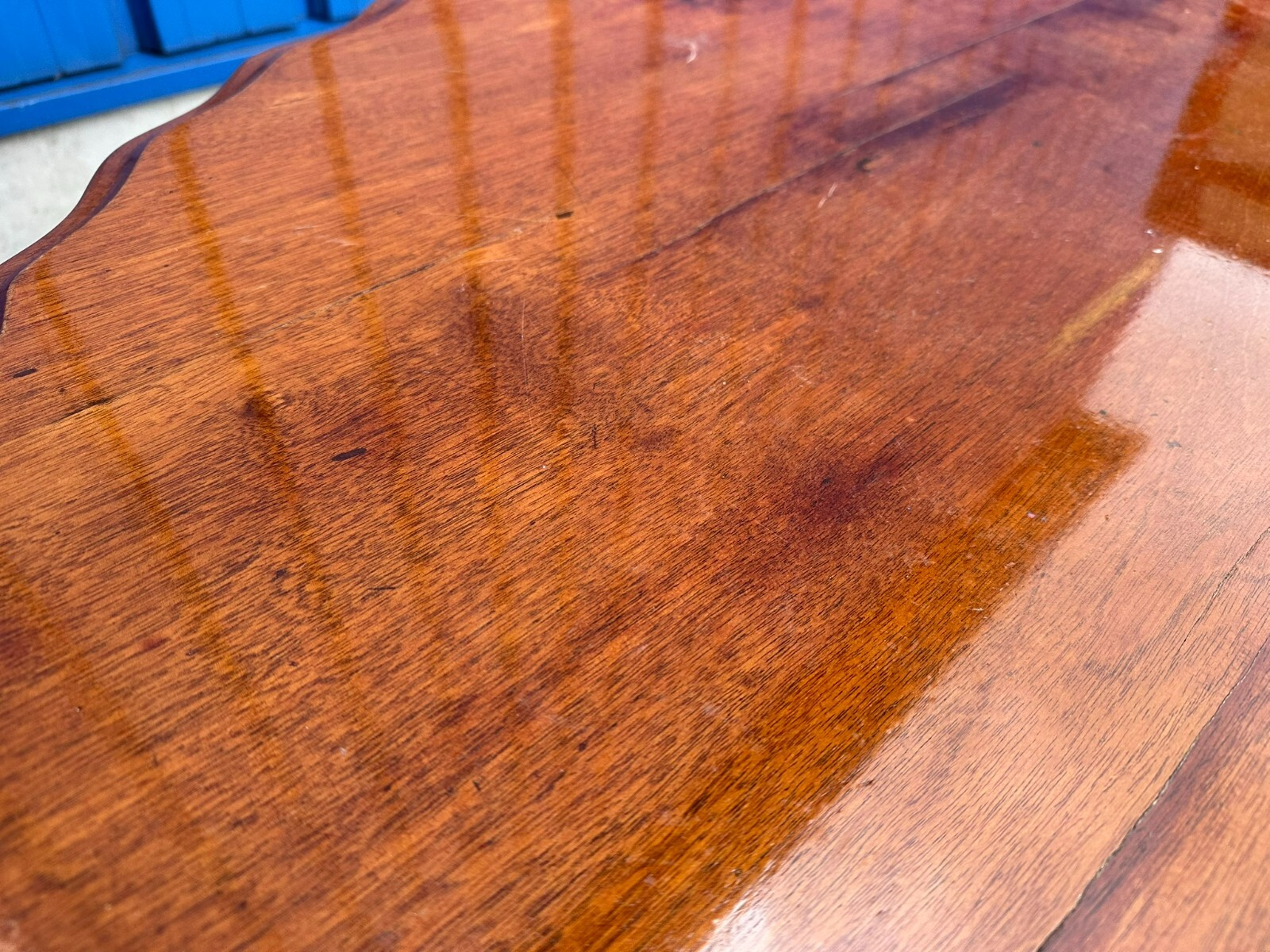 Antiker Beistelltisch um 1860, Spät Biedermeier. Komplett aus Mahagoni gefertigt. Der Tisch wurde mal überarbeitet, Dehnungsrisse geklebt. An der oberen Platte wurde vor kurzem eine komplett neue Lackschicht überzogen, hier Kratzer, kleinere Bestossungen und dunklere Stellen. Der Fuß ist berieben, Metallplatte eingesetzt. Höhe/Durchmesser 70/93cm.