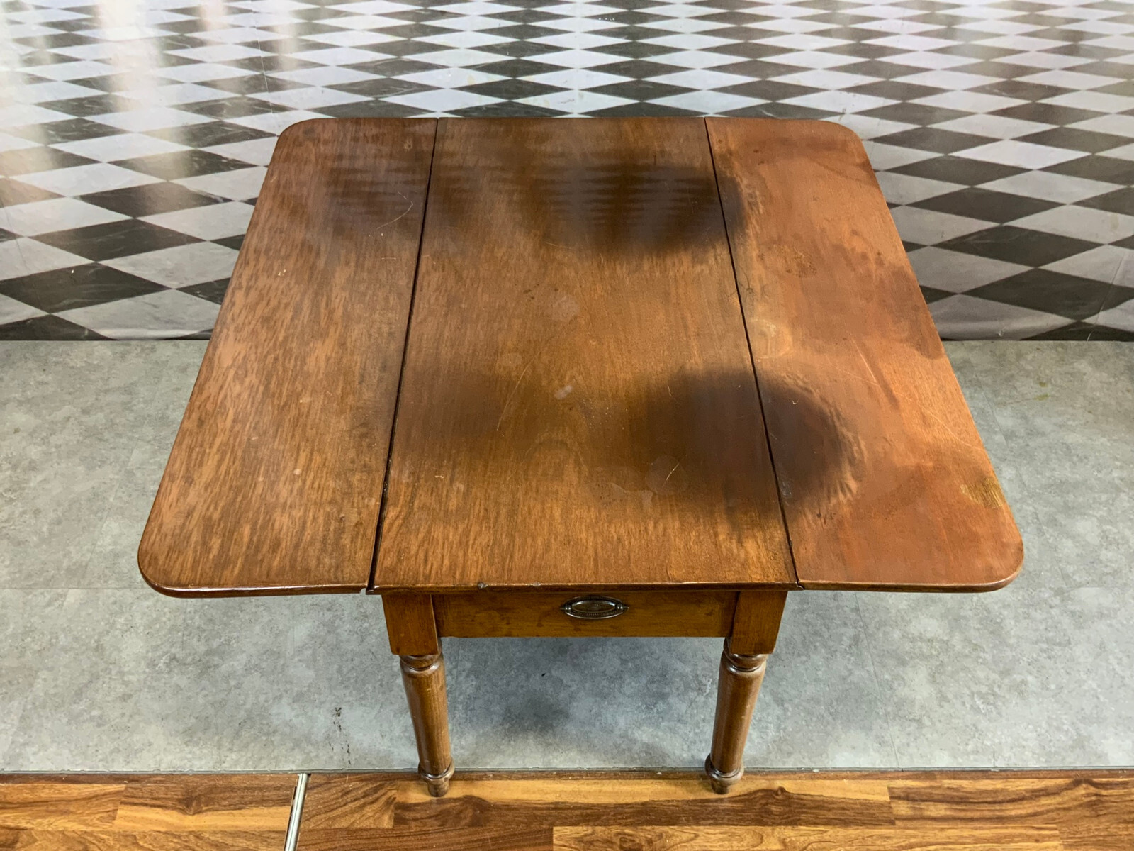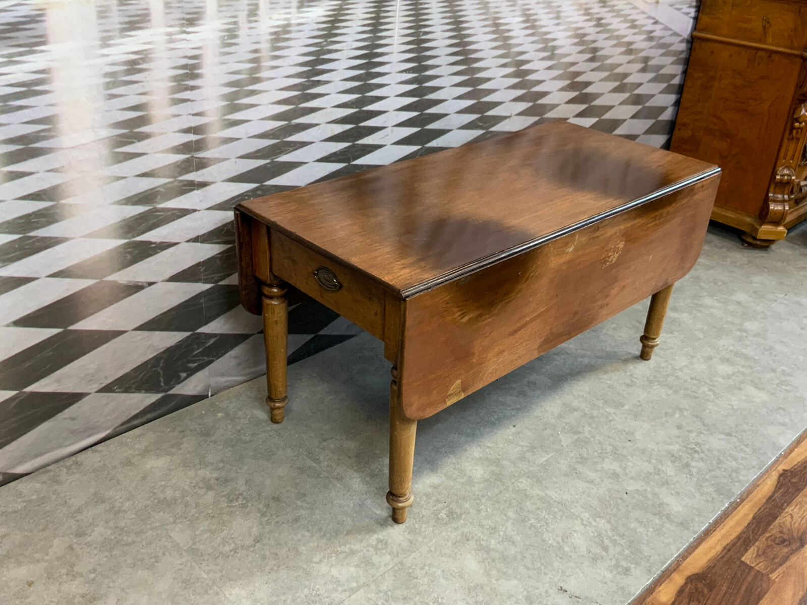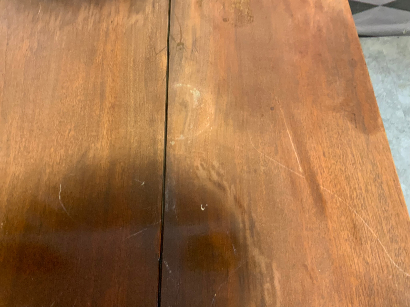Antiker englischer Beistelltisch, Mahagoni furniert. Oberfläche mit vielen Flecken und Kratzern, auch an den Beinen. Stabiler Zustand. Abmessungen BTH 95/45/51cm. Tischfläche aufgeklappt 95x92cm. Ein Seitenteil leicht verzogen, hier ist das Scharnier leicht locker. Im Kantenbereich kleinere Bestossungen.