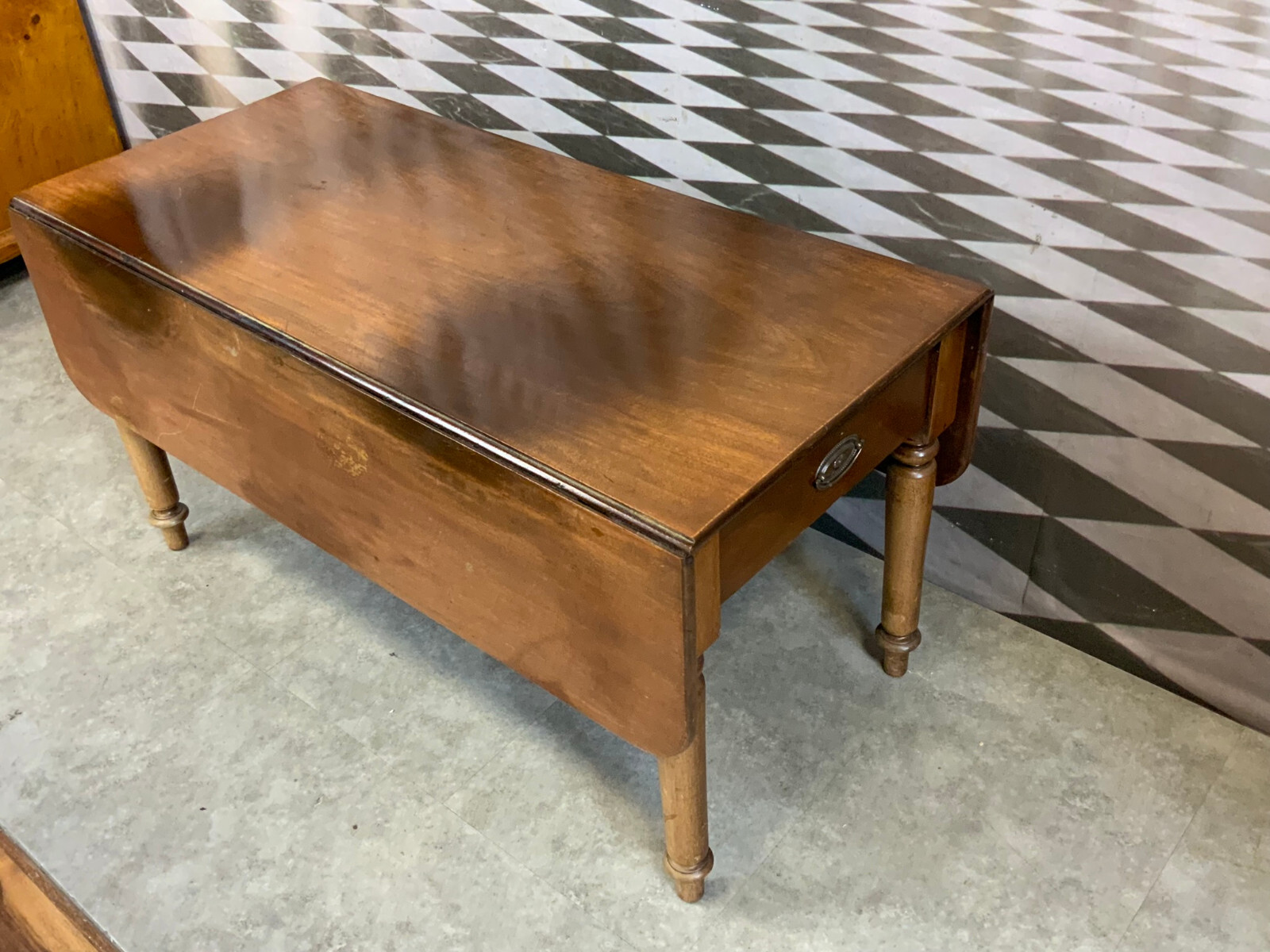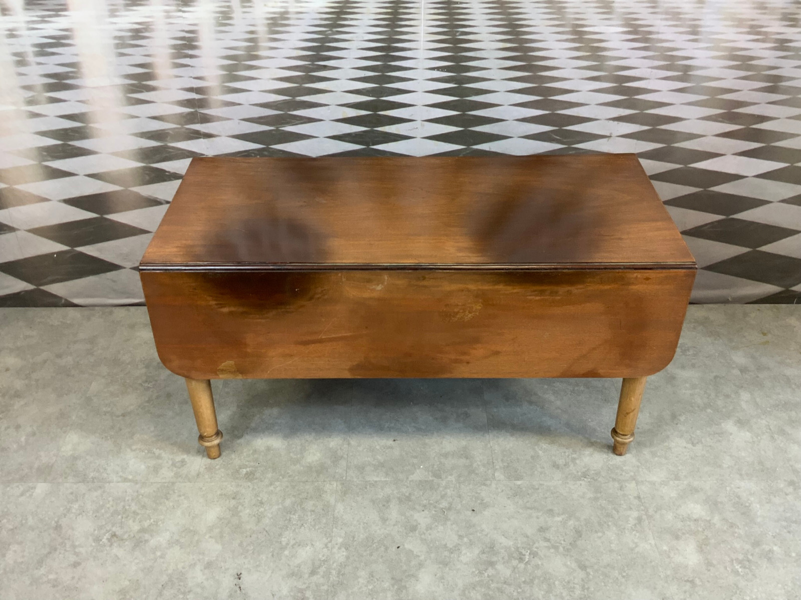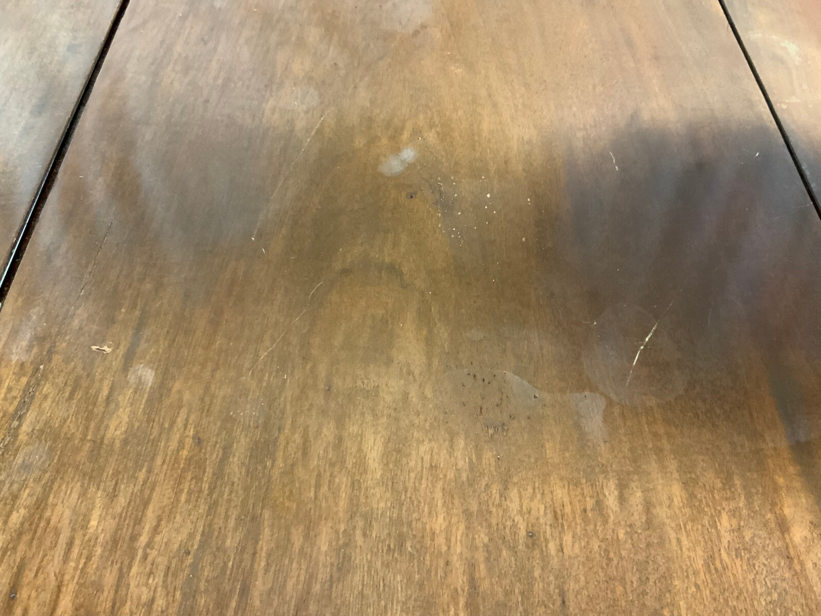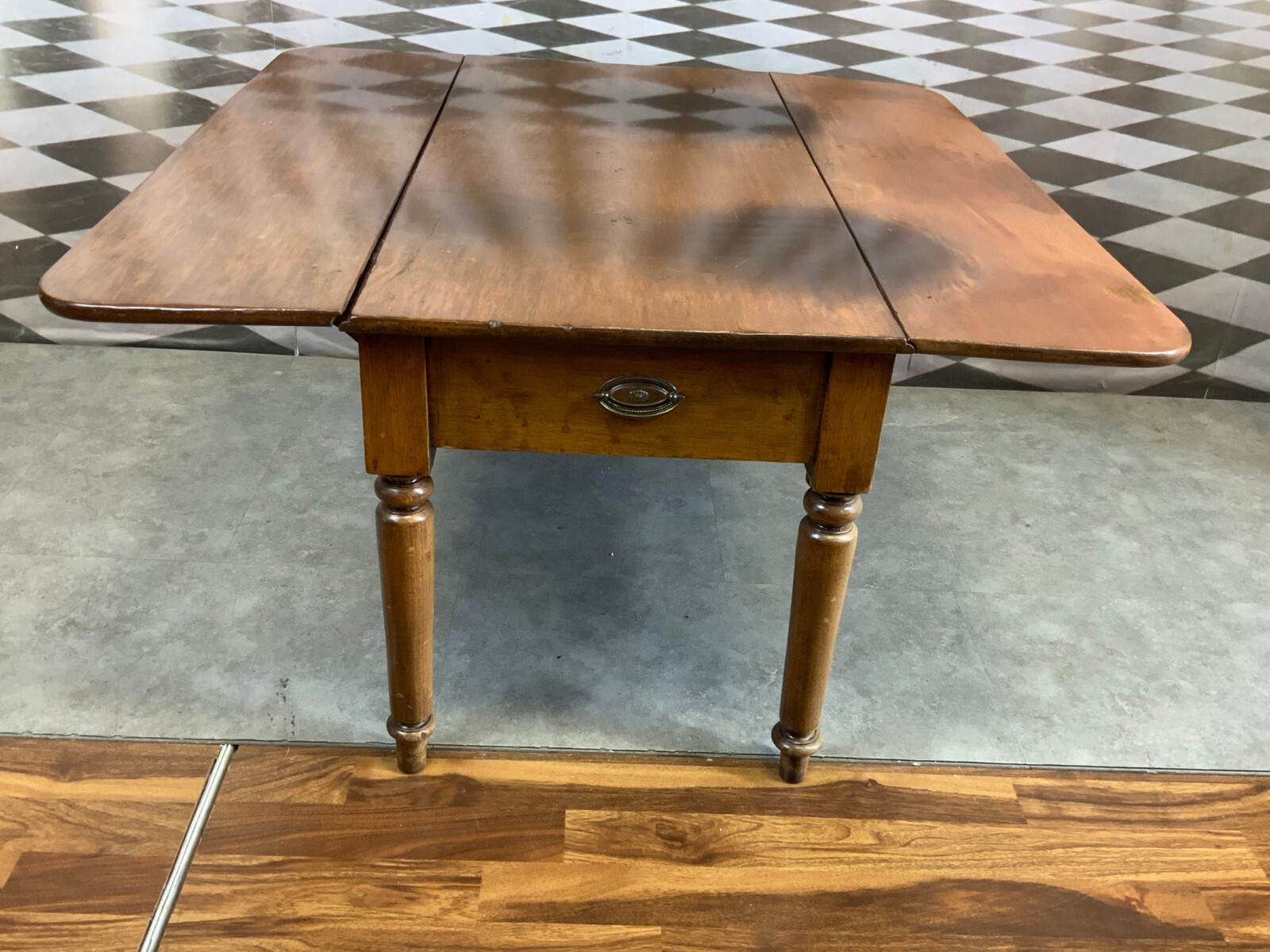 Antiker englischer Beistelltisch, Mahagoni furniert. Oberfläche mit vielen Flecken und Kratzern, auch an den Beinen. Stabiler Zustand. Abmessungen BTH 95/45/51cm. Tischfläche aufgeklappt 95x92cm. Ein Seitenteil leicht verzogen, hier ist das Scharnier leicht locker. Im Kantenbereich kleinere Bestossungen.