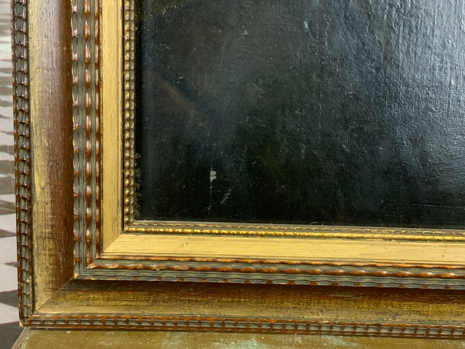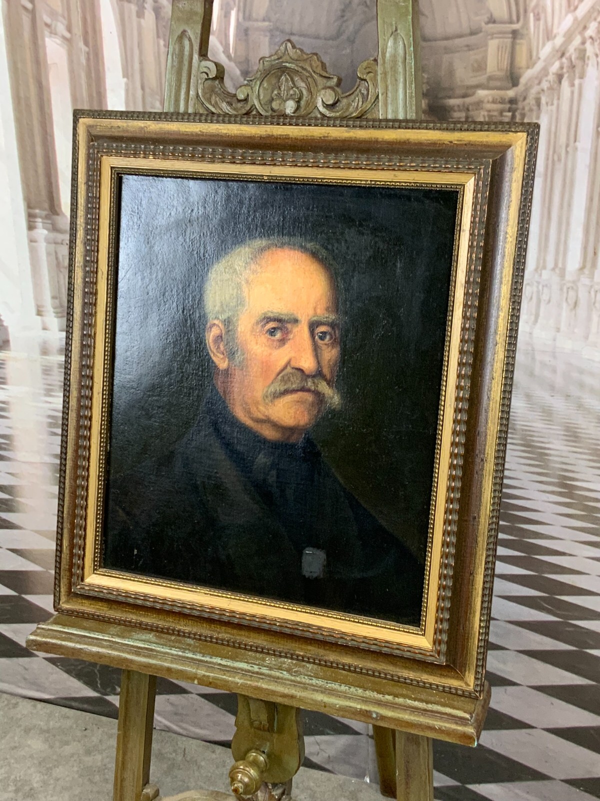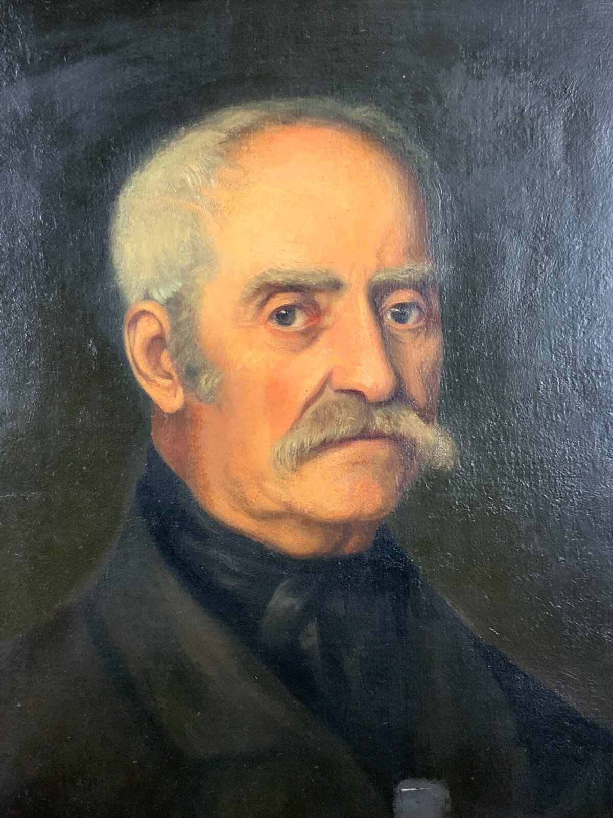 Antikes Ölgemälde auf Leinwand, 19-tes Jhdt, Portrait eines Herren, unsigniert. Der neuzeitige Rahmen hat kleinere Bestossungen. Das Gemälde hat diverse Übermalungen unten links berieben, unten rechts unprofessionel überklebter Leinwandschaden mit schwarzer Übermalung. Das Gemälde wurde mal doubliert. Abmessungen 44,5x52cm, mit Rahmen 58x67cm.