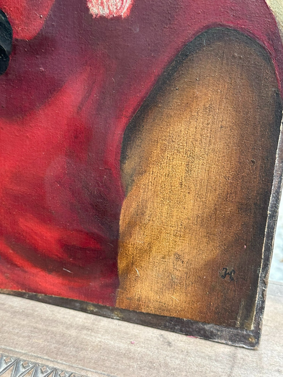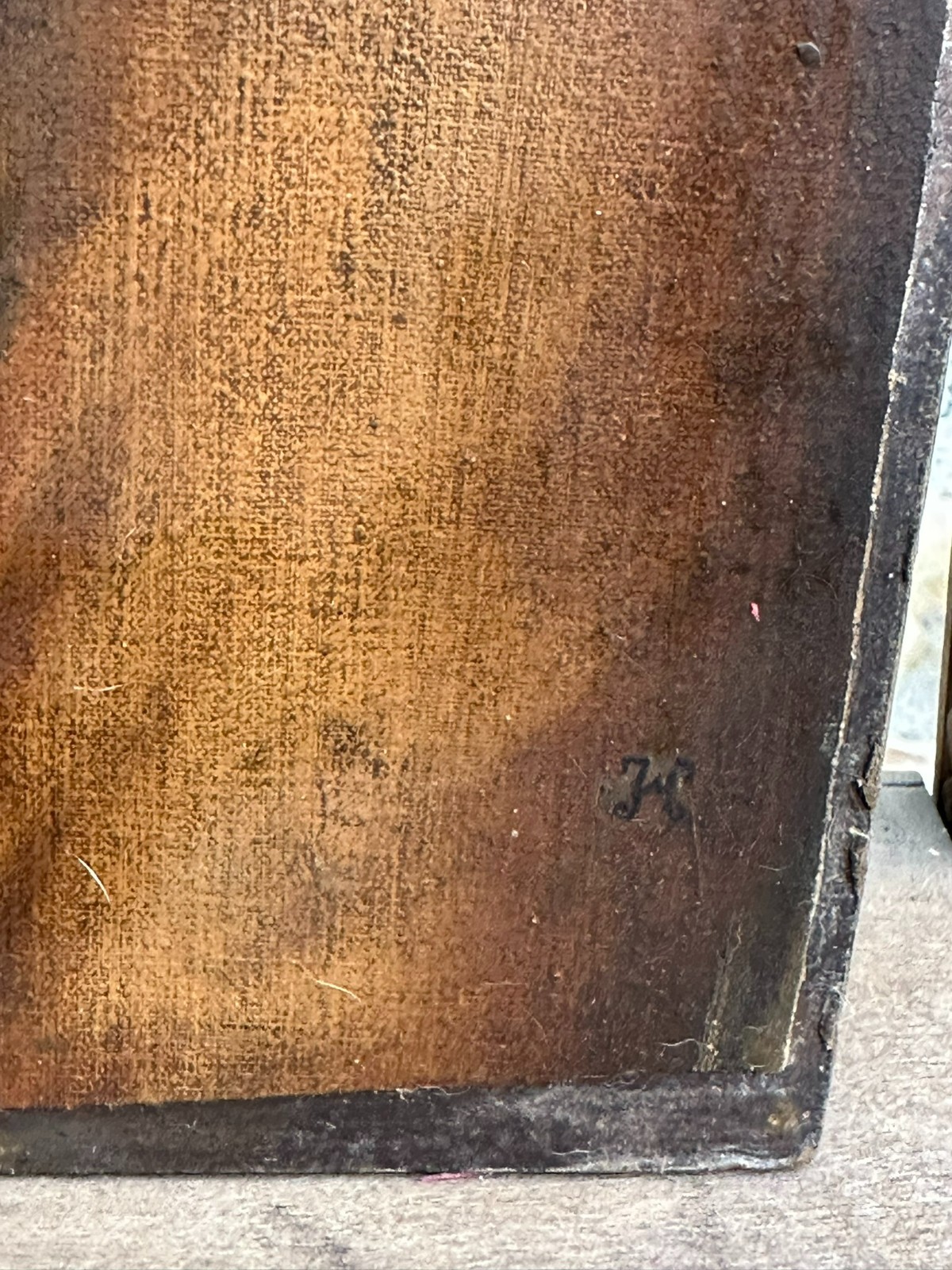 Ölgemälde auf Leinwand, auf Holz doubliert. Der Firnis zum Teil vergilbt und verdreckt, unten rechts Monogramm. Die Leinwand ist im Randbereich zum Teil ungerade geschnitten. Beileigend eine Übersicht über mögliche Maler mit ähnlichen Monogrammen. Das Gemälde selbst dürfte MItte 19tes Jhd. entstanden sein. Abmessungen 35,5×46,5cm.