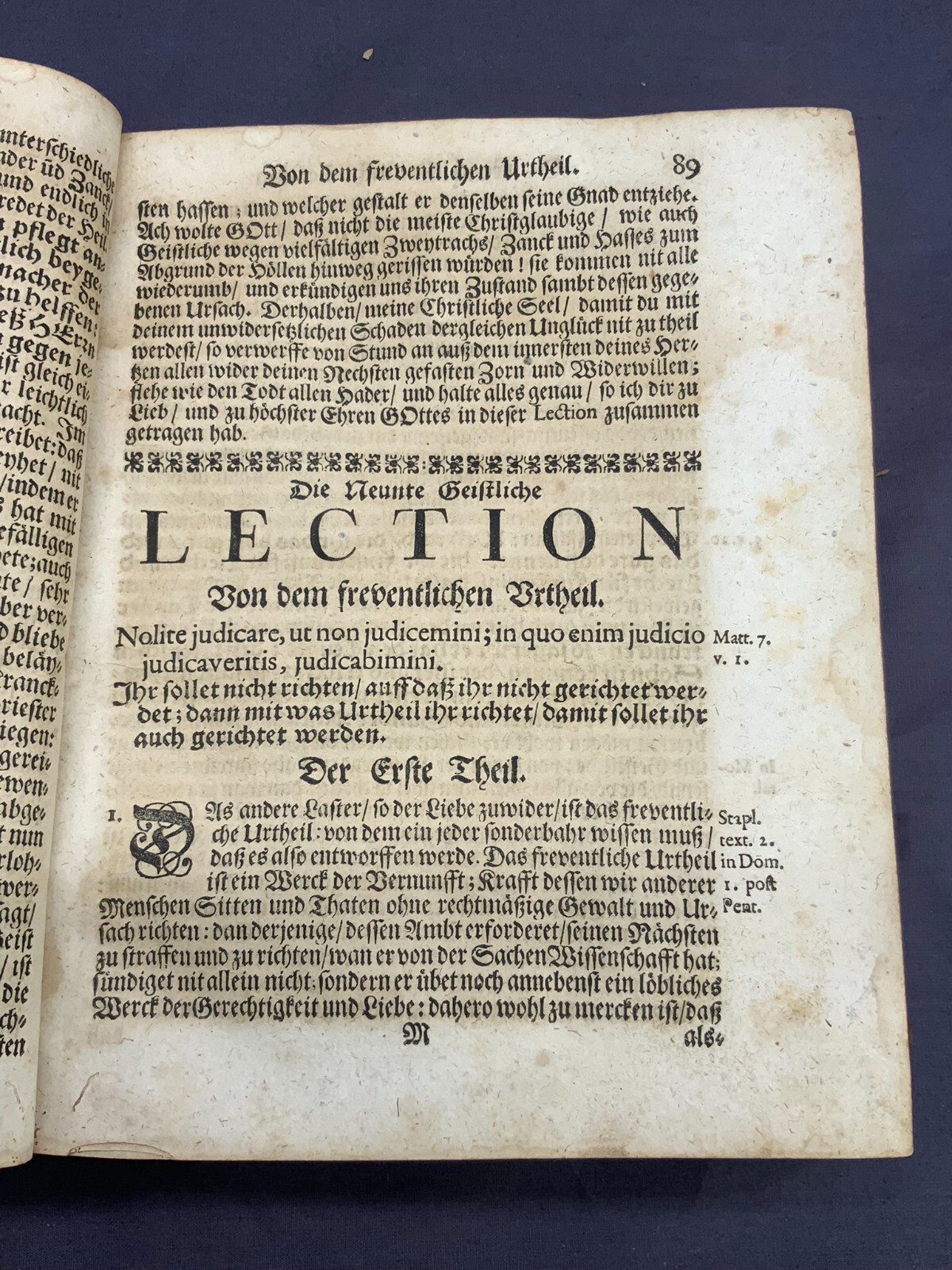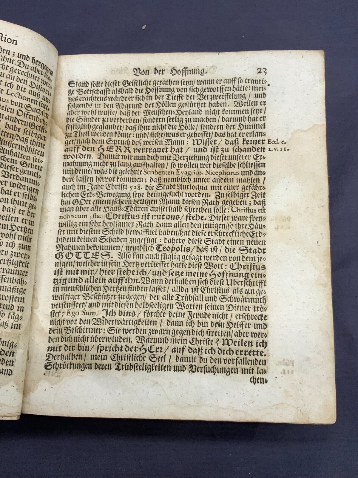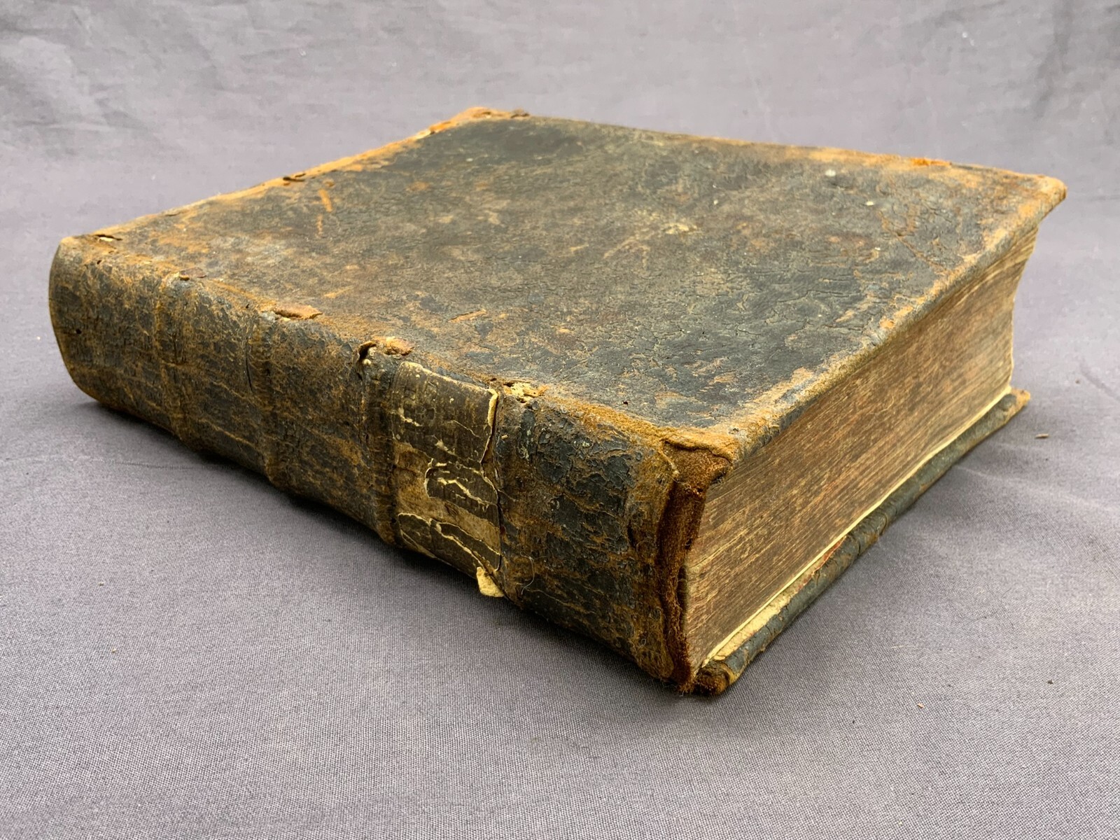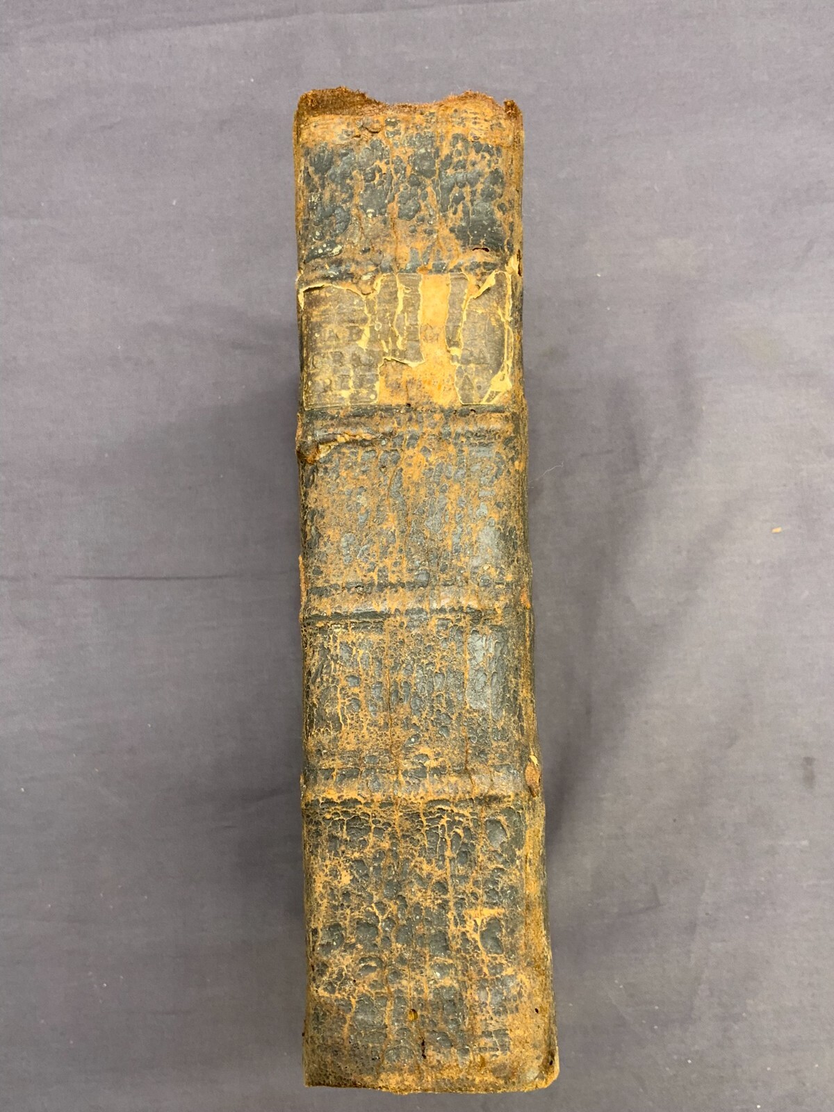 Antikes Buch wohl 1729, Einband und erste Seite überarbeitet. Auf den ersten Seiten Unvollständigkeit und das komplette Buch ist fleckig und vergilbt. Einband komplett berieben, diverse Schäden und teilweise alter inaktiver Wurmfraß. Abmessungen 18×21,5cm.