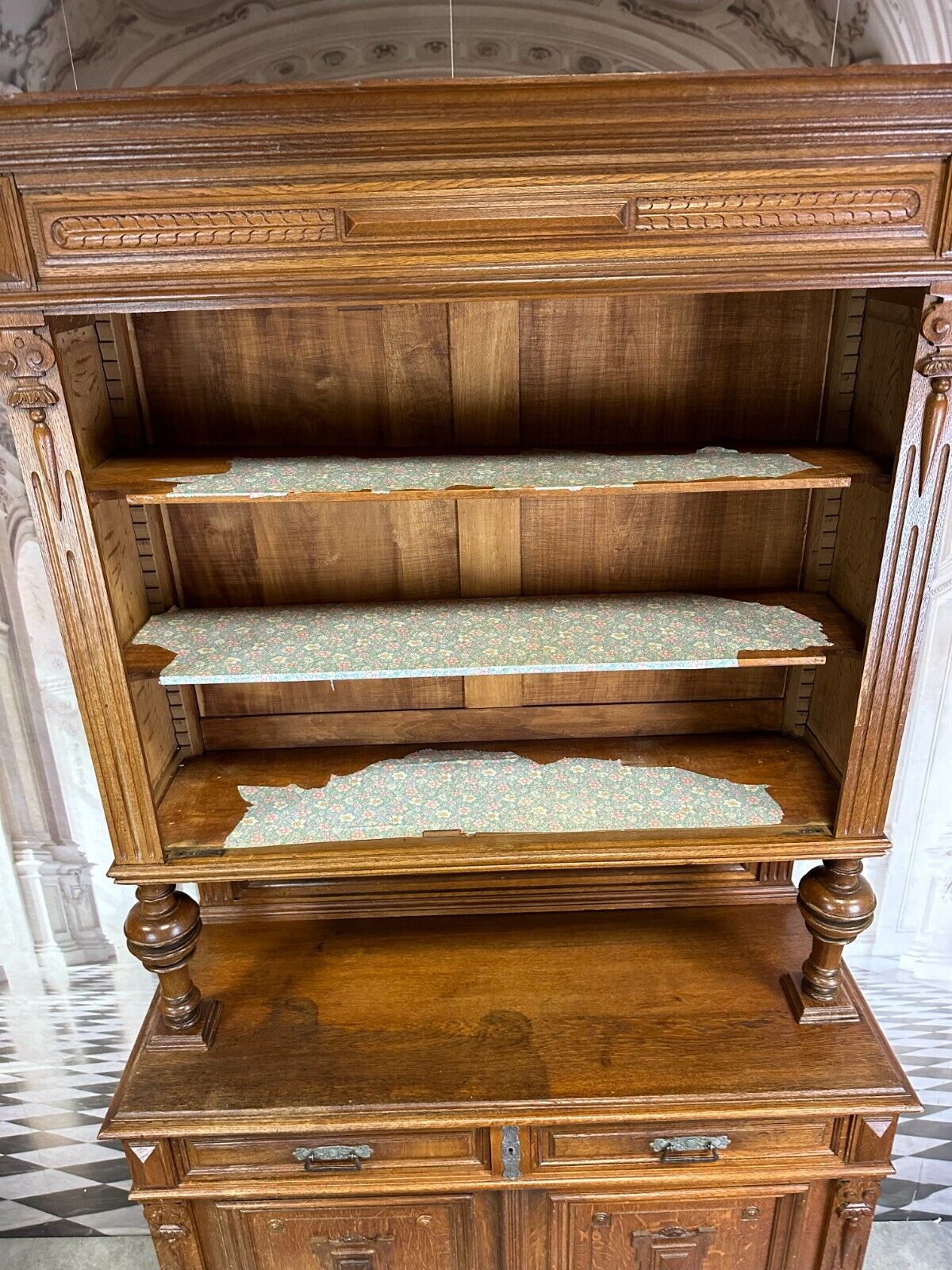 Antikes Buffet aus Eiche, Historismus um 1880, dreiteilig. Am Oberteil ehemals Türen, diese sind nicht mehr vorhanden. Die Ablagen dort wurden mit Folie beklebt, diese ist unvollständig und die Ablagen sind zum Teil klebrig. Mittlere Ablage mit Dehnungsriss und Flecken. An der rechten Seite unten Seitenwand erneuert, die komplette linke Seite ist verblasster als der Rest. Unterbau links mit Dehnungsriss. Kantenbereich ganz leicht bestoßen, obere rechte Ecke ebenfalls. Ohne Schlüssel, Schlösser ungetestet. Gesamtabmessungen BTH: 119x47x229cm.