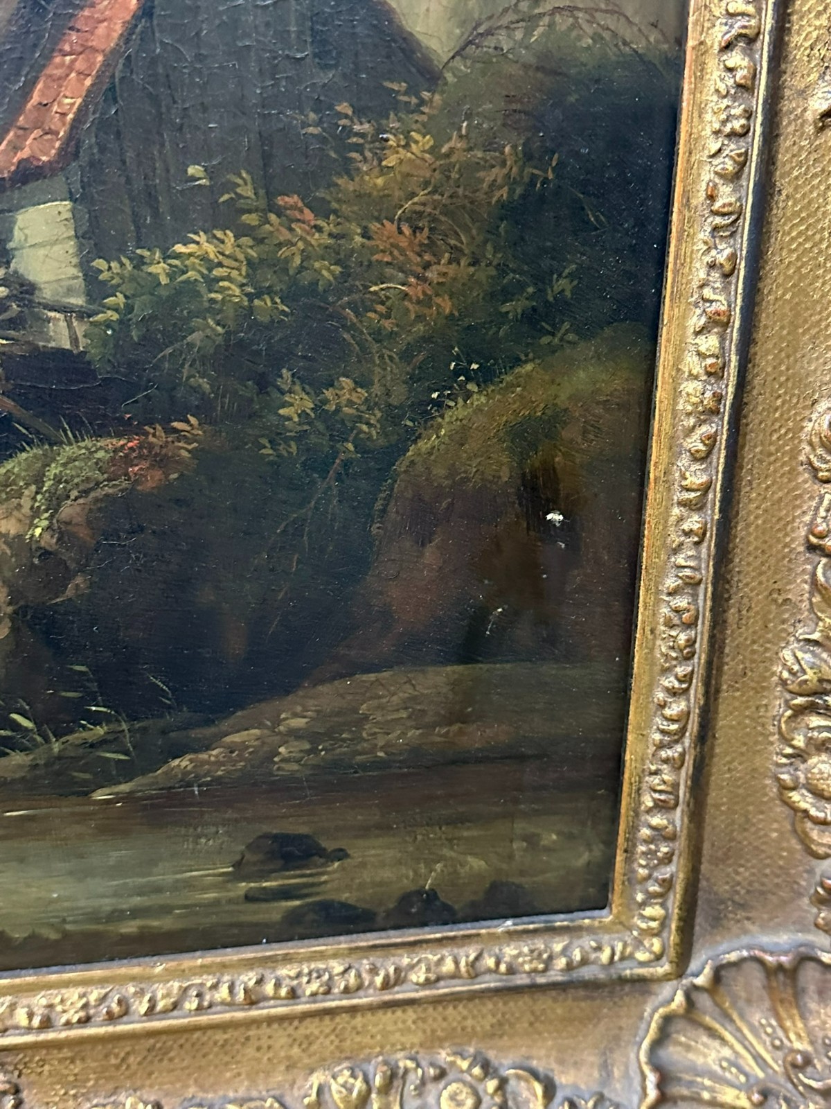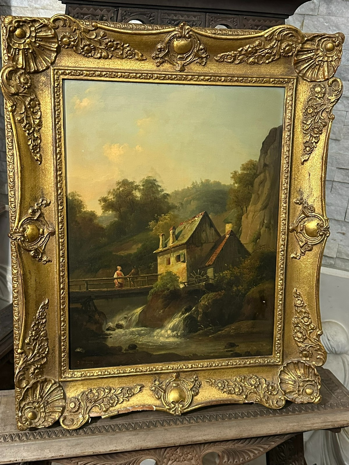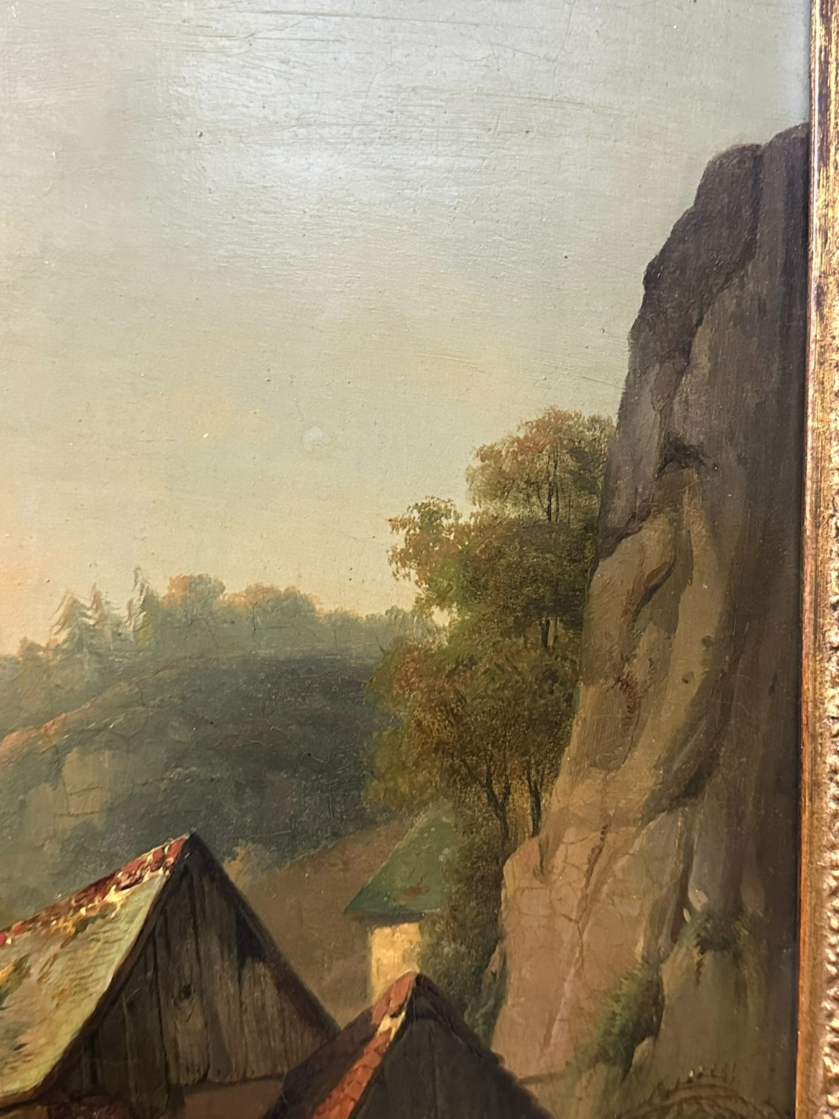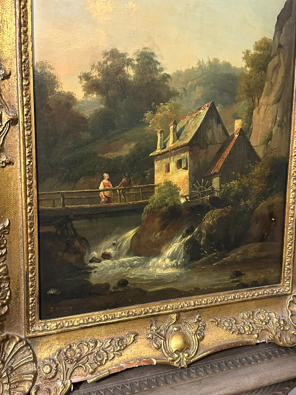 Ölgemälde auf Platte, unten links signiert. Unten rechts Farbabplatzer, der Firnis insgesamt vergilbt. Der Rahmen ist an der unteren Kante stärker beschädigt und fast lose. Abmessungen 39x51cm, mit Rahmen 57x69cm.