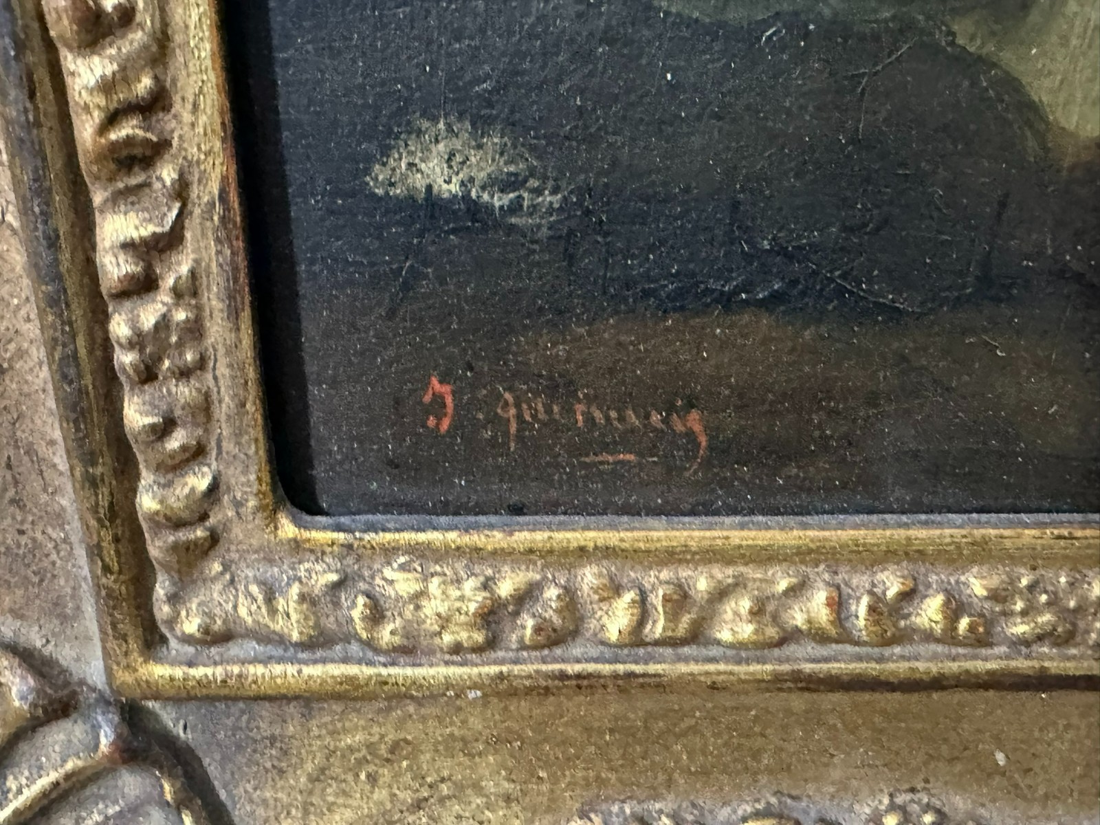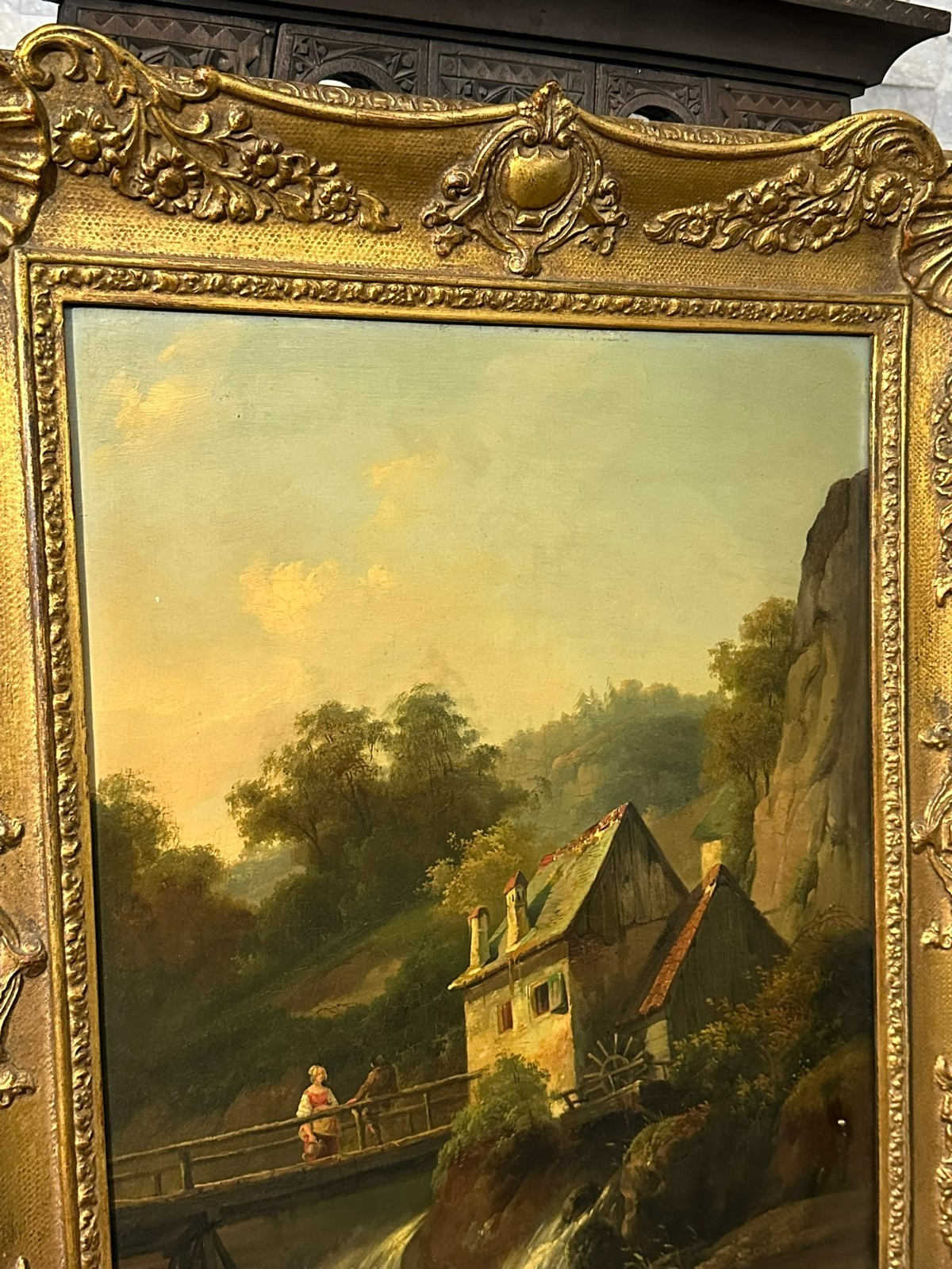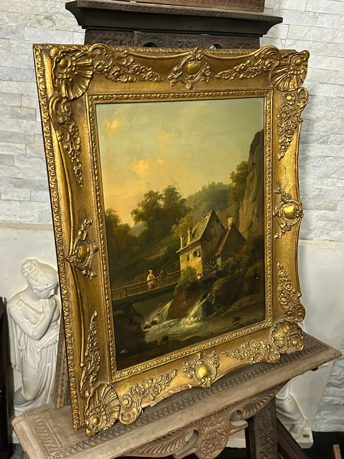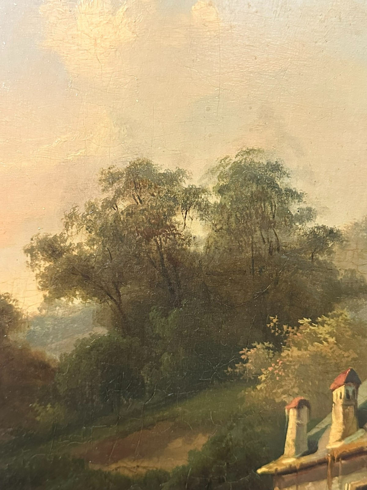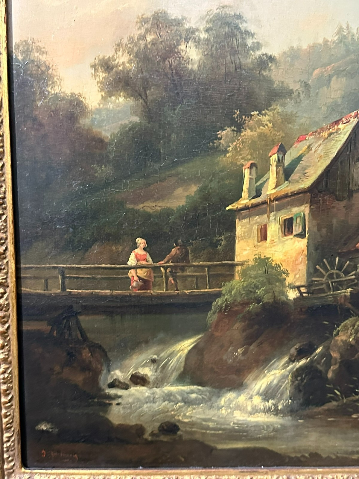 Ölgemälde auf Platte, unten links signiert. Unten rechts Farbabplatzer, der Firnis insgesamt vergilbt. Der Rahmen ist an der unteren Kante stärker beschädigt und fast lose. Abmessungen 39x51cm, mit Rahmen 57x69cm.