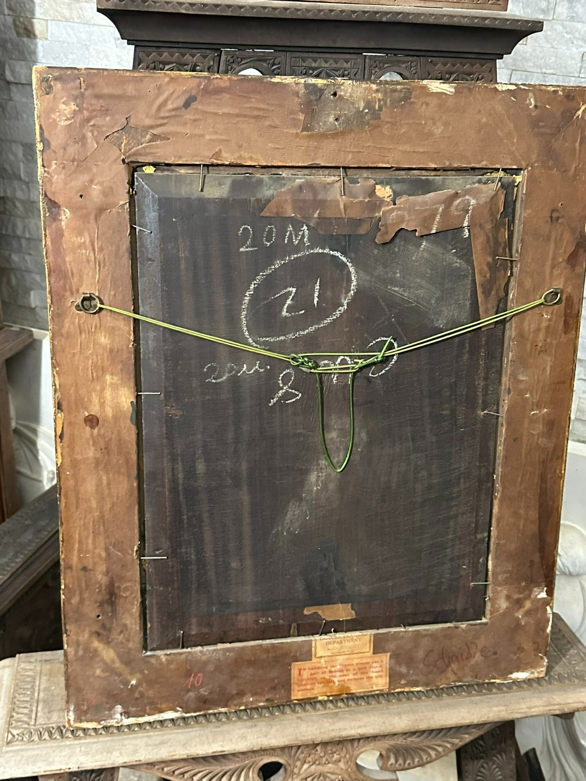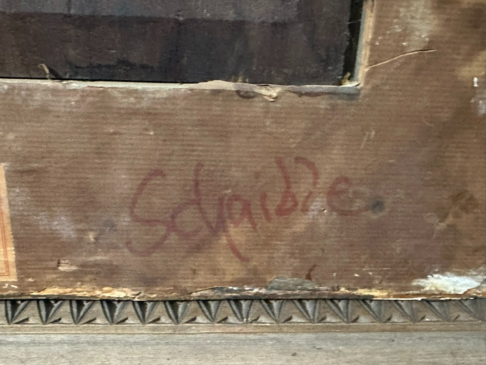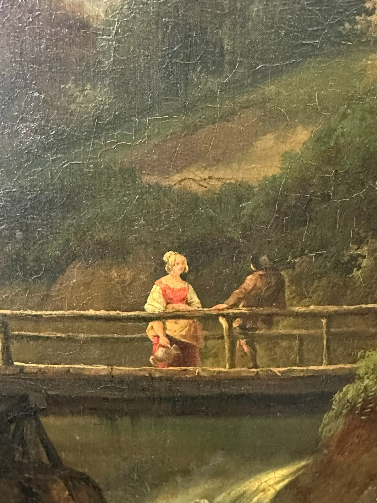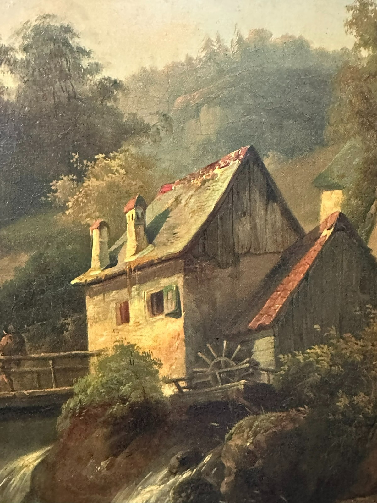 Ölgemälde auf Platte, unten links signiert. Unten rechts Farbabplatzer, der Firnis insgesamt vergilbt. Der Rahmen ist an der unteren Kante stärker beschädigt und fast lose. Abmessungen 39x51cm, mit Rahmen 57x69cm.
