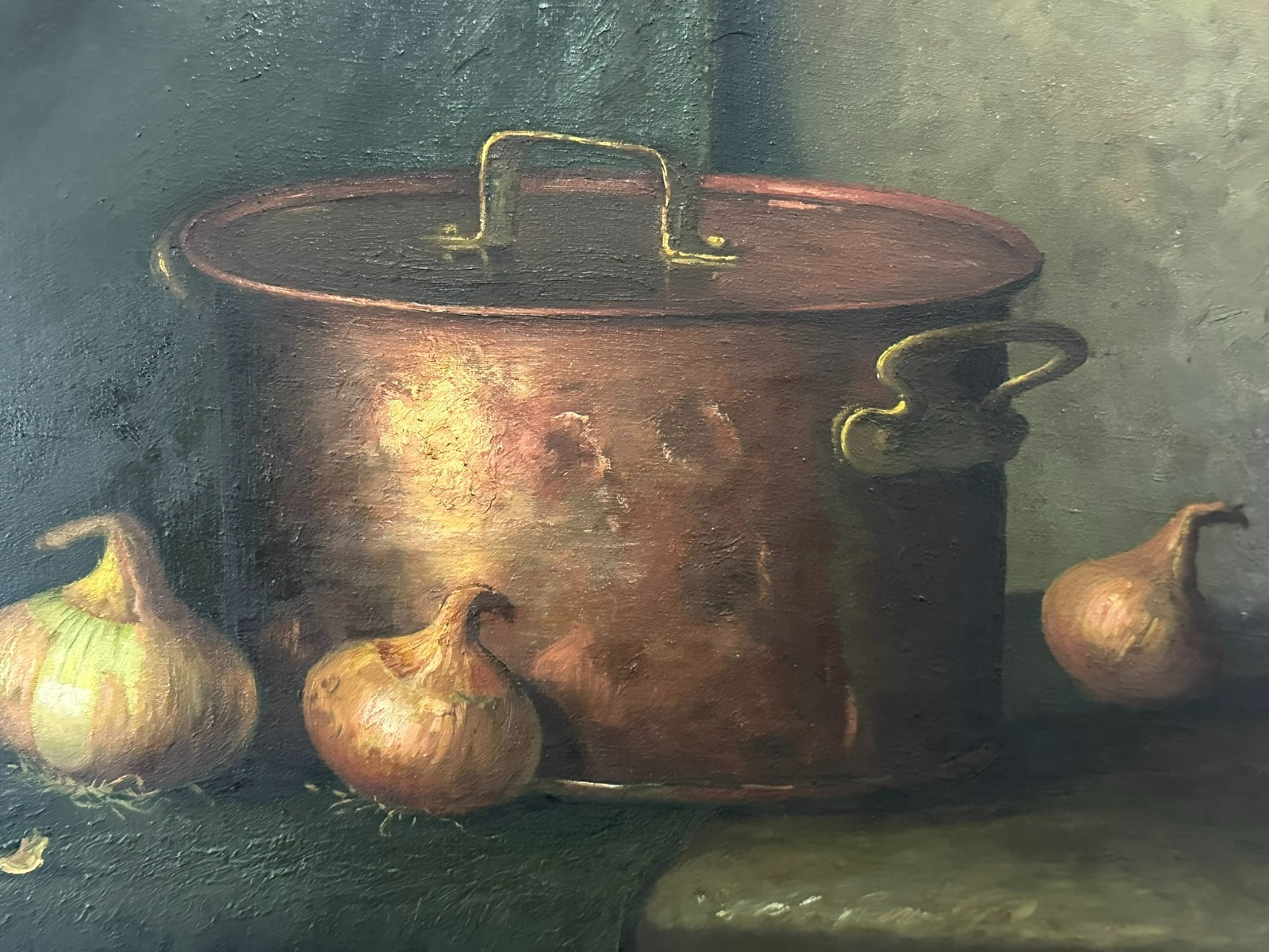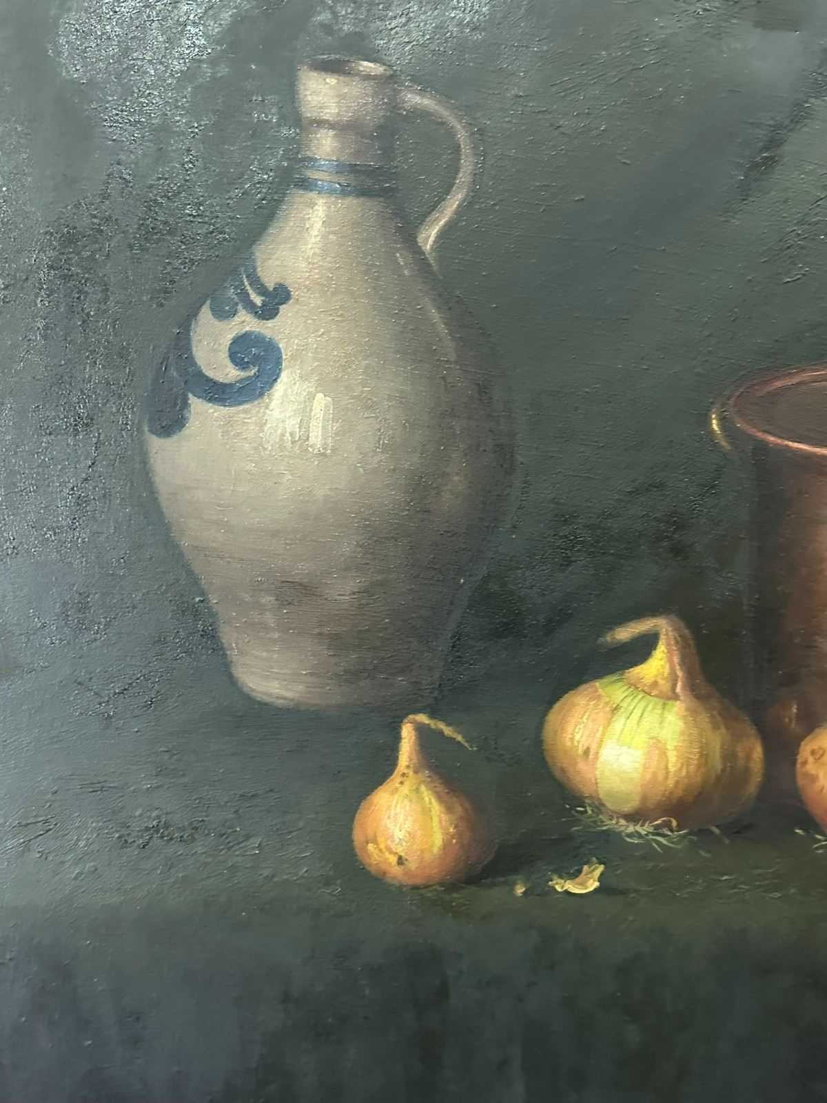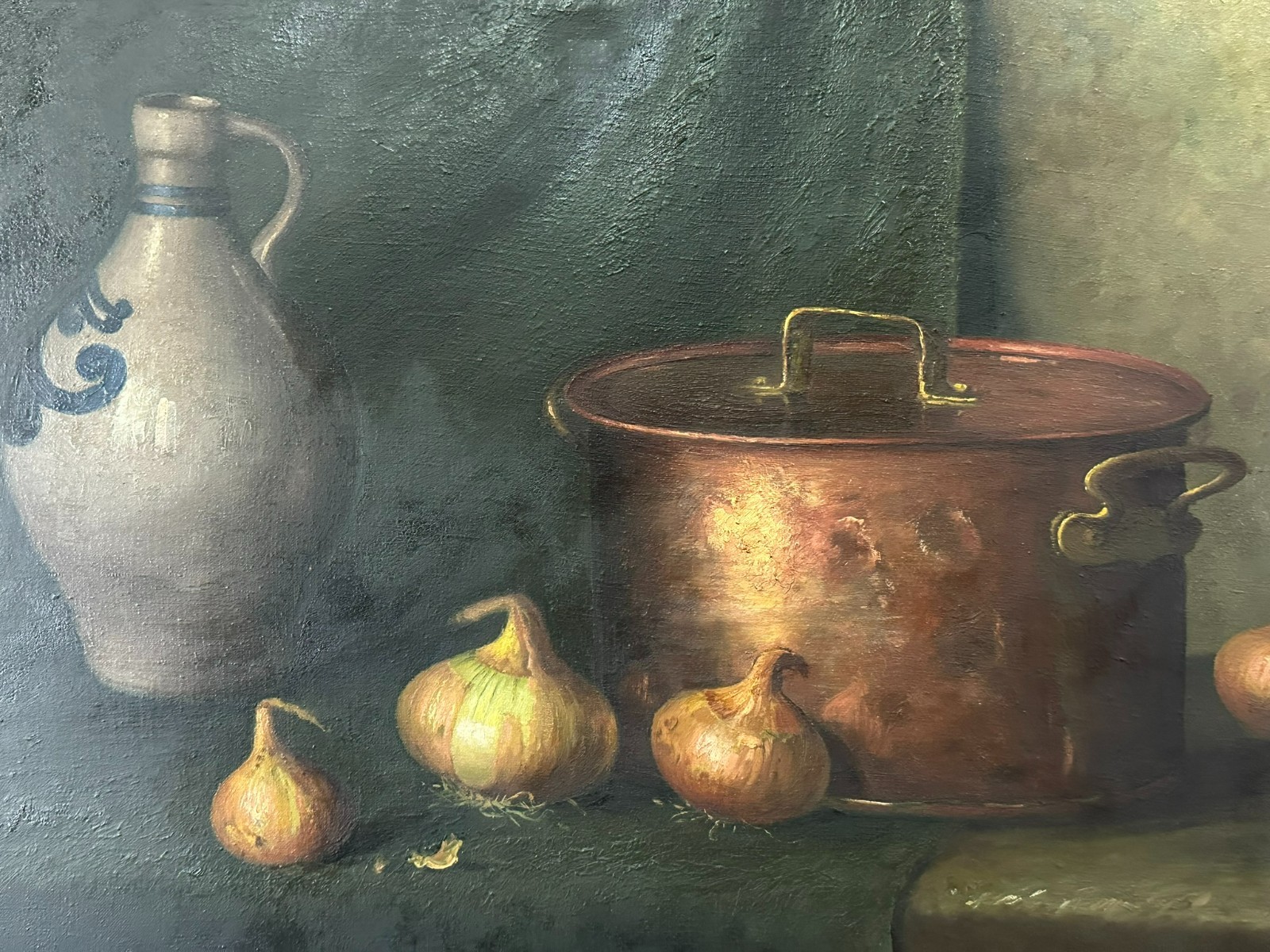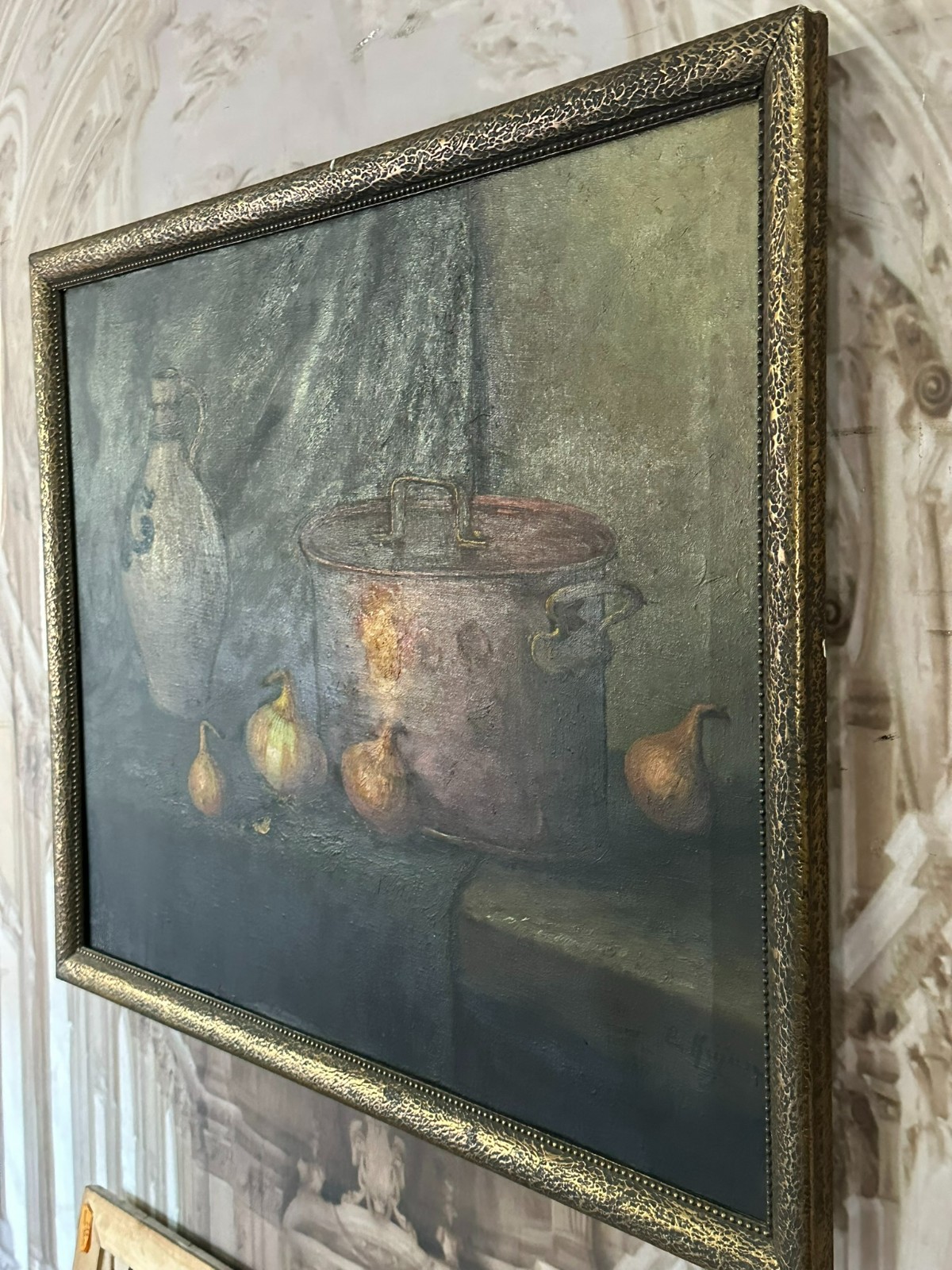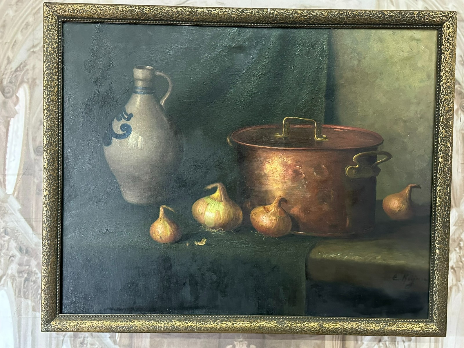 Altes Ölgemälde auf Leinwand, Stillleben mit Topf und Gemüse, unten rechts signiert. Der Firnis ist insgesamt vergilbt, der Neuzeitige Rahmen leicht berieben. Abmessungen 87x68cm, mit Rahmen 92x75cm.