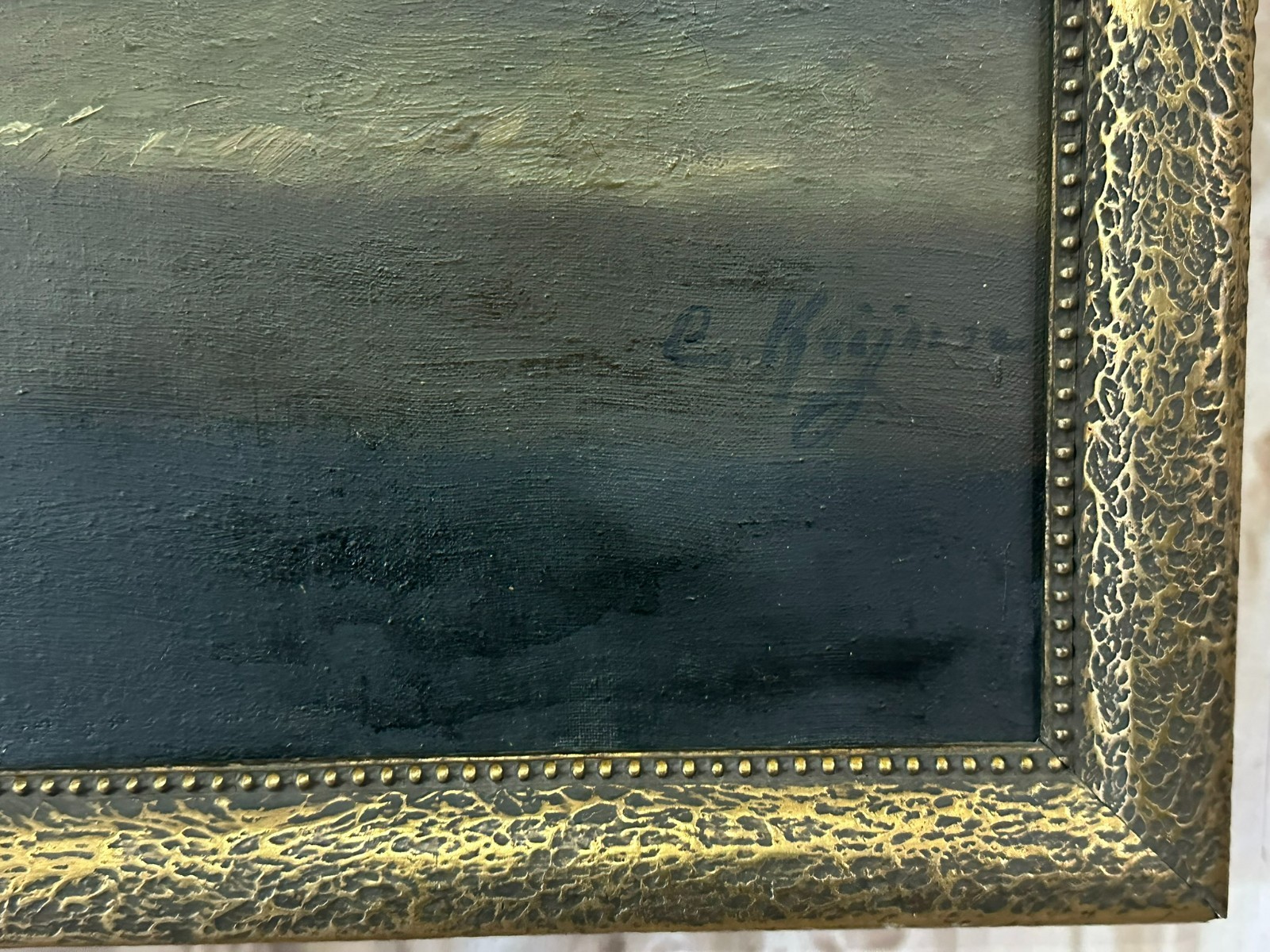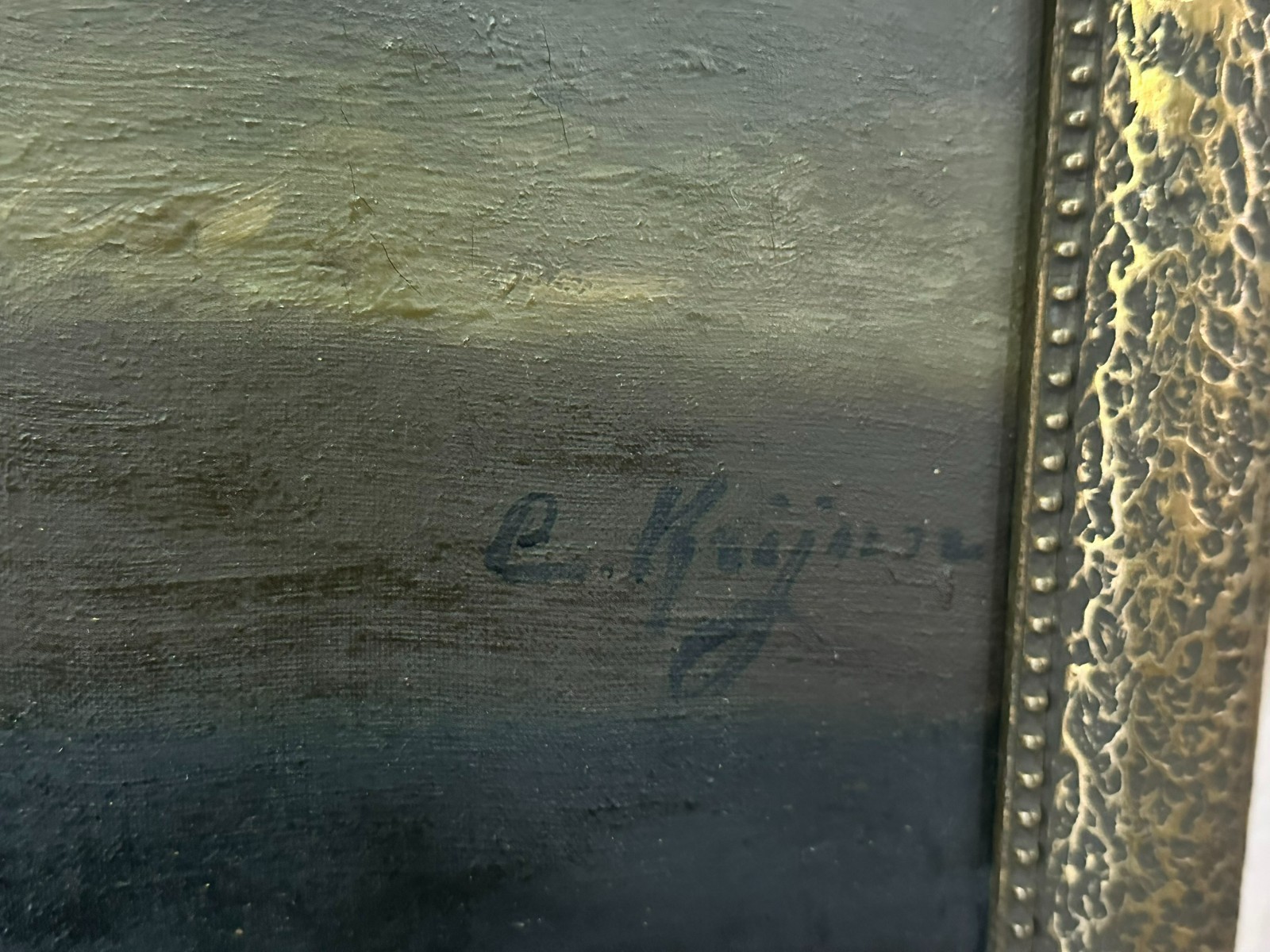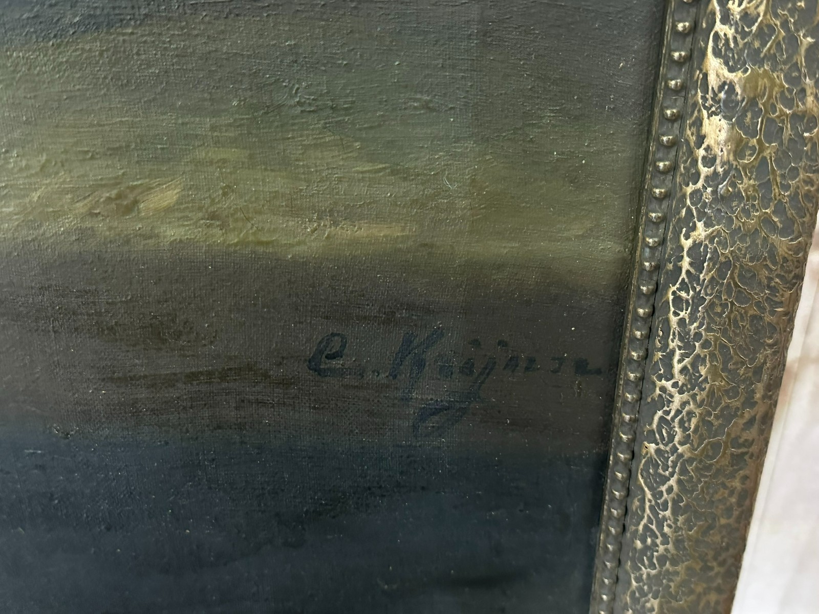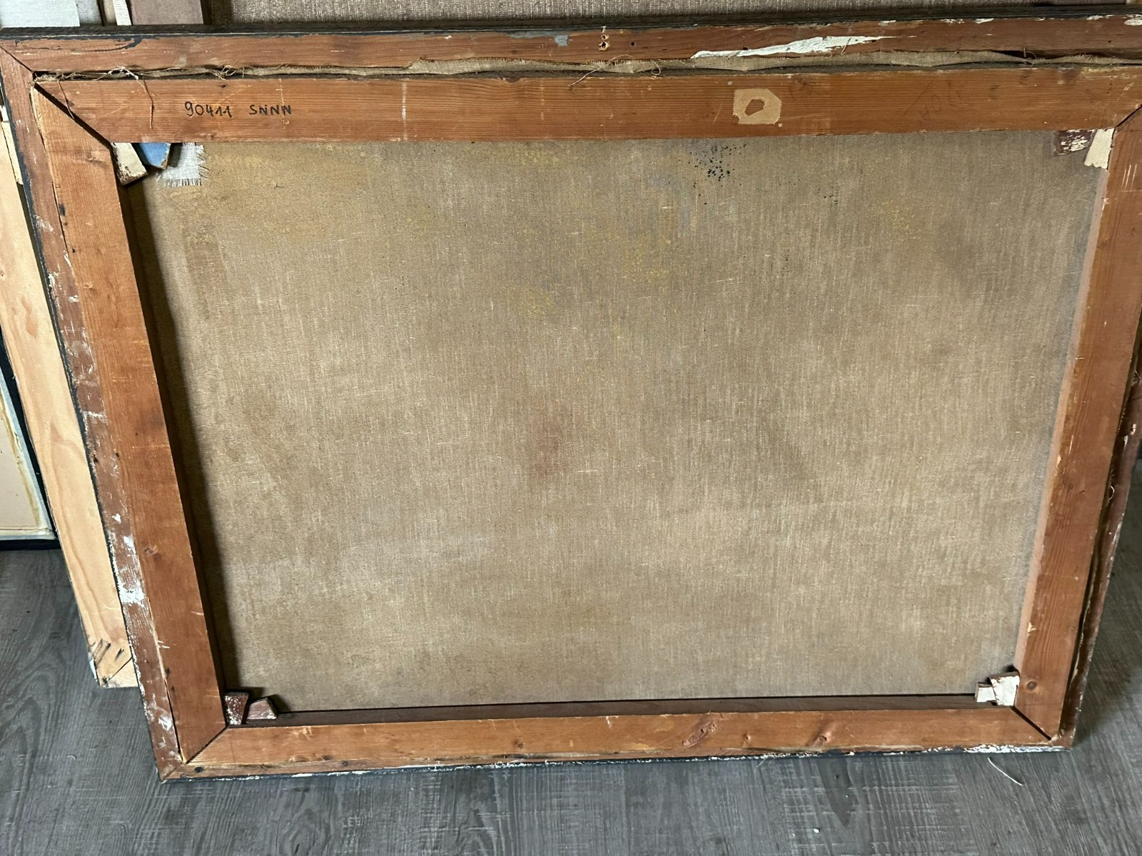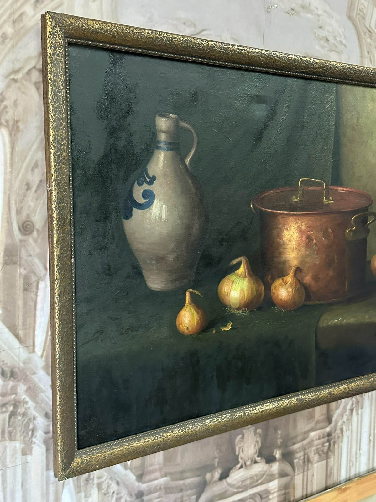 Altes Ölgemälde auf Leinwand, Stillleben mit Topf und Gemüse, unten rechts signiert. Der Firnis ist insgesamt vergilbt, der Neuzeitige Rahmen leicht berieben. Abmessungen 87x68cm, mit Rahmen 92x75cm.