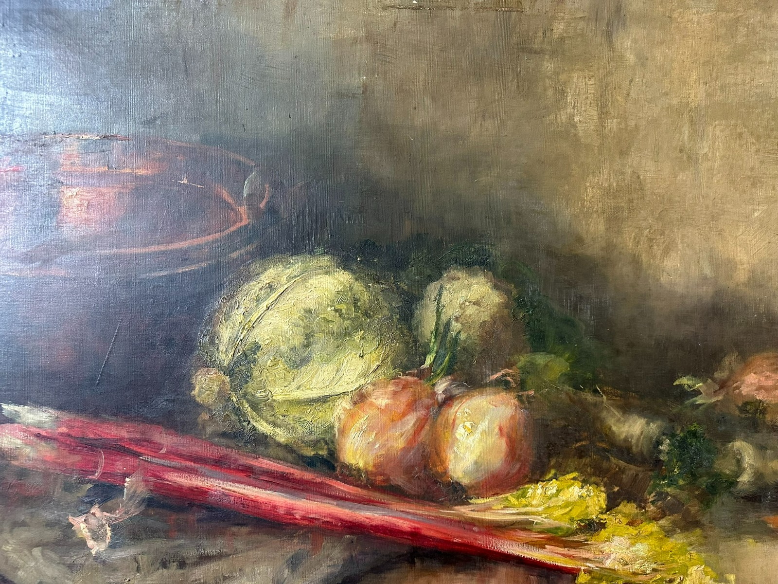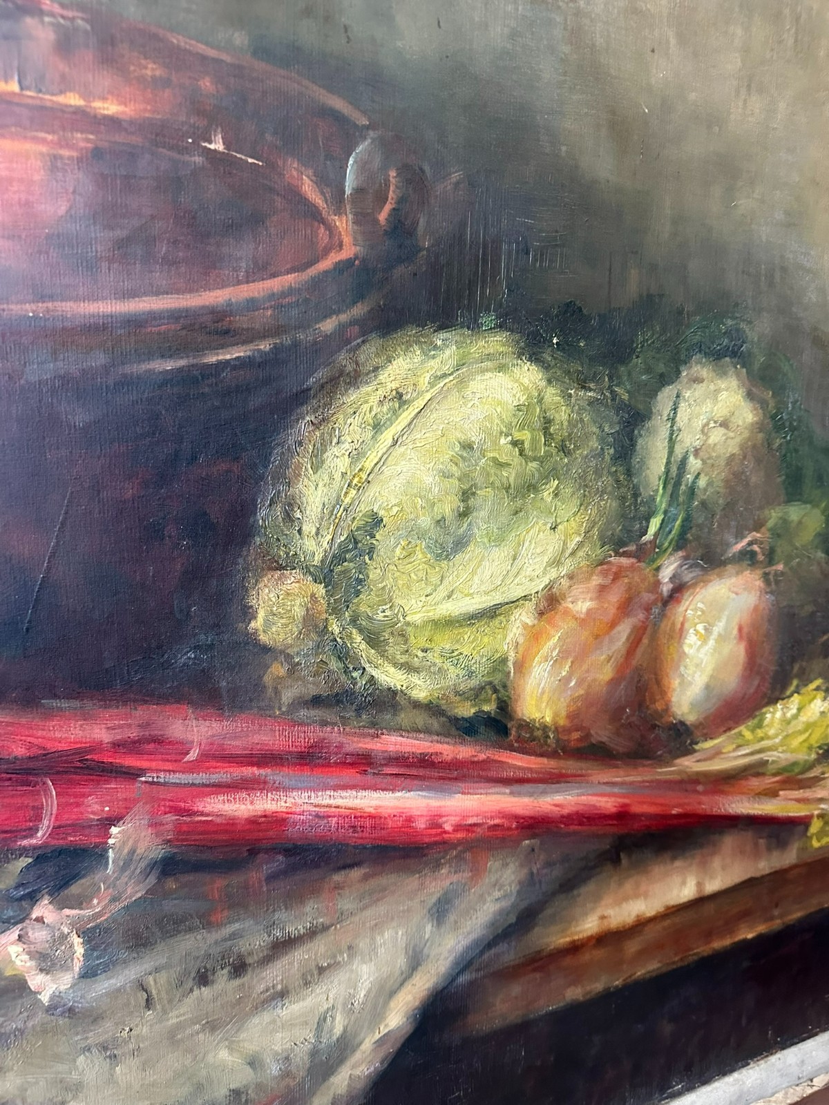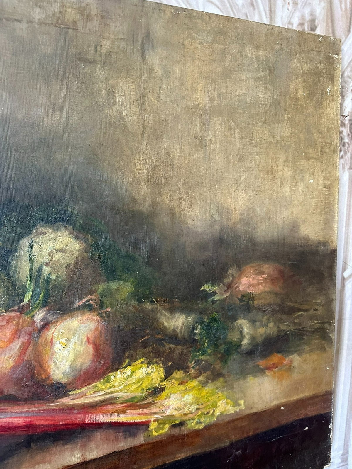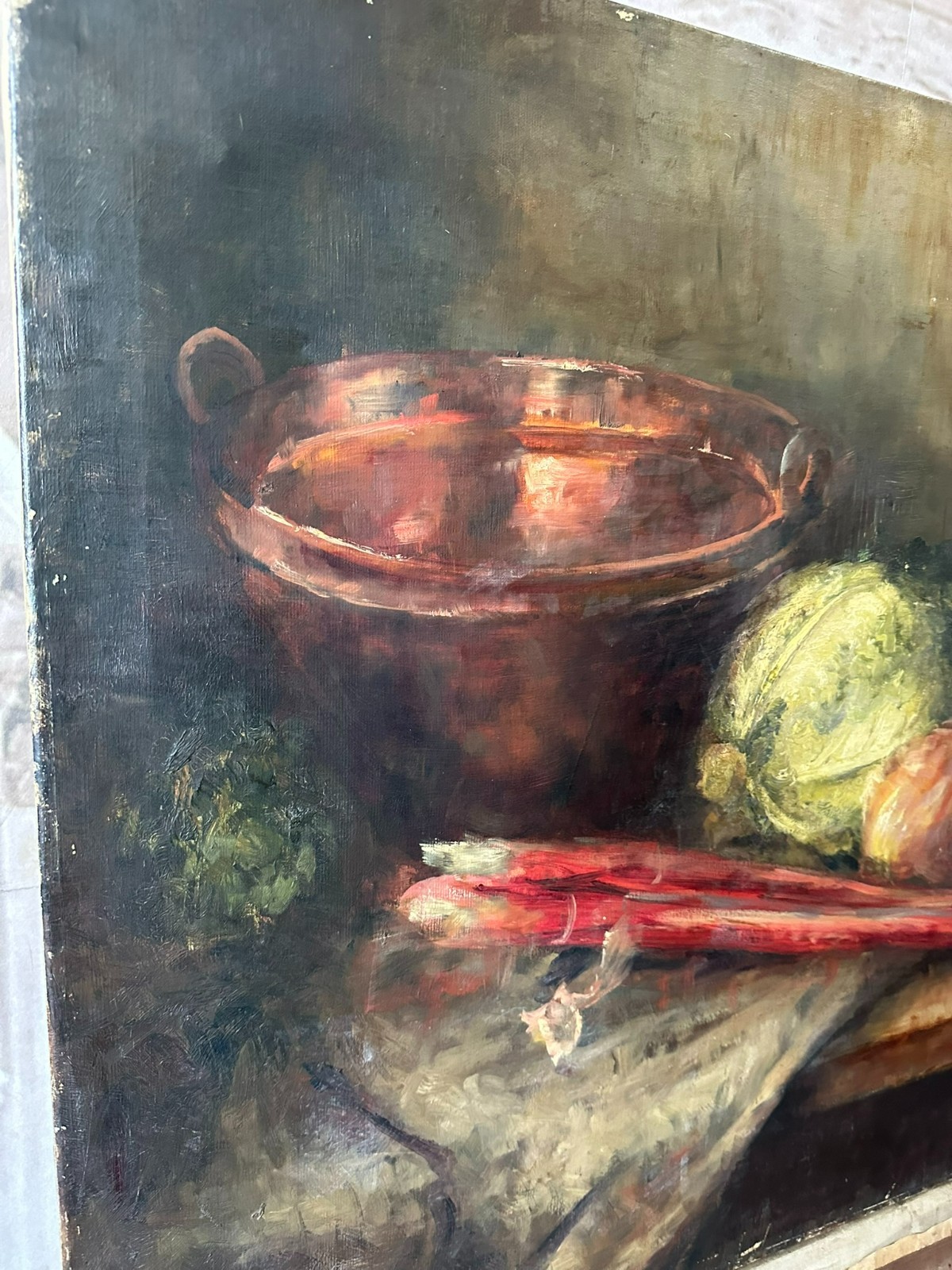 Altes Ölgemälde auf Leinwand, Stillleben mit Gemüse. Die gesamte Oberfläche mit Craquelle, schmutzig und vergilbt. Weiterhin an der gesamten Oberfläche Farbabplatzer. Das Gemälde wurde bereits mal restauriert und dabei auf Leinwand doubliert. Abmessungen 110x77cm.