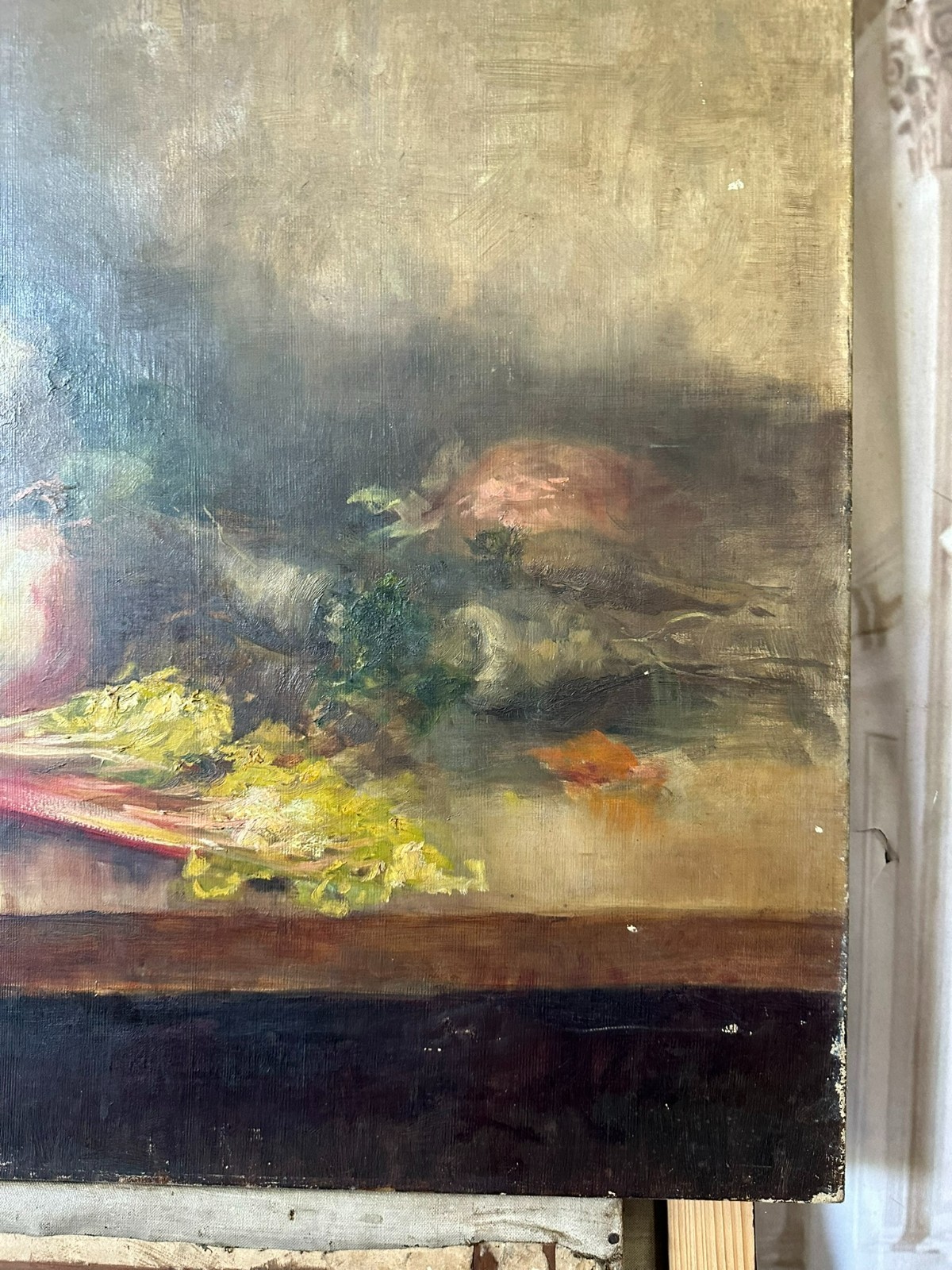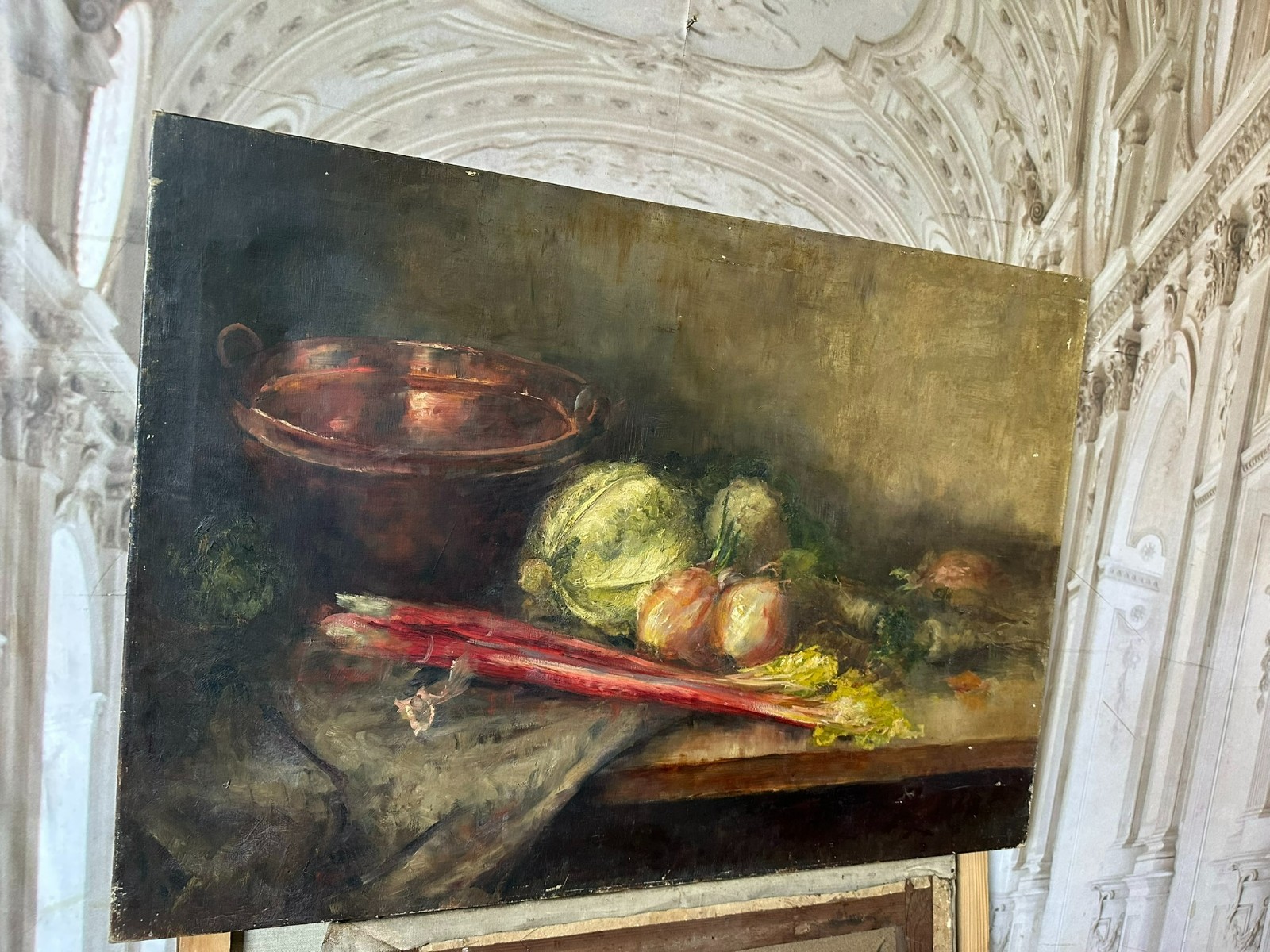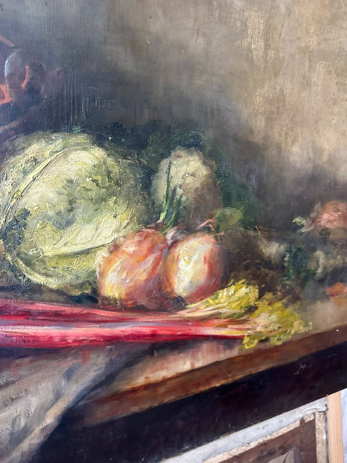 Altes Ölgemälde auf Leinwand, Stillleben mit Gemüse. Die gesamte Oberfläche mit Craquelle, schmutzig und vergilbt. Weiterhin an der gesamten Oberfläche Farbabplatzer. Das Gemälde wurde bereits mal restauriert und dabei auf Leinwand doubliert. Abmessungen 110x77cm.